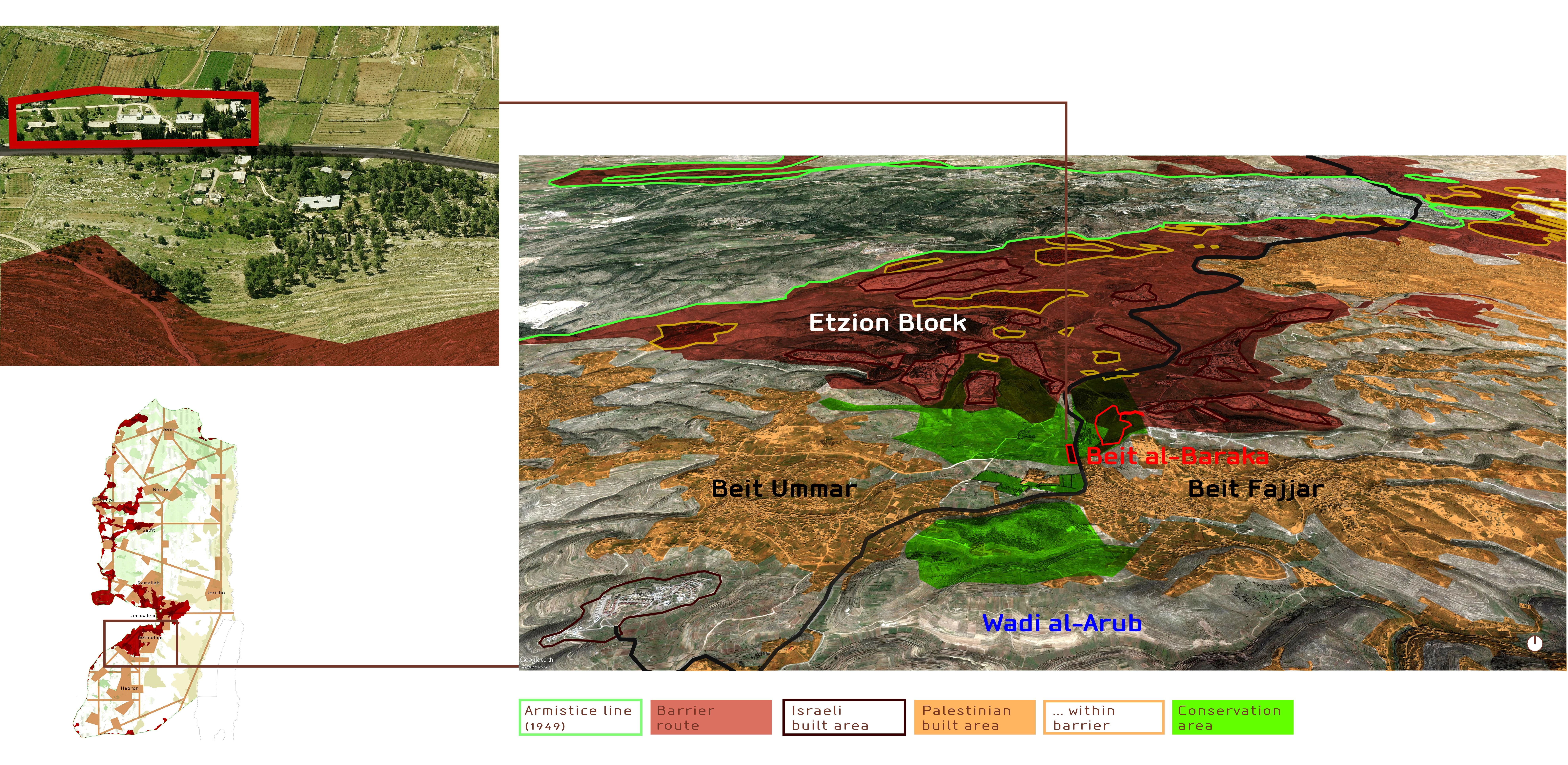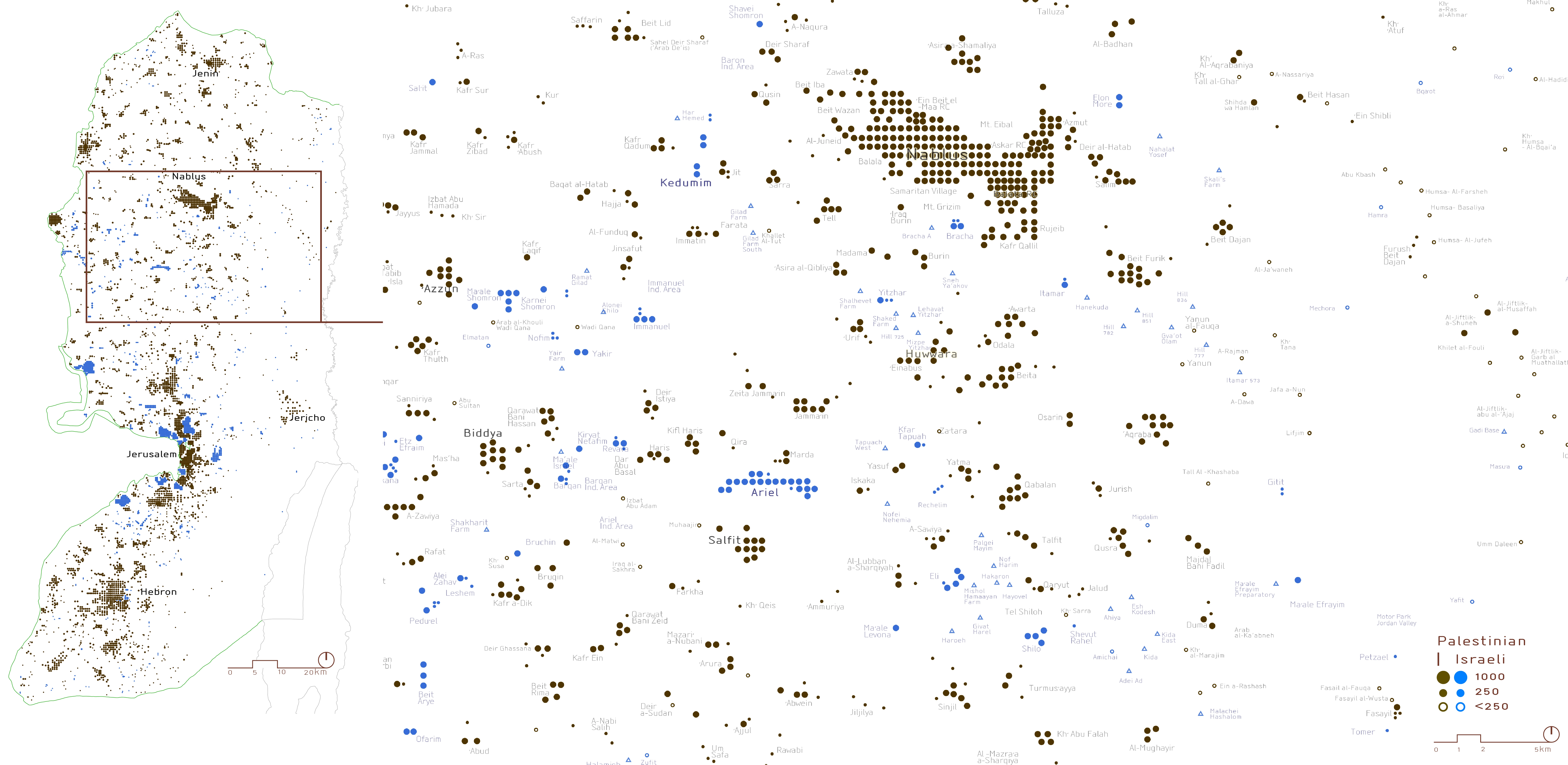 The research combines unique inter-disciplinary data, some of it made publicly accessible for the first time, especially at this level of detail. In addition, important layers of data have been assembled specifically for this project. For example, all Palestinian localities were re-mapped. It involved a tailor-made re-definition of aggregation and delineation functions of buildup areas, due the integrative rural-urban characteristics of the region. The gradual change of density from city-centre to small farms and Bedouin camps, required decisions on the delineation of edges and continuities of buildup polygons. This is extremely controversial because each side of the conflict wishes to show as much spatial continuity as possible. The research and data collection combined hi-res aerials analysis together with regular field trips, as the area constantly changes. Many developments are "under the radar" of public planning permits and publications. More than once our own data collection "discovered" new developments not previously known to government offices or ngos.