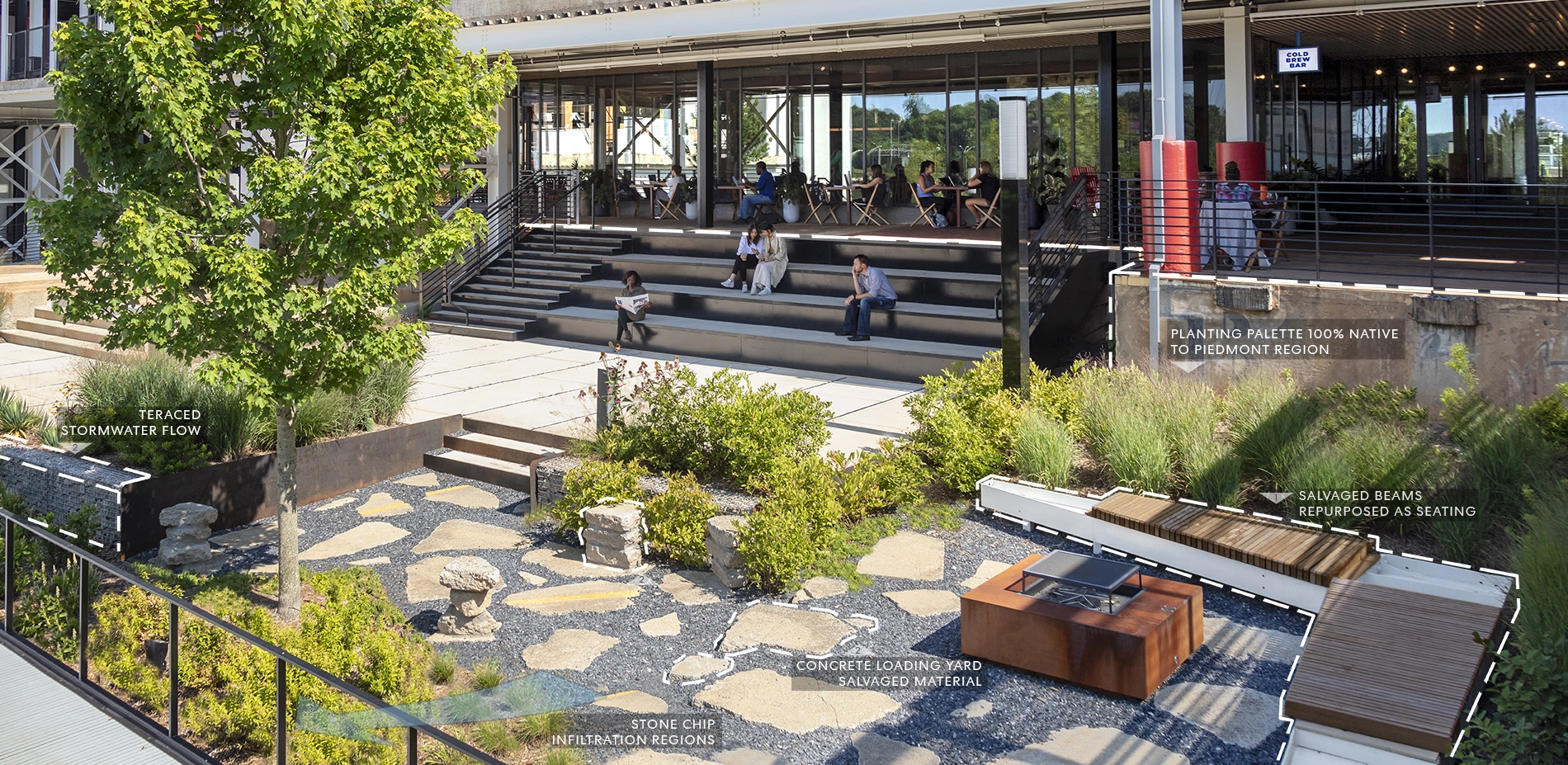 Sustainability, a priority from the outset, led to early microclimate testing, the inclusion of locally sourced pollinator species, and abundant absorbent surfaces that manage stormwater runoff from entering the critical watershed. A complex planting palette, comprised of more than 70 native species, provides an ever-changing and abundant display of regional flora along meandering paths, within secluded nooks, and, most transformational, upon vertical architectural facades. Multidisciplinary collaboration informed design decisions to ensure habitable spaces were tempered from the region’s intense sunlight and high-speed winds.