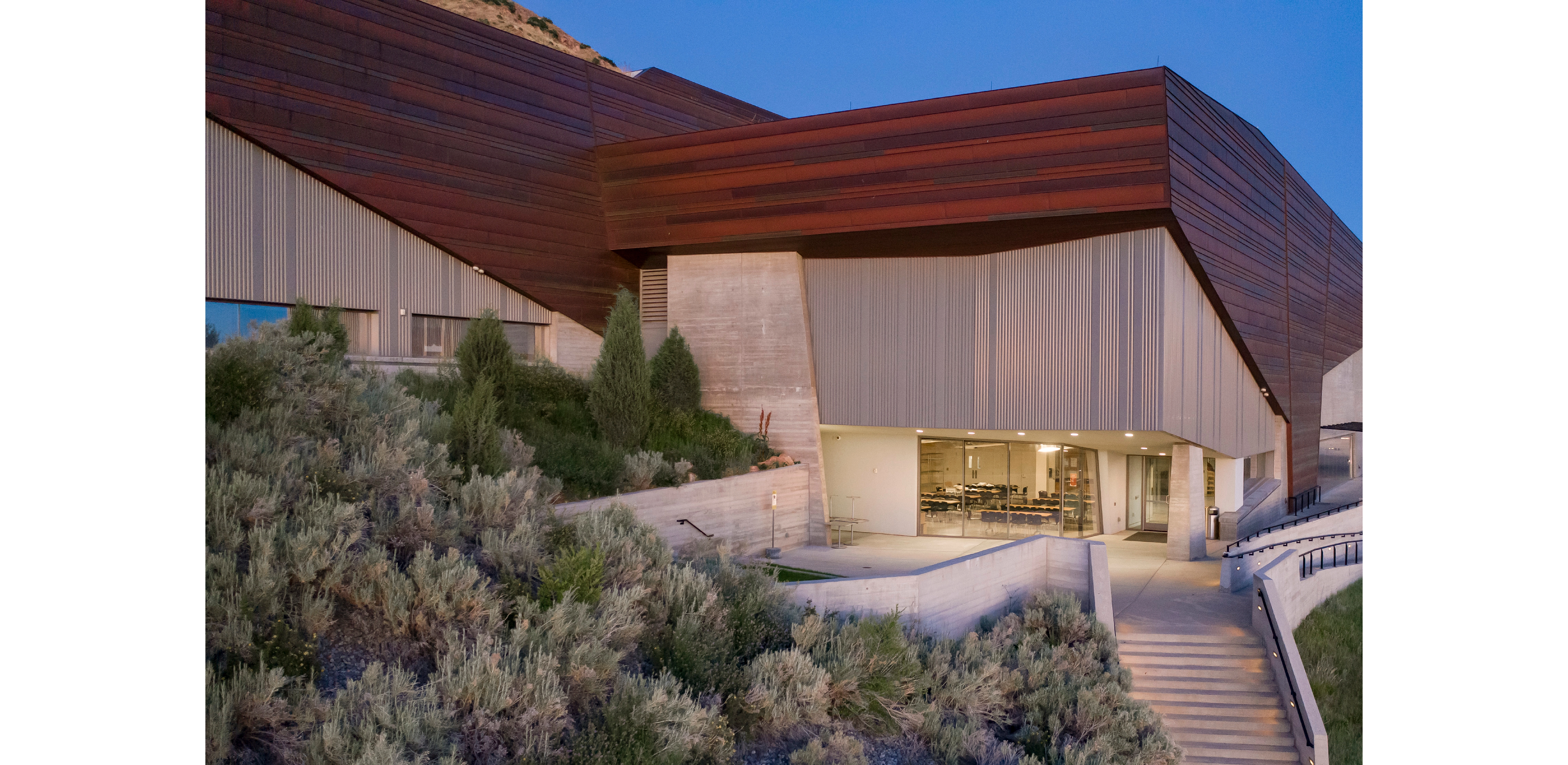 -- Responsible energy strategies reduce the site’s consumptive footprint. The Museum houses one of Utah’s largest solar panel installations; the use of light concrete pavement and green roofs lowers temperatures, improving the surrounding environment and air quality; and, dark sky-compliant lighting minimizes light pollution impacts on nearby sensitive habitats