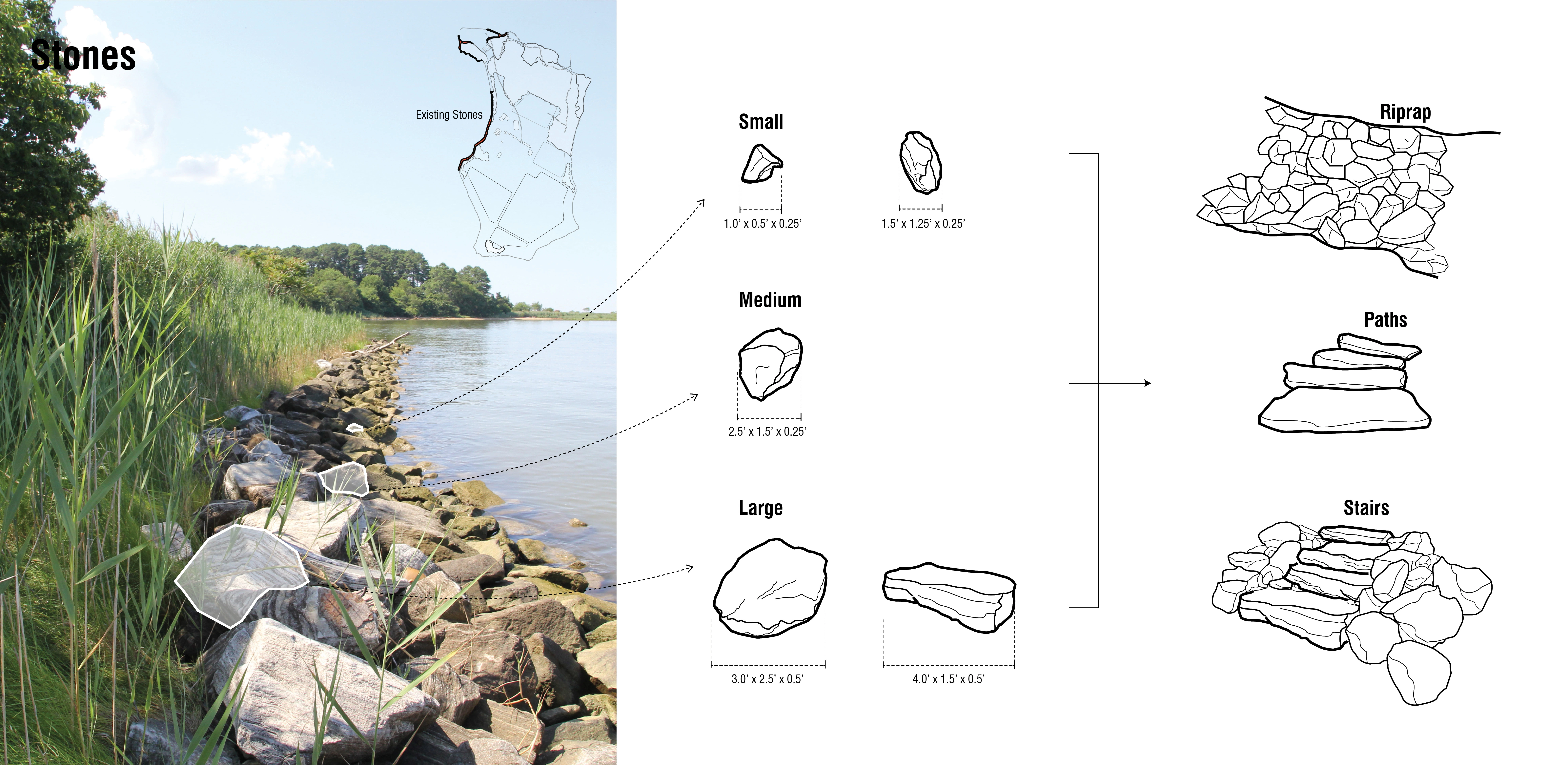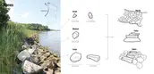 The Parsons Island Conservation and Regeneration Plan thus prioritizes the use and simple reconfiguration of existing local materials to achieve desirable outcomes that are contextually-relevant, cost effective, modular, and scalable. This approach focuses on three primary material types found on or adjacent to Parsons Island – sticks, stones, and sediments. Fallen trees including trunks, roots wads, and branches that have succumbed to wind and wave driven erosion will be relocated and reconfigured as ‘sylvan sills’ serving as wave attenuating and sediment catching features that also provide new aquatic habitat in the nearshore of the northern portion of the island adjacent to the existing stand of forest habitat and wetlands where wave energy and erosive forces are at their lowest. This stick strategy includes two types of ‘sylvan sills’ – log jams for the more highly eroded stretches of forested shoreline and fascines for the interface between wetlands and water. Along the southwestern shoreline where high intensity waves and erosion have exposed the islands pre-native artifacts for discovery, a stone strategy includes riprap, both repurposed and introduced, that will provide not only coastal protection, but also opportunities for accessibility and habitat enhancements via stone stairs and textured planting pockets. Riprap and engineered ecoblocks will also be combined to create a living breakwater in the offshore environment that aims to protect the island from continued erosion while preserving the visibility of its cultural resources and creating opportunities for public education and interpretation. Parsons’ sediment strategy will leverage dredged material from the nearby Kent Narrows waterway, which must be excavated every three years to maintain navigable depths at the expense of state taxpayers because it is not a high-volume shipping channel eligible for large federal funding. Repurposing this sediment to regenerate a portion of the island’s original footprint including new mudflats, SAV beds, tidal marshes, and island forest will nearly double the total acreage of habitat at Parsons from 78 acres to 145 acres, provide enhanced coastal resilience for land leeward of the island in Eastern Bay, and offer a cost-effective way to manage local sediment balances in the larger basin.