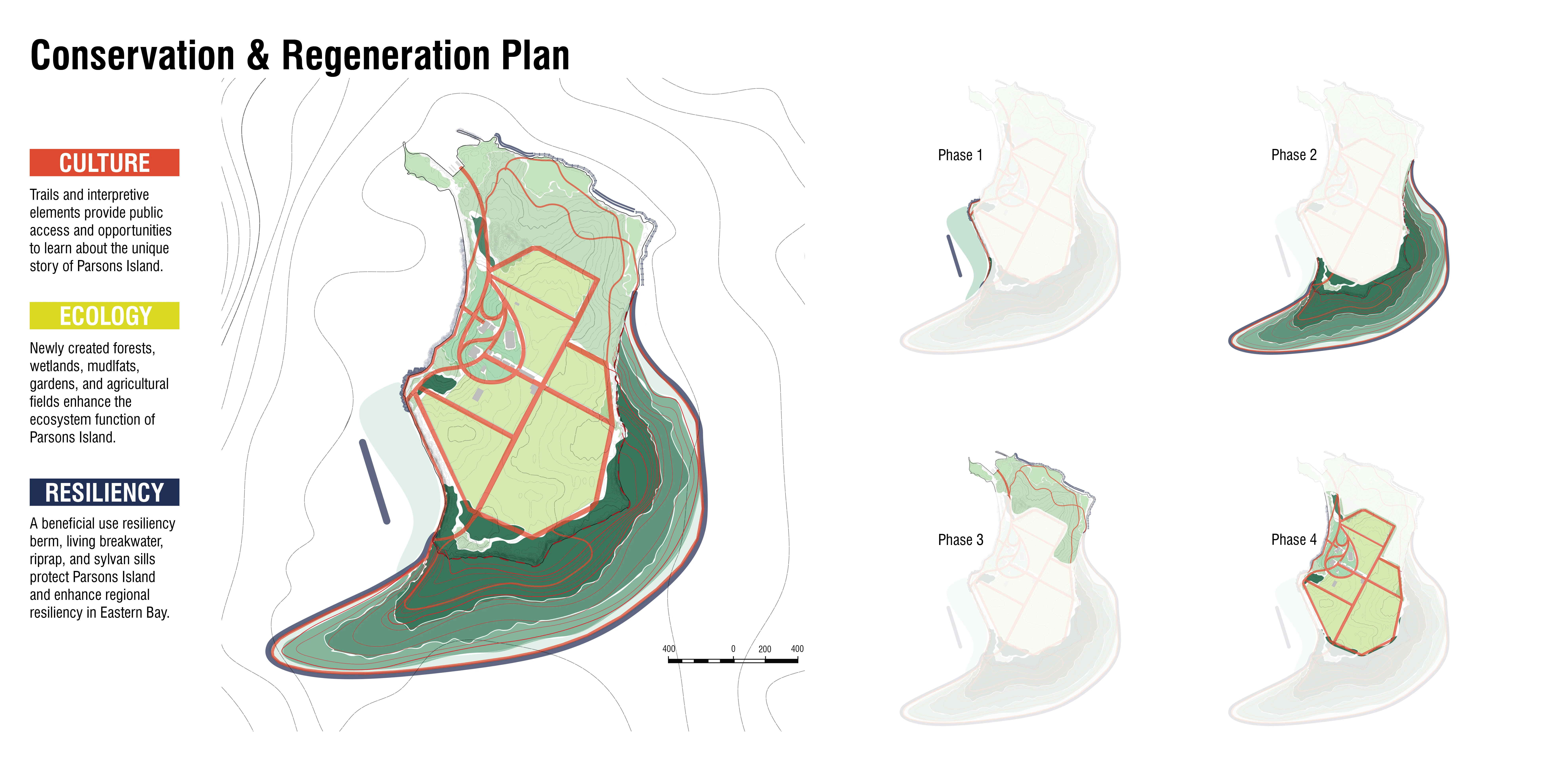 The ambitious and collaborative Parsons Island Conservation and Regeneration Plan presents a generational opportunity to ensure the island’s priceless cultural artifacts, vital habitats, and essential landscape infrastructure benefit the public in perpetuity. The importance of these features and the consequences of doing nothing have catalyzed an evolving and growing group of conservationists, researchers, designers, engineers, and government agencies who are working together with the property owners of Parsons Island to advance the plan incrementally and establish new partnerships for collective action. Plan implementation is anticipated to occur in parallel phases with simultaneous actions and asynchronous outcomes influenced by regulatory, financing, and technical drivers. The Parsons Island Conservation and Regeneration Plan lays a groundwork of possibilities by collaboratively navigating the complex ecological, economic and regulatory context of the bay and setting an example for what could (and perhaps should) be done with the dwindling number of small, yet valuable, islands in the region. -