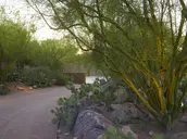In this central zone, the client desired a low water use eclectic plant palette of unique sculptural cacti & succulents such as rare Boojum trees Fouquieria columnaris, Cereus Peruvianus ‘monstrosis’ var. major 4, and Octopus Cacti Stenocereus alamosensis. These cacti gallery gardens have become great conversation pieces complementing the sculptural quality of the house. The axial amenity spine (Ghost Wash) terminates at the guest house and pool near the base of the slope. The perimeter of the property was restored, re-vegetated and enhanced to seamlessly blend into the surrounding flora of Camelback Mountain and is largely populated by species native to the Sonoran Desert creating a resilient landscape that can withstand overtime on little to no water. Between the two restored perimeter washes, opposite the open space, the landscape takes it cue from the native washes where the wildflowers bloom with the extra water harvested from the site. Granite paths with rock salvaged from the site wind between the sculptural Bosque of Ironwood trees and an understory of masses of desert wildflowers and cacti providing an additional buffer from the street thus, anchoring the site.