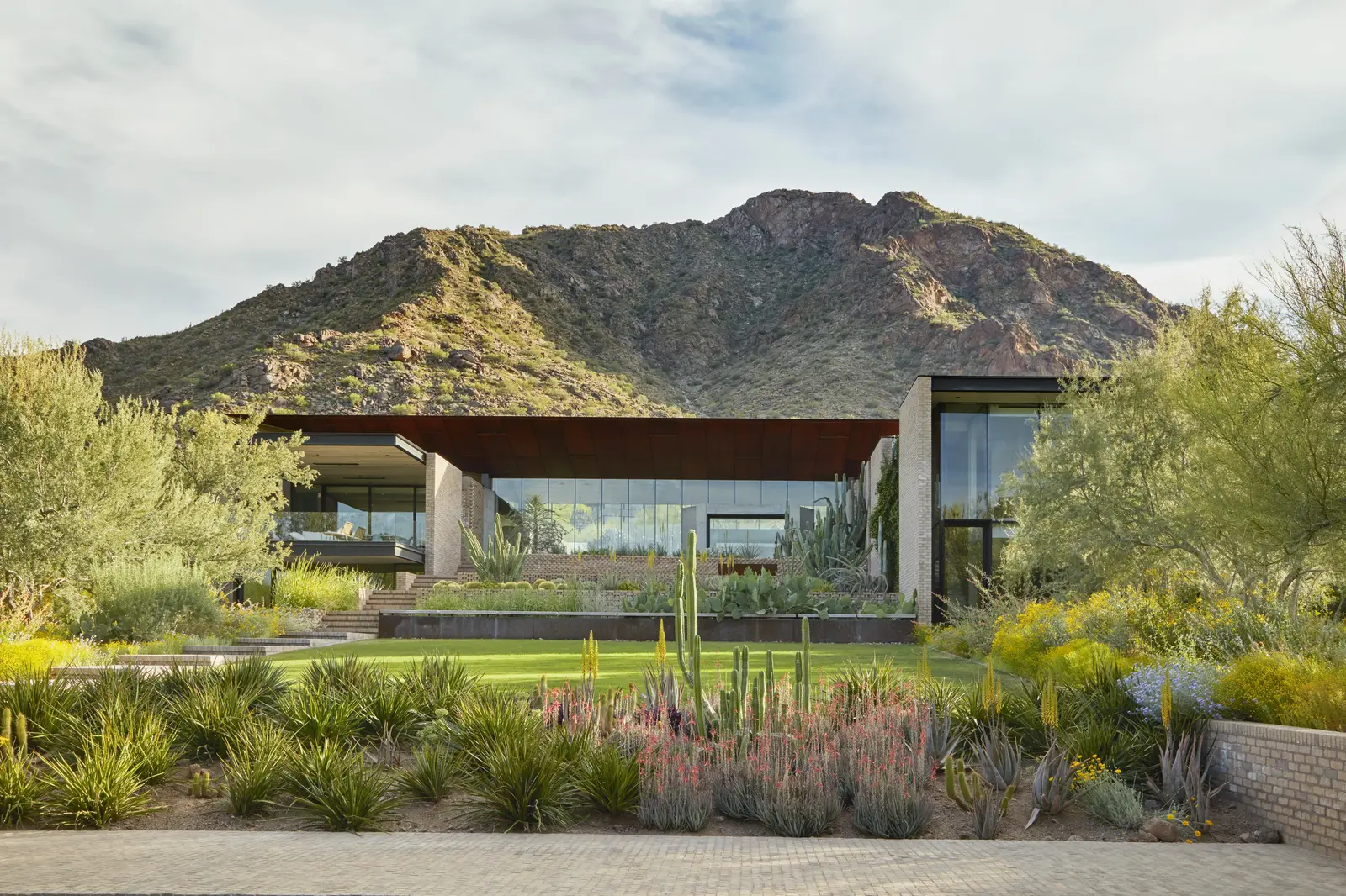 In the arid climate of Arizona, beside Camelback Mountain, a 2.5-acre Paradise Valley residence replaces water-intensive turf groundcover with a more sustainable plant palette of native cacti, grasses, and wildflowers. Designed as a series of terraces, the landscape unwinds down the site’s 37-foot drop in elevation as a series of distinct garden galleries, culminating in a rainwater catchment cistern that irrigates the small remaining turf parcel. Here, the landscape architect aimed to set new precedents that balance client desire with xeric landscapes to promote more sustainable practices in the Sonoran Desert and beyond.