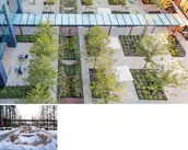 The design incorporates geometric and organic forms, native/adaptive plants, and local, sustainable building materials. Functional and sustainable green infrastructure includes a rain garden, detention ponds, and a large bioswale that overflows into a dry creek. Thoughtful placement of trees reduces street noise and the additional 333 trees sequester approximately 40,000 pounds of carbon annually. The jury called it a “truly remarkable articulation of space at numerous human scales with formal and informal geometries.”