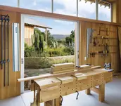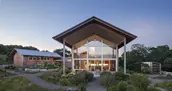 Reflecting the client's artistic interests, a sculptural planting bed of rough-hewn stone frames an extensive succulent collection in the central courtyard. An insulating roof garden of native grasses and wildflowers blends the shed-style architecture to the site. The jury called it a remarkable mix of conservation, design, and horticulture as a transition from meadows to woodlands.