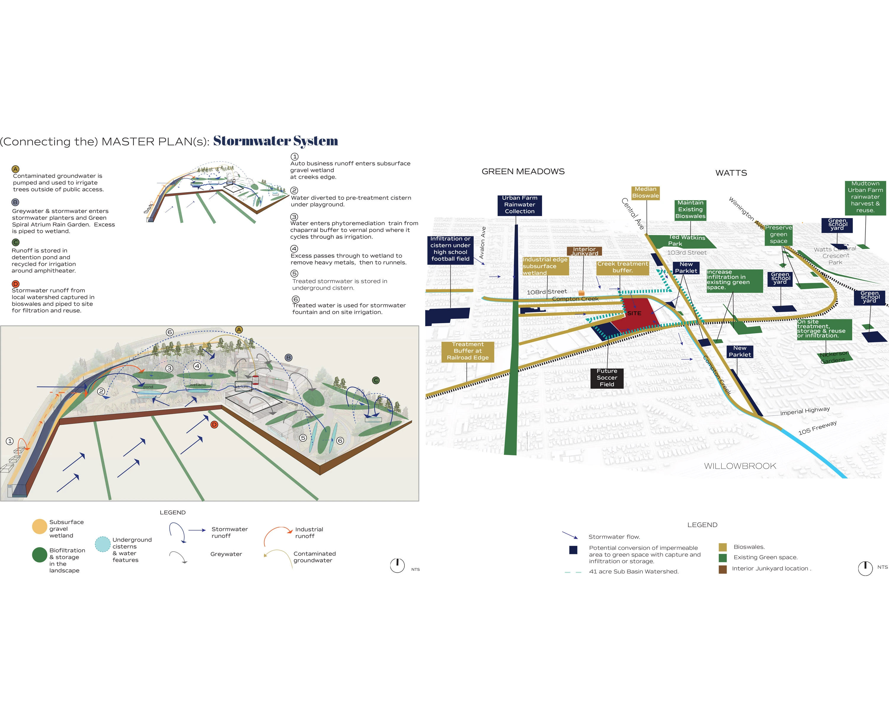 The soil of the Lanzit Site has been remediated yet a groundwater contamination plume with an undetermined spread still remains. Ongoing pollution from the nearby junkyard railroad and locally-owned auto shops on the edge of Compton Creek are also potential point pollution sources, according to The Lanzit Sites 23021 Semi-Annual Groundwater Monitoring Report. The Stormwater Center of Excellence would include a closed-loop, holistic watershed plan to intertwine stormwater capture within the local watershed, phytoremediation at the edges of the auto businesses and railroad, and water reuse in the landscape. The site offers a space for the university partners of the Better Watts Initiative to collaborate with the community in the research and development of groundwater and stormwater treatment. The phytoremediation chain also visibly demonstrates the cleansing process and defines the campus circulation system.