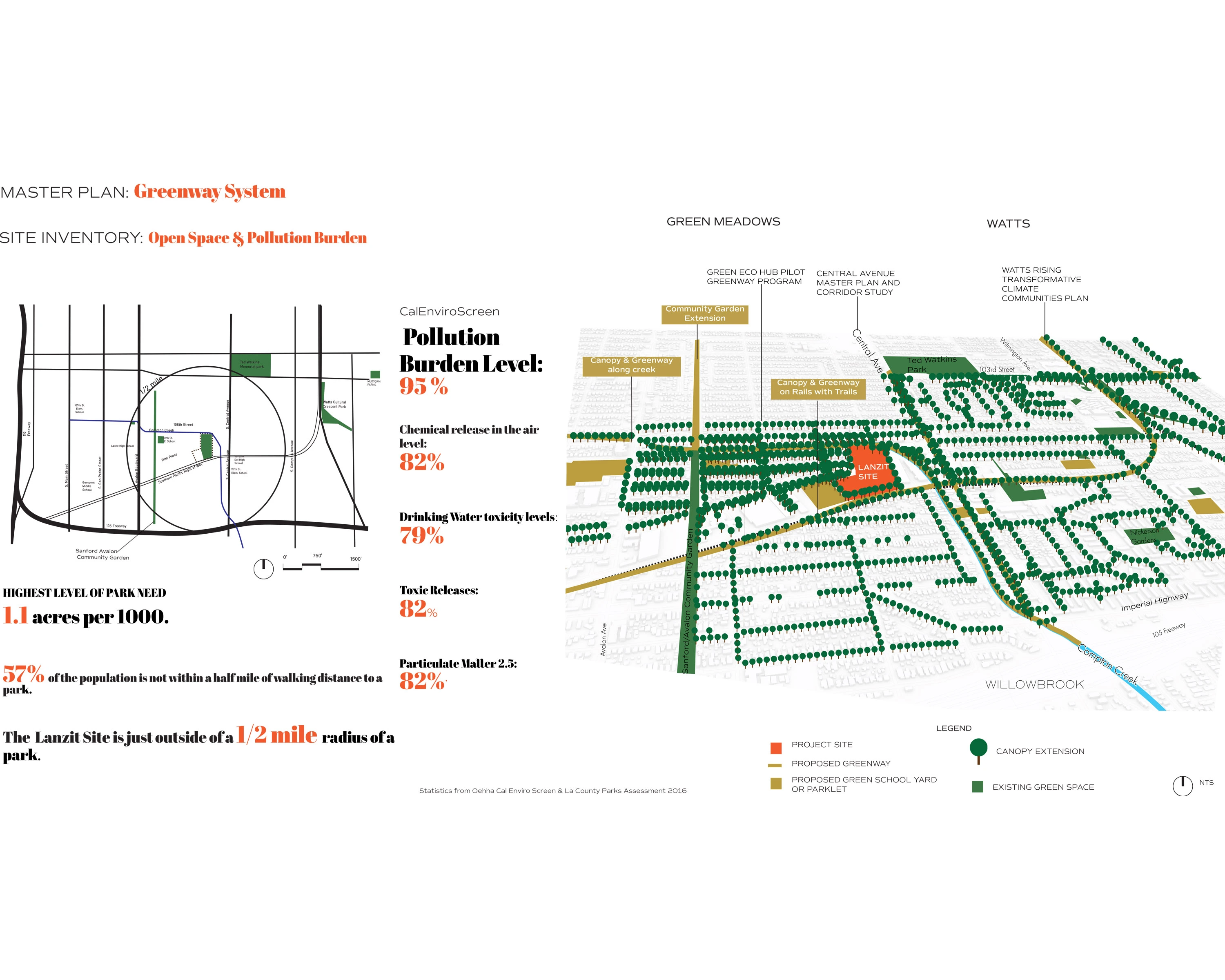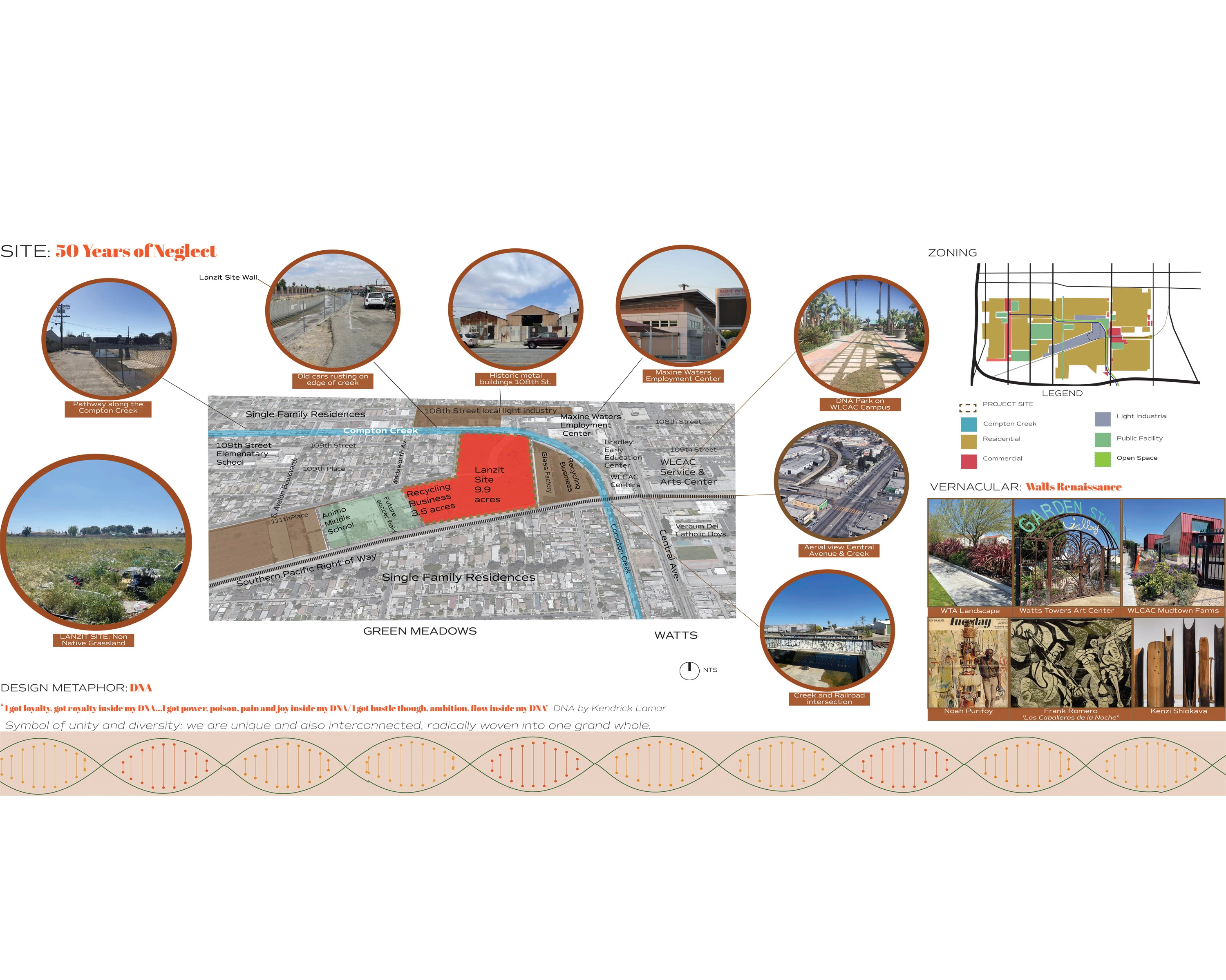 The project site is a former Cal Trans maintenance yard, the Lanzit Site, that borders the South Pacific Railroad Right of Way and the Compton Creek. The project incorporates the 9-acre Lanzit Site and an adjacent 4-acre junkyard. It is located at a crucial point along the impaired Compton Creek within the neighborhood of Green Meadows at the border of Watts. This part of the Compton Creek is not included in the LA River Master Plan, in spite of the local industrial impact on the health of the creek and the neighborhoods' critical need for connection and nature immersion. It is within walking distance of local schools and young people who deserve to decide the future they would like to steer towards. It is a tabula rasa that has the potential to support a mosaic of programs that bring diverse people together to experiment with economic, social, and environmental models that are small enough to fail, thereby paving new pathways to success.