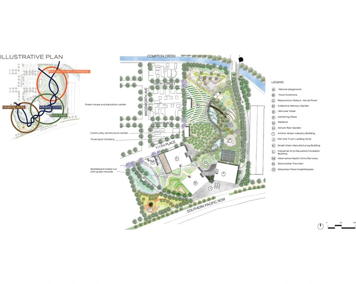 The project site is a former brownfield in South LA in two neighborhoods that have experienced the highest impacts of pollution, incarceration, and governmental neglect. The core program is a holistic, restorative commons embedded in a center of innovation and green industry with programs that intertwine to create new cycles of opportunities for economic self-reliance, well-being, and celebration of local art and culture. A highlight of the project is a Stormwater Center of Excellence where the multi-university collaborative Better Watts Initiative leads the community in phytotechnology research to address point and non-point pollution of the Compton Creek, the site's contaminated groundwater plume, as well as addressing lead contamination of the drinking water.