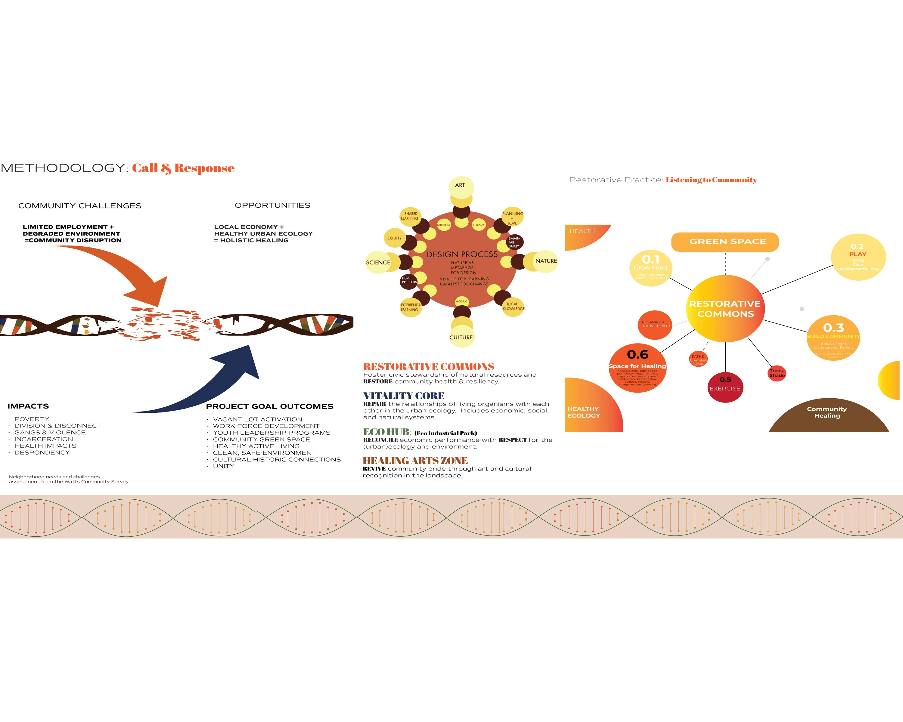 All of the restorative commons programs and goals are direct reflections of local wisdom and voices around the integrity of the natural and built environment as well as the holistic well-being of the communities and individuals. The site is organized around 4 zones that represent the goals of the project: the Restorative Commons, the Vitality Core, the Green Economic Hub, and the Healing Art Zone. These zones are interlinked by a phytoremediation chain that is in the form of a double helix DNA Chain. It is symbolic of the intertwining of programs and people, past, present, and future, that together create new chains of sequences that lead to resilience and fulfilled potential.