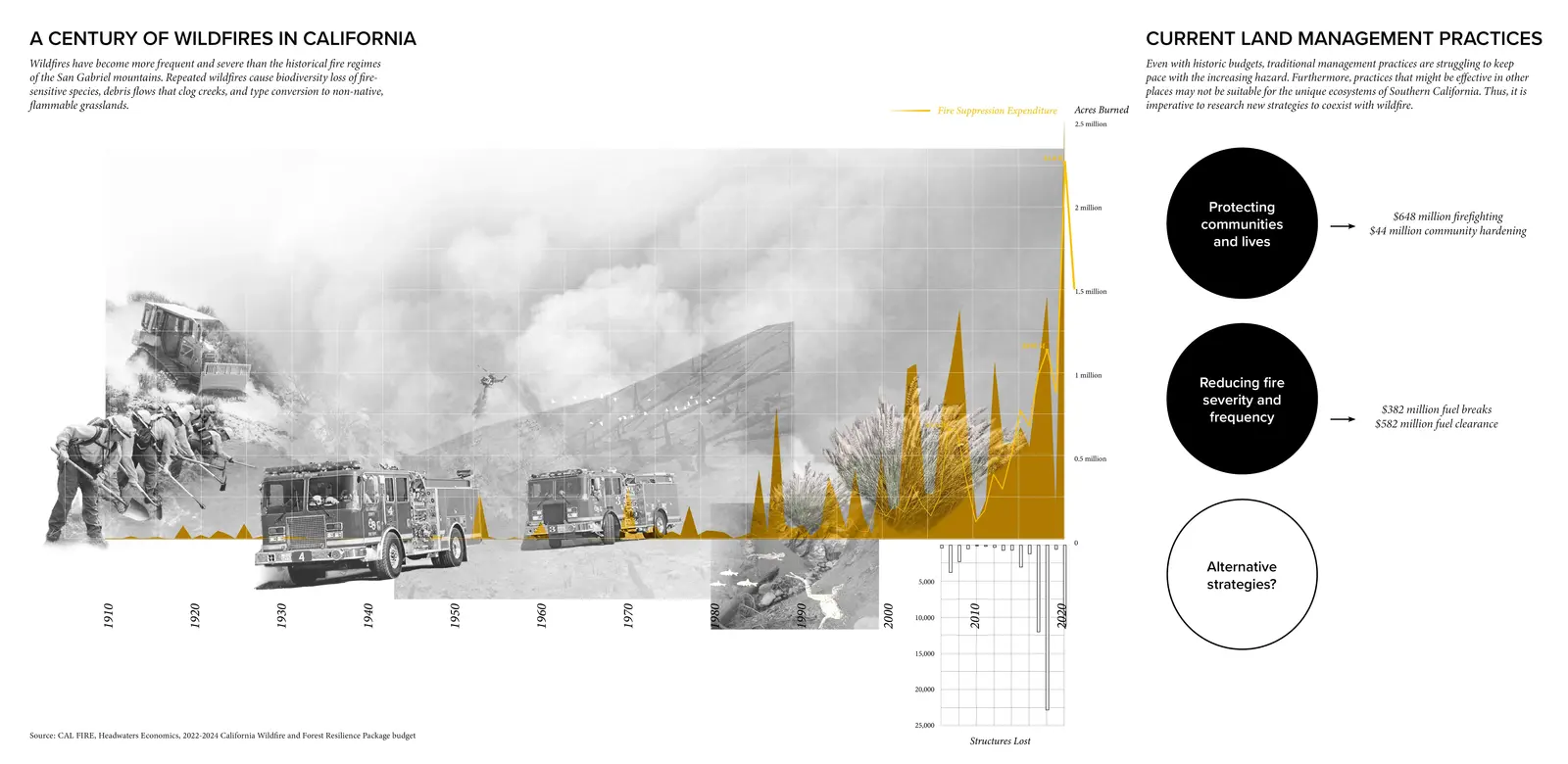 Rather than taking a typical anthropocentric or environmental approach to addressing the growing wildfire threats that come with climate change, this innovative project proposes that we learn from the adaptive survival skills of wildlife. With well-conceived and beautifully rendered diagrams and vignettes, the proposal clearly outlines the challenges and proposes solutions that seem equally innovative and achievable.