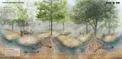 These animals’ adaptations to and relationships with wildfire inspired the goals of a new framework for coexisting with wildfire by catalyzing regeneration of habitats niches to support ecological resilience. Framework goals include increasing soil moisture (BEAVER), developing a mosaic of ecosystems (WOODPECKER), promoting dynamic stability (BEETLE), and supporting soil ecosystem services (GROUND SQUIRREL). We then developed interventions that reshape the land over time through natural processes, promote recovery and adaptation, and provide for wildlife. These interventions respond to local topography while strategically reusing "waste" materials produced by wildfire cycles and management.