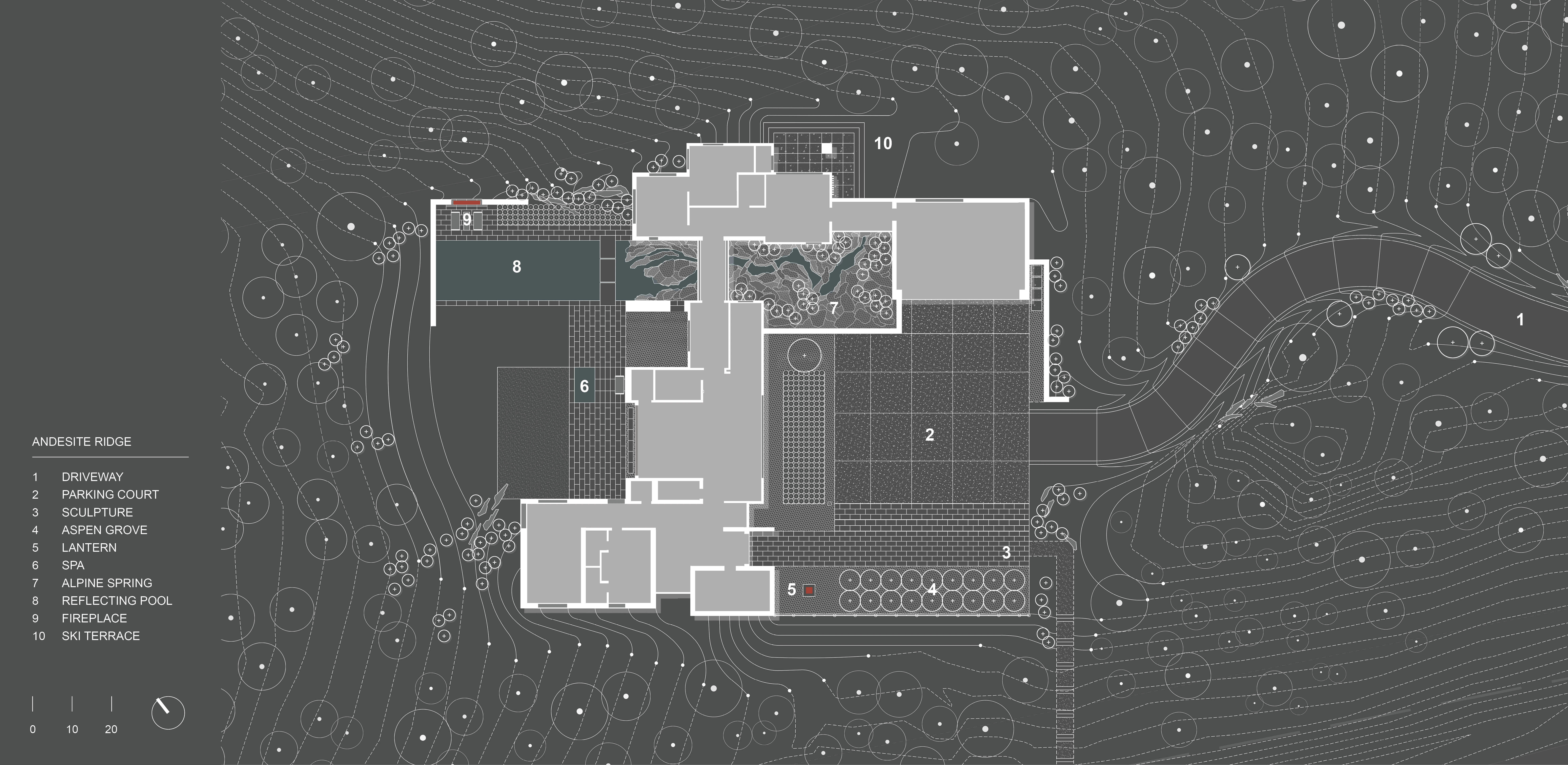 GEOMORPHOLOGY AS STORYTELLING Set on a sparse promontory overlooking Montana’s Madison Range, the 3.5-acre forested site rests within a dramatic landscape shaped by wind, fire, water, and ice. Evidence of such extreme natural forces are discoverable in the backcountry, where rock glaciers—piles of broken and weathered scree rock—scour mountainsides, piling debris in stream beds and alpine lakes. This unique phenomenon offers inspiration for Andesite Ridge, challenging the notion of contemporary landscape design in a rugged environment. INSPIRED BY PLACE Interested in protecting and enhancing the site’s vistas, night skies and wildlife habitat, the owners designed a contemporary mountain home, crisply executed with a nocturnal material palette that purposefully retreats into the coniferous forest. In response, landscape expressions are disciplined, limited to a narrative that extend the visual and functional relationship of the home into the landscape, connecting its inhabitants to the story of this place. PRESERVING THE INTEGRITY OF THE LAND The entry drive gracefully embraces the dramatic contours of the site, its artful maneuvering around mature pines and lichen-covered escarpments slowly revealing filtered views of the rugged mountains and home beyond. Upon arrival, a linear walk – composed of cut pavers and loosely placed native rock – extends from the home’s entry, sheltered by a tightly-spaced grove of quaking aspens that cast an ever-changing play of light and shadow upon the shou sugi ban walls of the home. TRANSCENDING ART AND FUNCTION Traversing beneath a glassy bridge linking public and private areas of the home, a stream—the central garden element that metaphorically abstracts and celebrates the ephemeral nature of snow-fed creeks and lakes as a performative art installation—accommodates onsite water harvesting, stormwater management and fire suppression needs. Emerging as a small spring, water spirits its way through broken rock fragments, creating an audible spectacle that permeates interior spaces. Craggy boulders, softened with pockets of creeping groundcover, appear intermittently, their organic jagged forms set in poetic contrast to architectural stone walls. Below, water diffuses across a rugged delta and into a plane of still water, reflecting adjacent meadowlands and theatrical skies. Recycled water, collected from spring meltwater and rainwater runoff, is stored in a series of underground, fire protection cisterns, and allowed to periodically recirculate – transforming a dry talus bed into a glassy surface in 30-minute intervals, and then drained to reduce evaporation. ENCOURAGING NATURAL PROCESSES The design realizes a commitment to protecting and enhancing the natural beauty of the site while addressing critical environmental issues facing the Northern Rockies, including forestry and wildfire management, water conservation and ecological disturbance. While avoiding impact to keystone species that offer high nutritional value as migratory habitats, aggressive clearing of deadfall introduces light and moisture to foster regeneration. Reconstructing 27,000 square feet requires irrigation only until establishment and mimics existing conditions with native grasses and wildflowers that complement the modern lines and tones of the architecture. Since construction, indigenous wildlife has returned with a robustness that belies the fragility of its alpine environment.