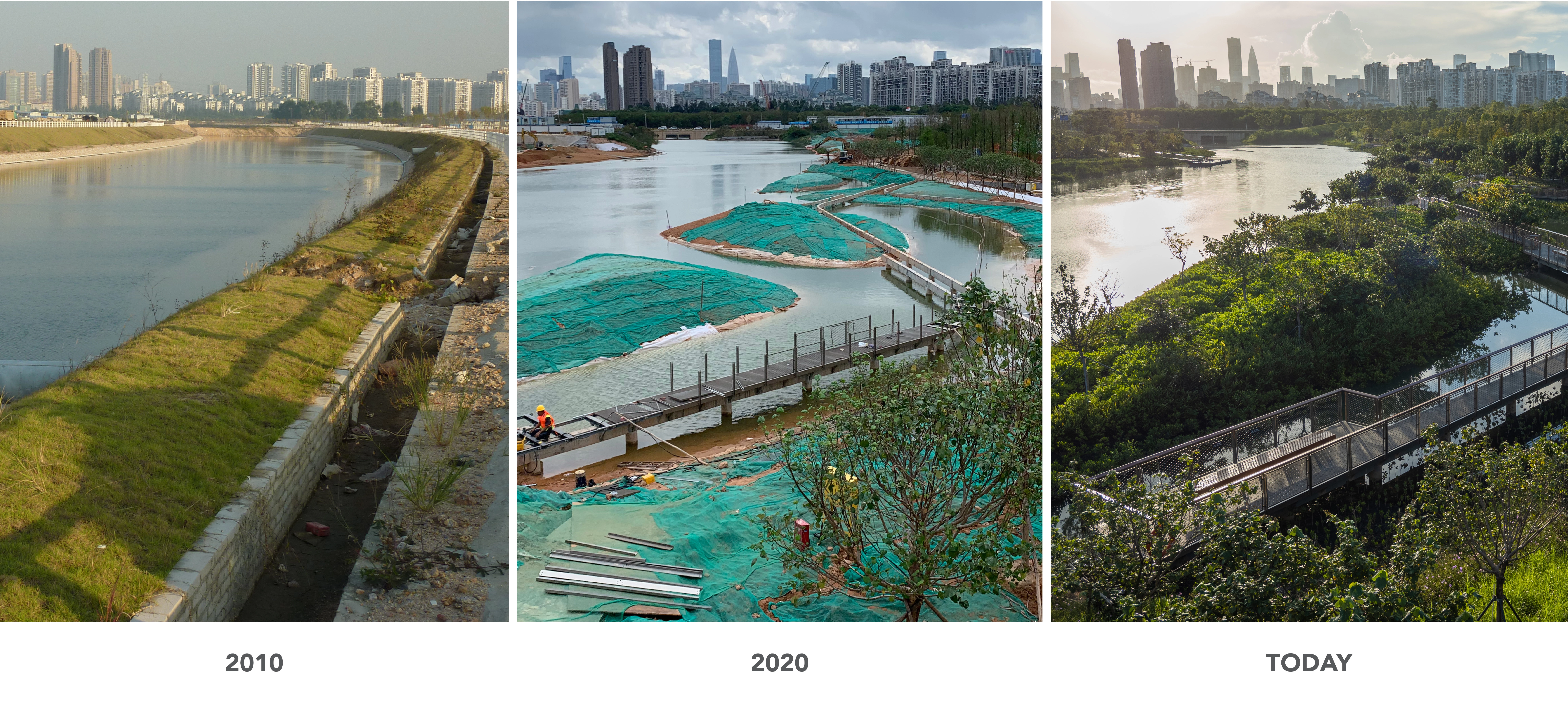 Qianhai Water City Qianhai Water City creates a new identity for a coastal city with five development districts defined by large green “water fingers” between neighborhoods. This framework outlines a strategy for a more resilient, ecological city. Guiwan Park is the first of five “water fingers” to be built in Qianhai. The park provides a one-of-a-kind amenity by integrating blue-green infrastructure with active and passive recreation, ecology, habitat and cultural programs, centered around a tidal channel that protects the city and inland area from flooding and improves water quality. As a central park, this large-scale open space is critical to the city’s needs as it develops. The 2.2-kilometer-long, 45-hectare park incorporates programming that caters to an urban context in the west and transitions as it becomes more residential in the east. By synchronizing a pedestrian network, canopy system, wetlands, the canal, and soft surfaces, Guiwan Park cultivates interaction between them, fostering an integrated ecosystem. Ecological Performance Guiwan Park’s three terraces—woodland, freshwater wetland, and saltwater wetland—accommodate a steep elevation change between the park’s main road, which sits at 6 meters above sea level, and the central channel water level, which varies from -1 to 2.0 meters. As part of China’s “sponge cities,” the park and its terraces absorb and treat rainwater, including water from the surrounding roads, capturing 90% of annual rainfall and reducing nonpoint source pollution by 72%. Guiwan Park utilizes low-impact development strategies for stormwater management, including grass and gravel swales along main pathways, rain gardens with a sunken greenbelt, and underground tanks for a rainwater filtration and reuse system. Biodiversity & Habitat Recovery Guiwan Park features a coastal and continuous topography that incorporates native subtropical plantings, including 51,000 sqm of mangroves that have expanded from 3 to 17 species. The park’s diverse living ground includes forests, bosques, lawns, freshwater wetlands, and saltwater wetlands that increase biodiversity and create new and unique habitat conditions. There has been a resulting re-emergence of many species native to the area, including herons, egrets, curlew, mudskippers, and crabs. Within the first year, the new wetlands have attracted 21 species of macrobenthos, contributing to a healthy marine ecosystem. Smart Park Guiwan Park incorporates technology that monitors soil, irrigation, insects, water levels, and tree conditions. This data is used by maintenance staff to support operations and monitor as the park’s species develop and mature. The same data has been used in partnerships with local institutions to better understand ecological restoration within urban environments, using Guiwan Park as a case study. In addition, an app for visitors allows them to navigate the park with a digital fly-through and learn more about its ecological benefits. Impact Guiwan Park sets a new benchmark, creating a vibrant park that blends design with ecological performance and social interaction. As coastal cities face the effects of climate change, Guiwan Park serves as an example of ecological rehabilitation on a damaged and reclaimed site, leading the way for a more resilient city that harnesses the impact of large-scale blue-green infrastructure while creating restorative open spaces.