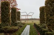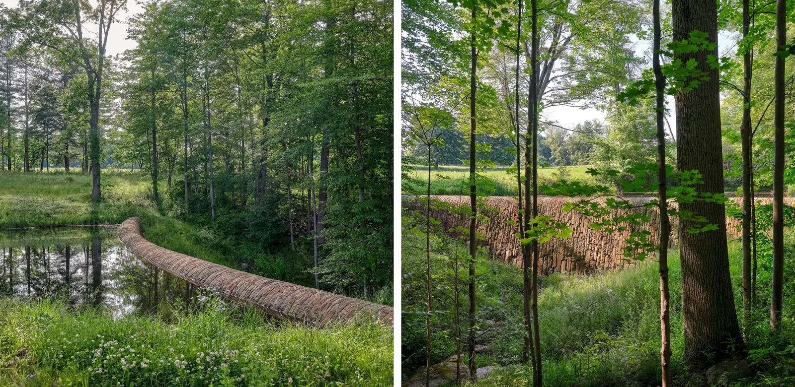 This 150-acre site once held a production orchard, which has since reverted to open meadow. The new owner and resident, an avid art collector, was drawn to the site’s potential for art experiences and improved ecological value. We encouraged the client to treat the new house as its own work of sculpture in a collection. Finding inspiration in Czech Cubism, the client proposed an exploration into the movement for house and garden. Through horticultural, material, and spatial means, we explored the prismatic qualities of Cubism across the garden precinct, from gate handle to pavers to planting design. Chief among these garden elements is the Ribbon Embankment, a sculptural landform that bounds the domestic precinct against the meadow below. Bands of amsonia, boxwood, spirea, and fragrant sumac create a series of faceted planes with strong seasonal character. The Ribbon defines level terraces around the house, including a kitchen garden and dining terrace, and frames the edge of the pool terrace. In the arrival garden, a birch walk created in homage to Warren Manning’s nearby Stan Hywett Hall, leads on one end to a belvedere overlooking the Pepper/Luce Creek; at the other Tom Friedman’s "Outdoor Open Box" frames meadow views. From the house, multiple itineraries lead to sculpture walks throughout the property. Ecological principles in support of the site’s flora and fauna guided our work beyond the residential precinct. An early ecological assessment identified areas of higher to lesser ecological potential, shaping restoration priorities as well as opportunities to site sculpture in disturbed areas and at the periphery of meadows to protect habitat for ground-nesting birds. We also used careful management strategies to control invasive species and reintroduce native warm-season grasses in the meadows. Additions of roads, trails, and installations of larger sculptures in the woodlands catalyzed restoration of woodland ecologies. We interpreted necessary improvements to water management infrastructure as an opportunity for a new pond near the house and a site-specific commission for Andy Goldsworthy’s "Stone Dam" at the historic farm pond. The incremental implementation of these projects maintained critical habitat during the transformation. An extensive network of trails through the woodlands and meadows visits highlights of the renewed ecology alongside works of contemporary sculpture. Several of the works are site-specific responses to our investigations, recommendations, and design work. We worked closely with the owner, artists, and contractor to site the works through design studies and full-scale mockups, managing installation logistics and choreographing each experience carefully. Many of the artworks live in garden rooms or groves within the woodlands, where plantings and paths guide interaction and contemplation. Examples include Xu Zhen’s "Corporate" (Thousand Arms) and a sequence of plates by Richard Serra that step down to the Pepper-Luce Creek from the house’s domestic precinct. We developed a management and maintenance plan for the owners, who intend to guide the landscape to maturity over the next decades while expanding their collection and improving accessibility. The team is preparing the site with its living and sculptural collections as an endowed gift to an internationally renowned arts institution, where conversations between art and ecology will continue in the form of a public sculpture park.