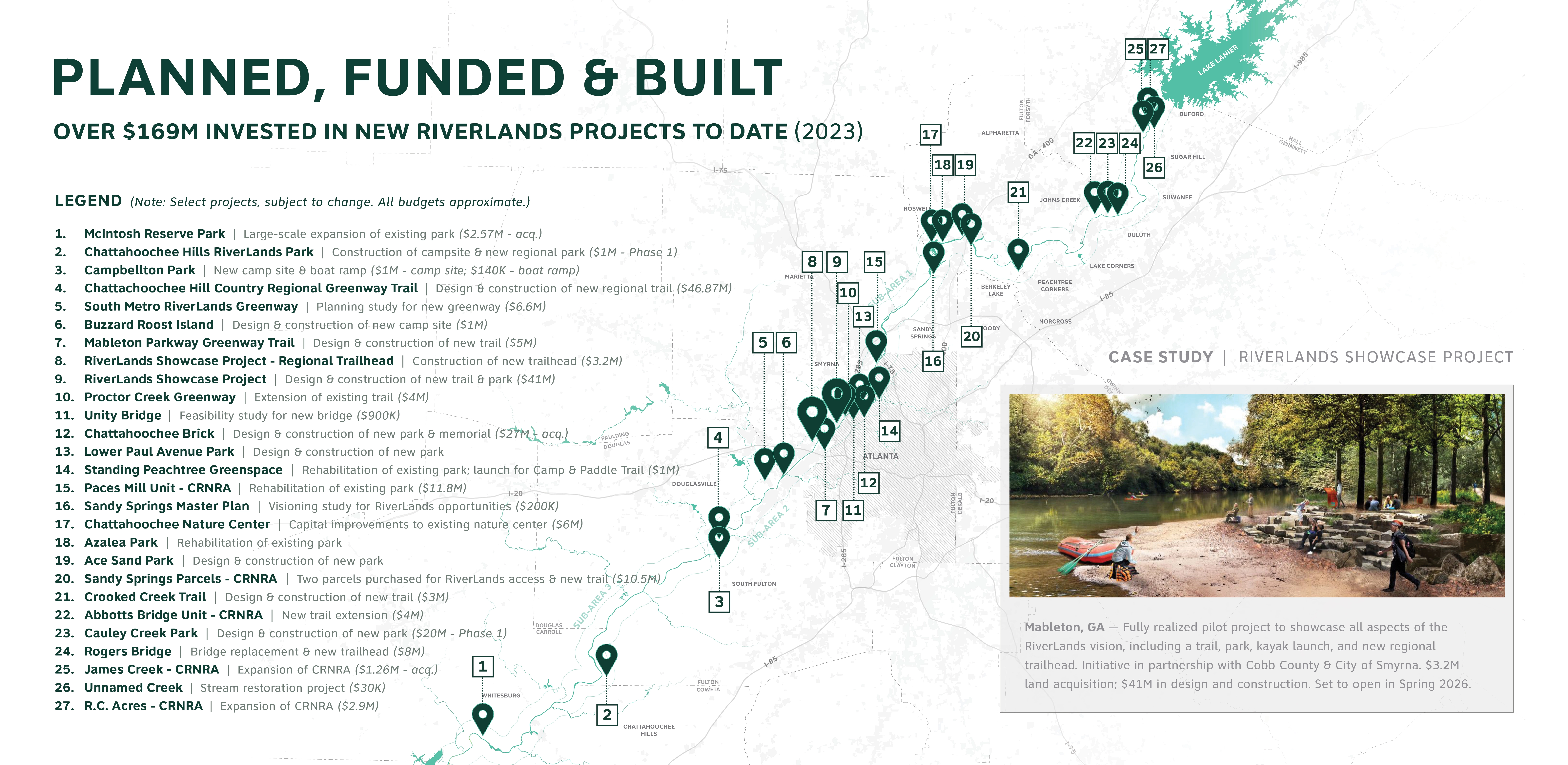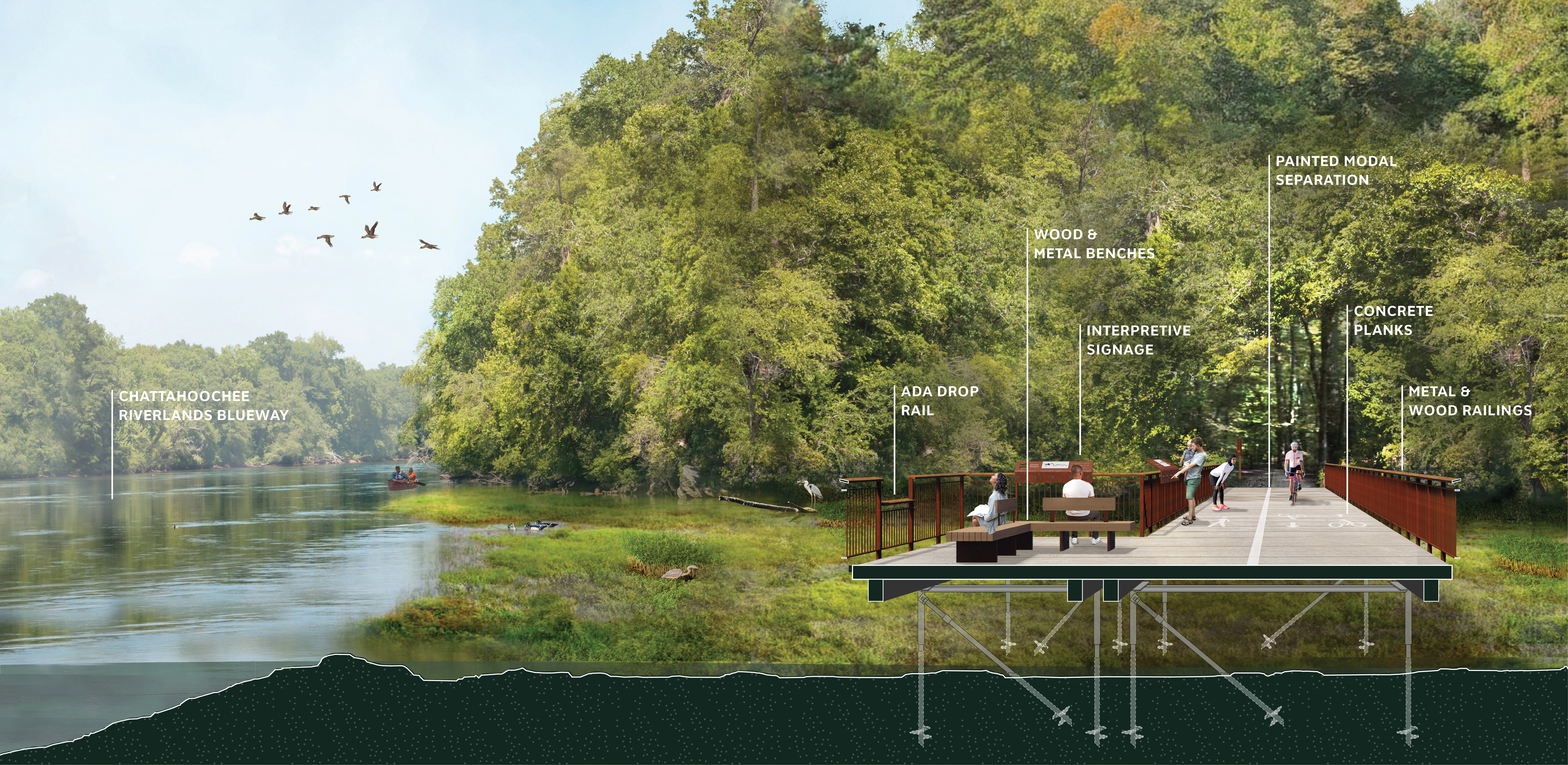 Building on over 50 years of grassroots planning, the Chattahoochee RiverLands is a generational vision for a 125-mile greenway, blueway, and network of open spaces reconnecting over 1 million residents with the Chattahoochee River across the Metro Atlanta Region. Developed over two years and underpinned by a tremendous engagement effort encompassing over a hundred meetings with more than 290 local groups, the vision stitches together open spaces into an uninterrupted multi-modal trail—expanding connectivity and economic development opportunities in West Atlanta communities that have historically lacked access to the river. Already, the vision has spurred over $169 million in investment and inspired state and federal policy initiatives.