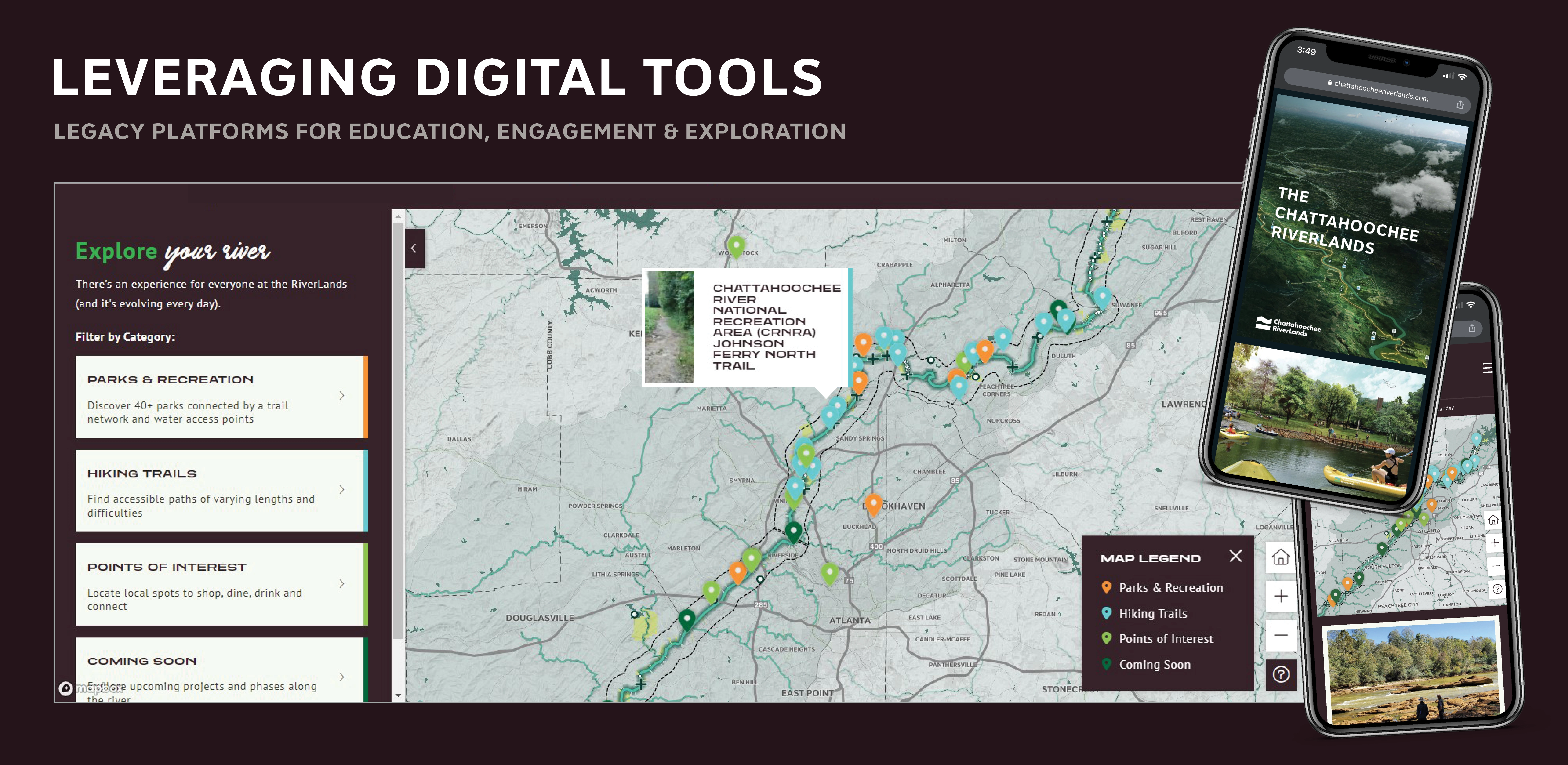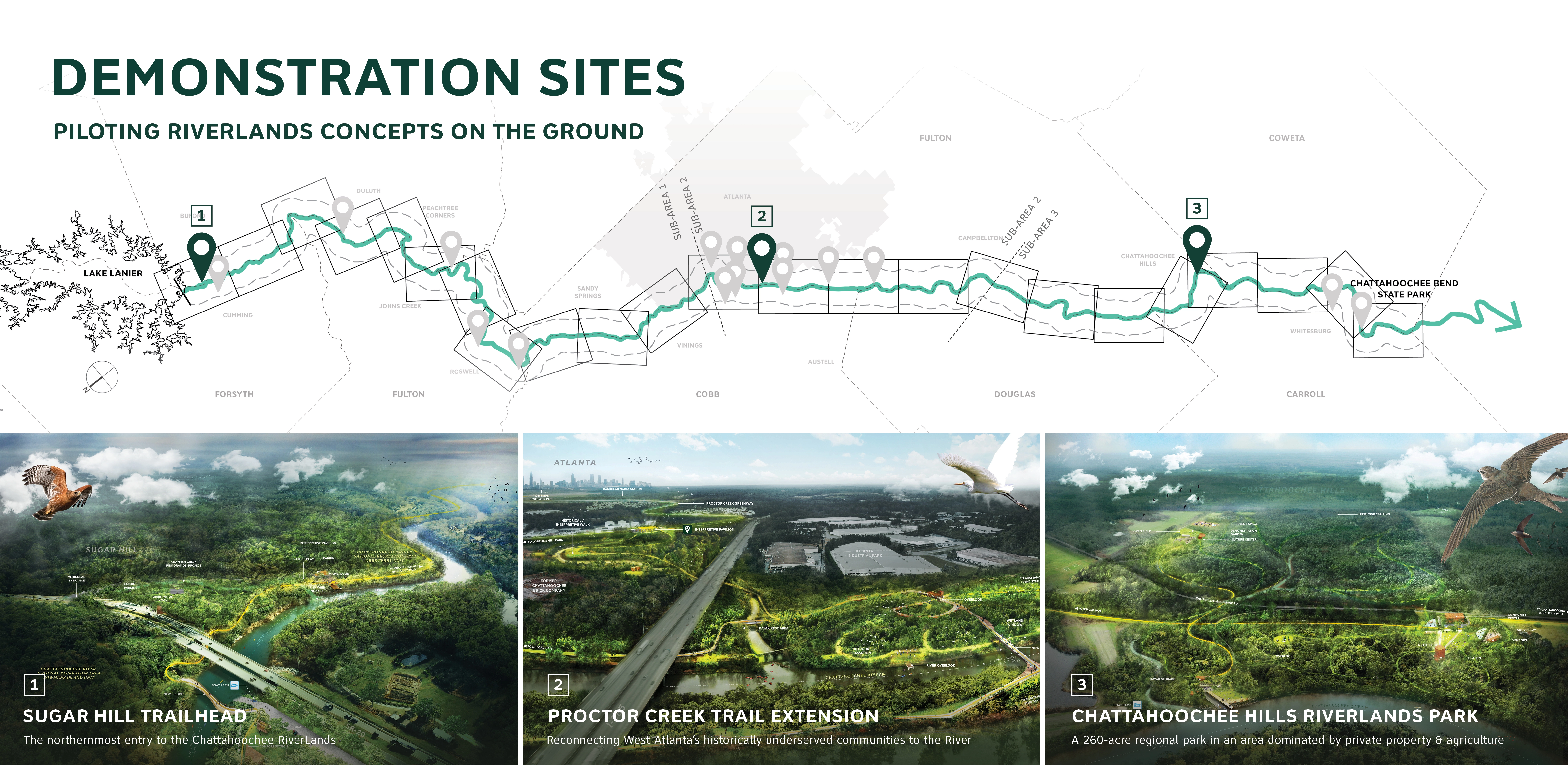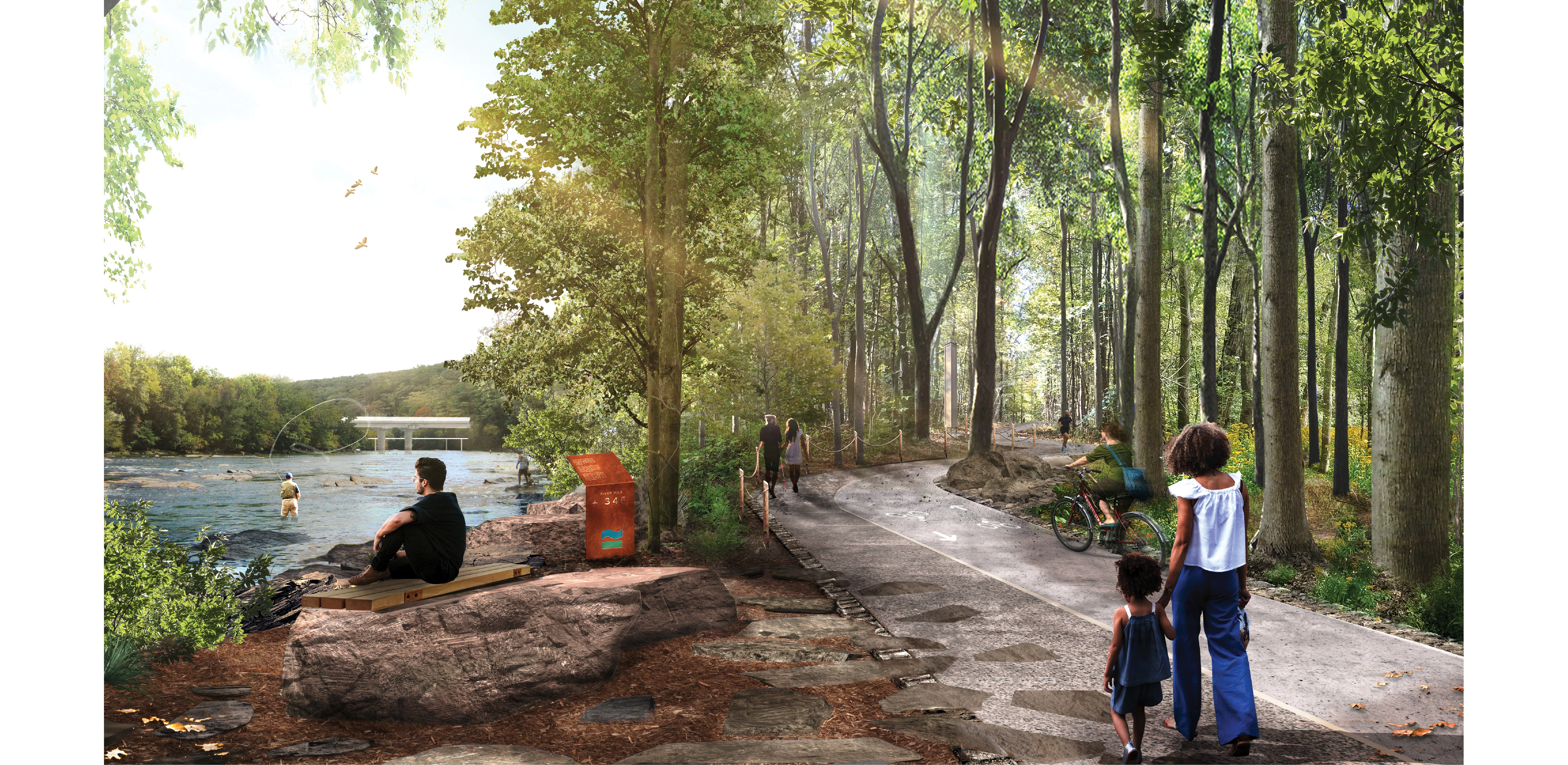 Spanning over 125 miles across the Metro Atlanta Region, the Chattahoochee RiverLands is a generational vision for a contiguous greenway, blueway, and network of open spaces that will reconnect over 1 million residents with the Chattahoochee River across 19 cities and seven counties. Unanimously adopted by a regional planning agency in 2020, the vision builds on over 50 years of grassroots planning and environmental advocacy, re-examining 1970s-era policy to drastically expand river access and connectivity while also incorporating ecological restoration initiatives. The planning process entailed an extensive two-year engagement effort, including over a hundred meetings with more than 290 local groups —a combination of open houses, focus groups, driving tours, and immersive on-site programs dubbed “river rambles.” One ramble partnered with the National Park Service and a local behavioral health center for youth on a rafting trip; another partnered with a number of supportive service organizations for individuals living with physical and mental disabilities to help inform accessibility guidelines for the proposed trail system. As a result, the guidelines now incorporate a ”braille trail” and other sensory, interpretative, and safety features. The team also developed an interactive project website populated with proposed demonstration projects, site histories, engagement event recaps, and information about projects now underway. At a broader scale, the RiverLands vision incorporates new equitable development guidelines distilled from a series of “equity studio hours” co-led with local scholars and social justice advocates—including specific anti-displacement strategies and proposed policies to capture value, workforce development opportunities, and better-paying jobs in West Atlanta communities that are at particular risk of gentrification. Since the vision’s completion in 2020, the project has made significant advancements—including over $169 million in investment to acquire new properties and build pilot projects (including a “showcase project” where all aspects of the regional trail will be built out). The prominent national non-profit that convened the Chattahoochee Working Group in 2018 continues to champion the RiverLands vision and hold jurisdiction for its goals, helping ensure a continuous user experience and restored regional habitat as it evolves. The original team also fleshed out a comprehensive design guidelines document to inform trail design, identity, materiality, and the ecological and social impacts of projects in decades to come.