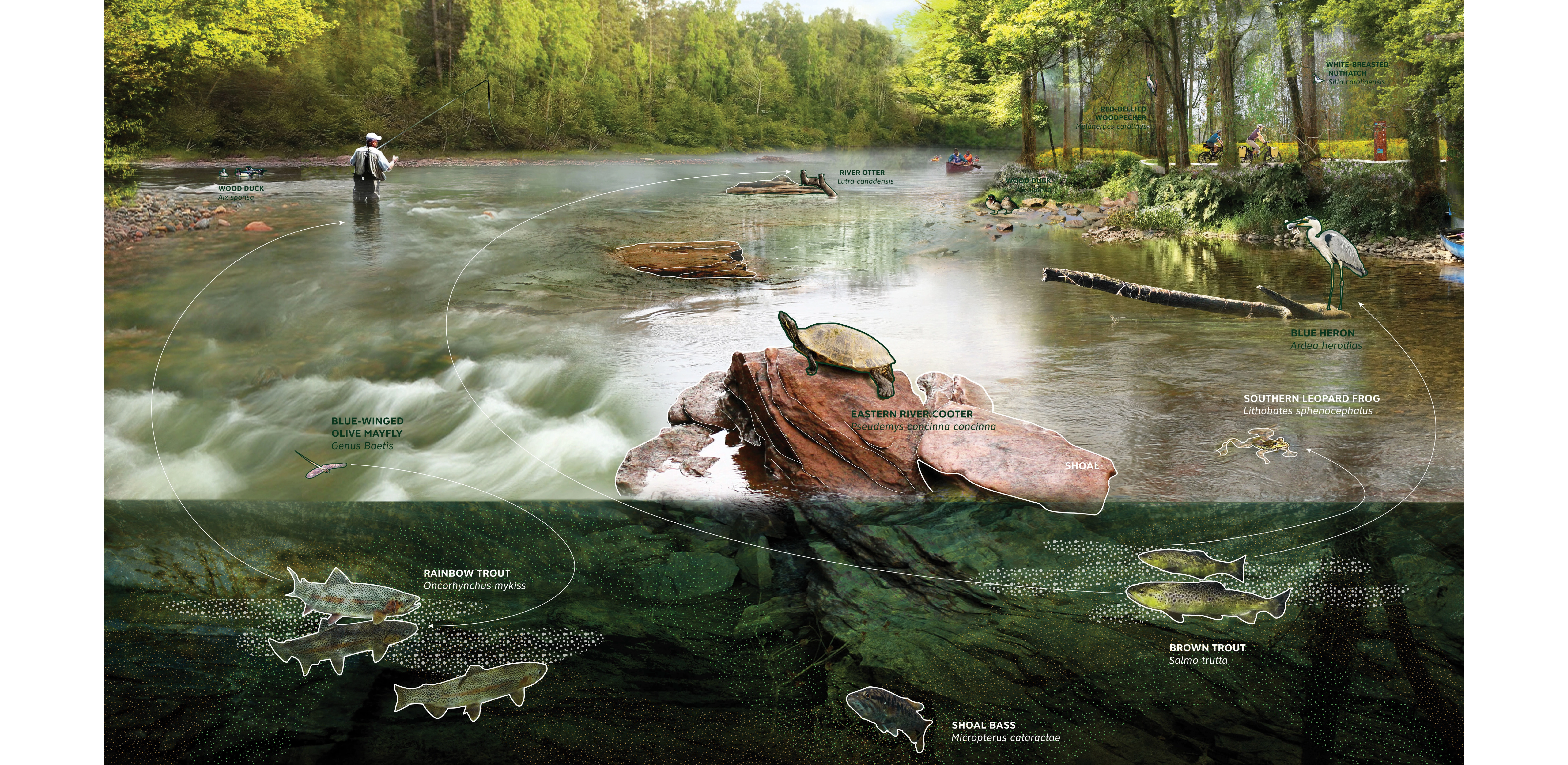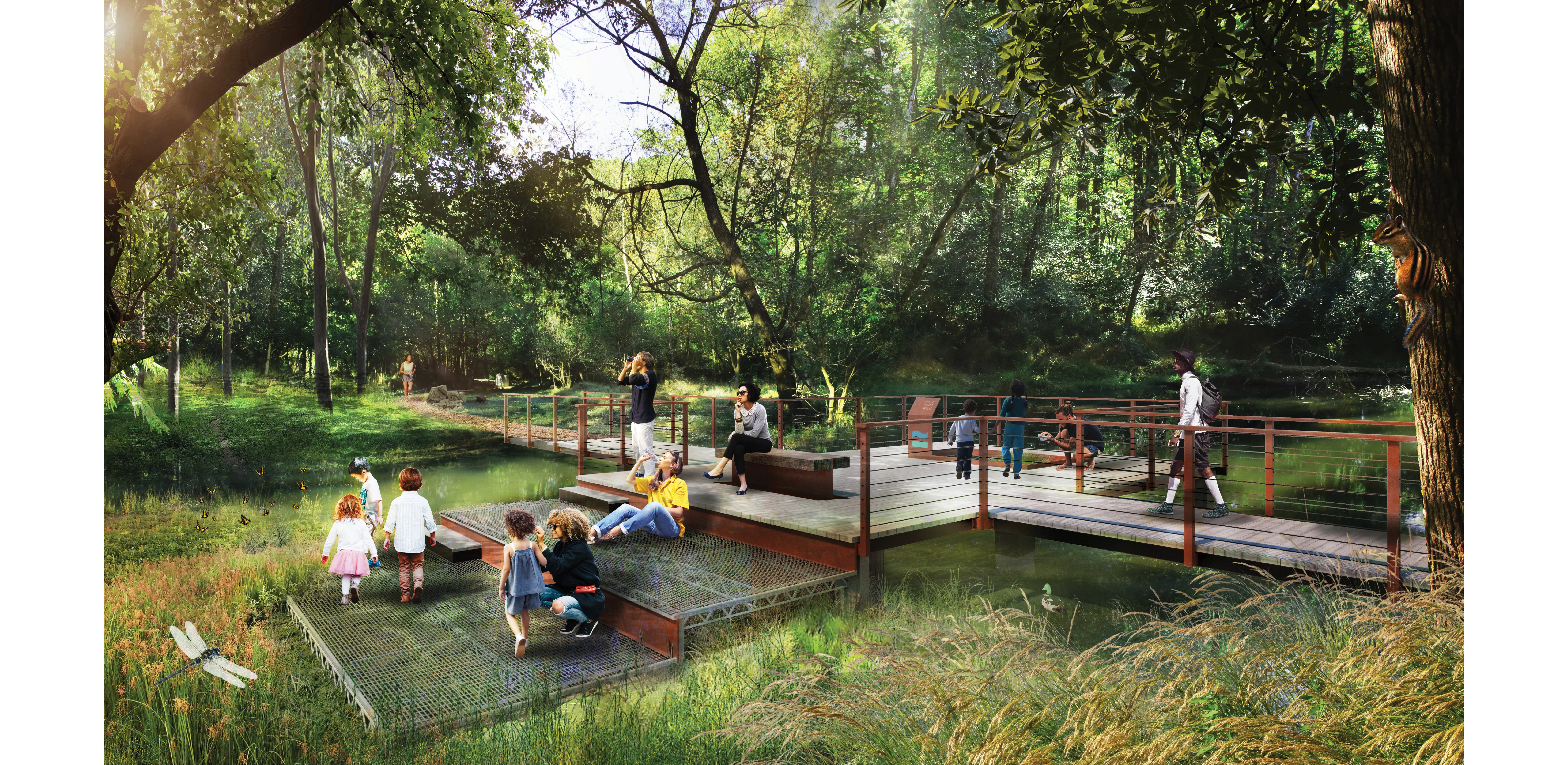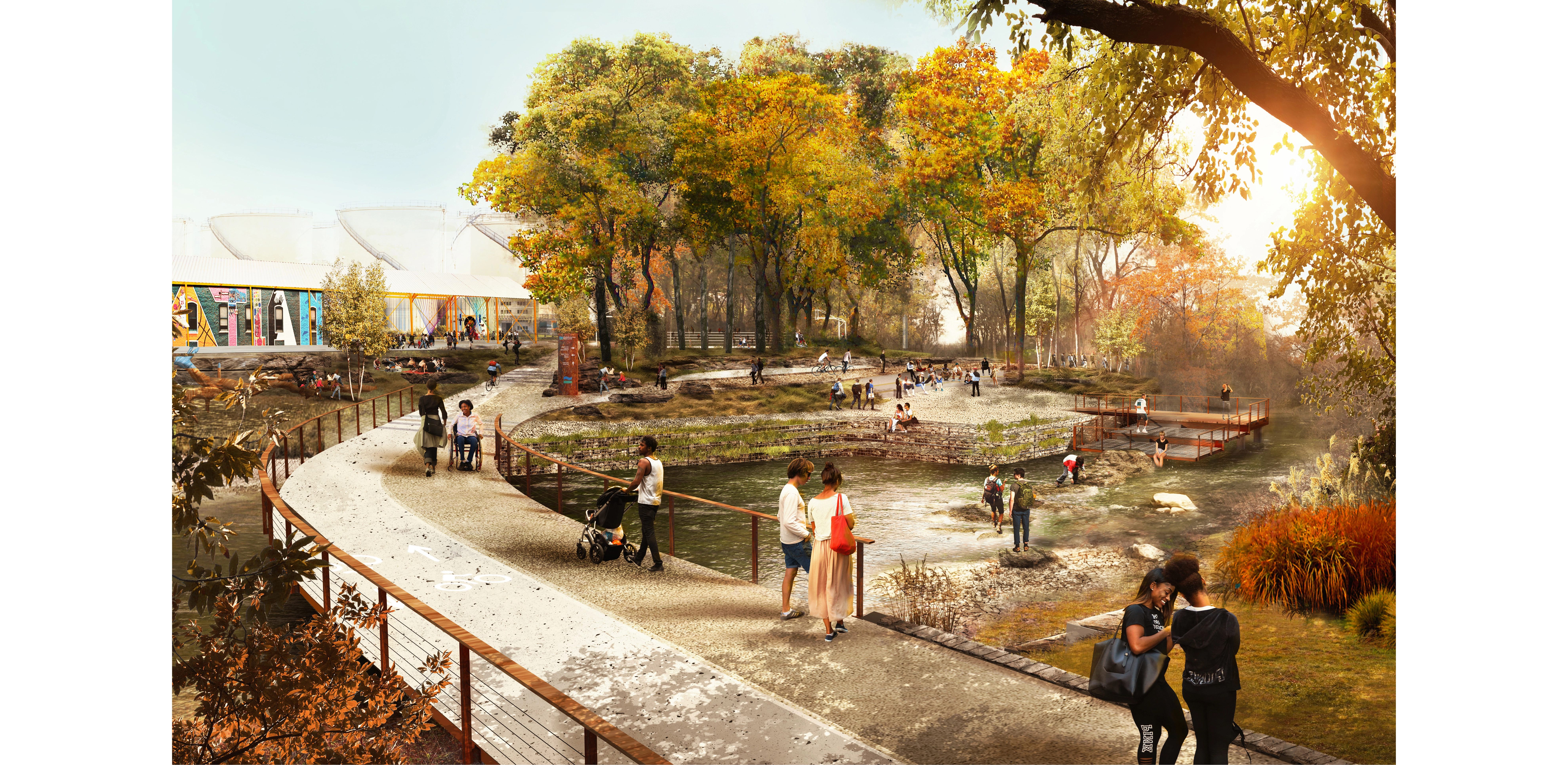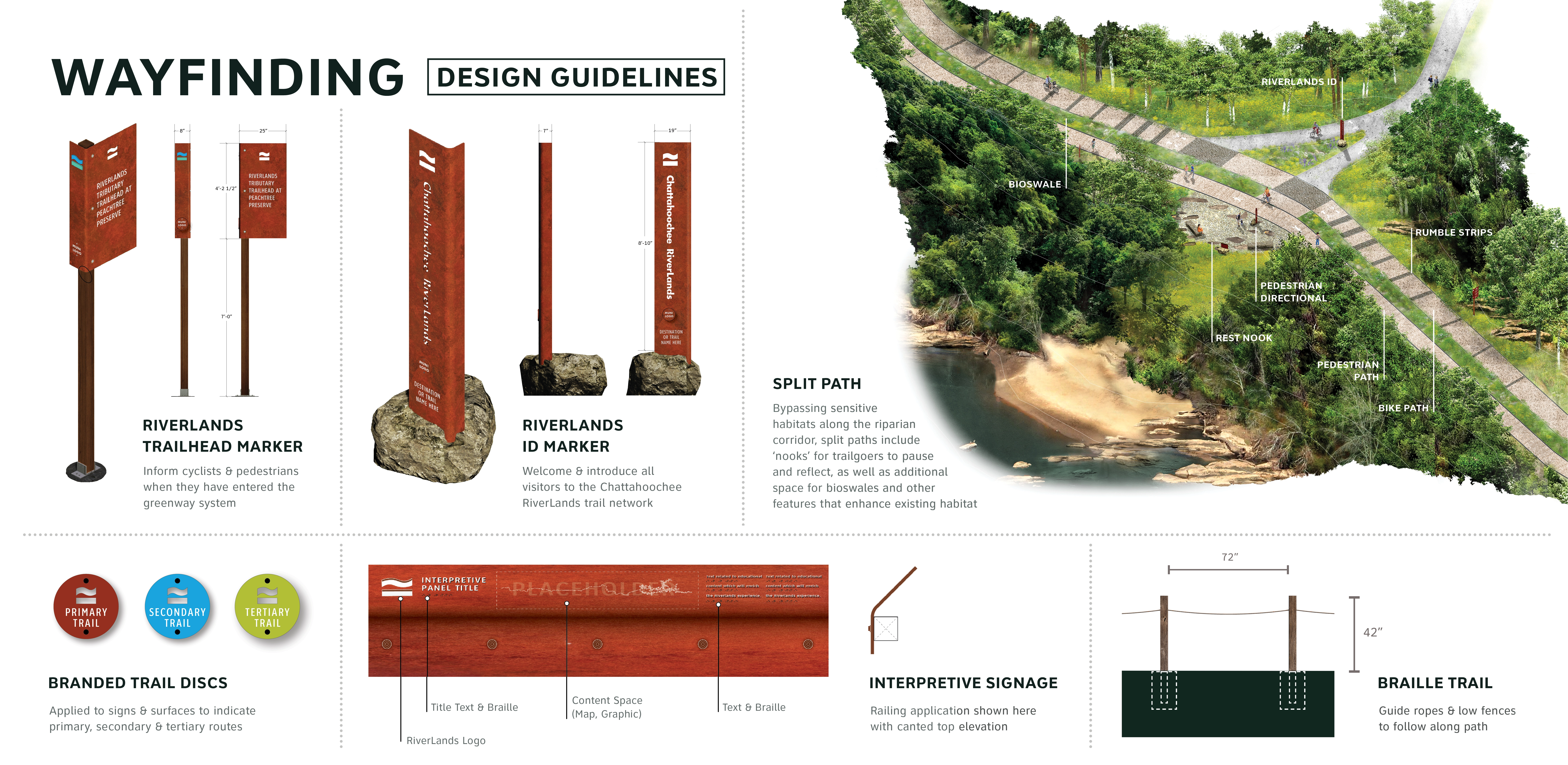 Spanning over 125 miles across the Metro Atlanta Region, the Chattahoochee RiverLands is a generational vision for a contiguous greenway, blueway, and network of open spaces that will reconnect over 1 million residents with the Chattahoochee River across 19 cities and seven counties. Unanimously adopted by a regional planning agency in 2020, the vision builds on over 50 years of grassroots planning and environmental advocacy, re-examining 1970s-era policy to drastically expand river access and connectivity while also incorporating ecological restoration initiatives. The planning process entailed an extensive two-year engagement effort, including over a hundred meetings with more than 290 local groups —a combination of open houses, focus groups, driving tours, and immersive on-site programs dubbed “river rambles.” One ramble partnered with the National Park Service and a local behavioral health center for youth on a rafting trip; another partnered with a number of supportive service organizations for individuals living with physical and mental disabilities to help inform accessibility guidelines for the proposed trail system. As a result, the guidelines now incorporate a ”braille trail” and other sensory, interpretative, and safety features. The team also developed an interactive project website populated with proposed demonstration projects, site histories, engagement event recaps, and information about projects now underway. At a broader scale, the RiverLands vision incorporates new equitable development guidelines distilled from a series of “equity studio hours” co-led with local scholars and social justice advocates—including specific anti-displacement strategies and proposed policies to capture value, workforce development opportunities, and better-paying jobs in West Atlanta communities that are at particular risk of gentrification. Since the vision’s completion in 2020, the project has made significant advancements—including over $169 million in investment to acquire new properties and build pilot projects (including a “showcase project” where all aspects of the regional trail will be built out). The prominent national non-profit that convened the Chattahoochee Working Group in 2018 continues to champion the RiverLands vision and hold jurisdiction for its goals, helping ensure a continuous user experience and restored regional habitat as it evolves. The original team also fleshed out a comprehensive design guidelines document to inform trail design, identity, materiality, and the ecological and social impacts of projects in decades to come.