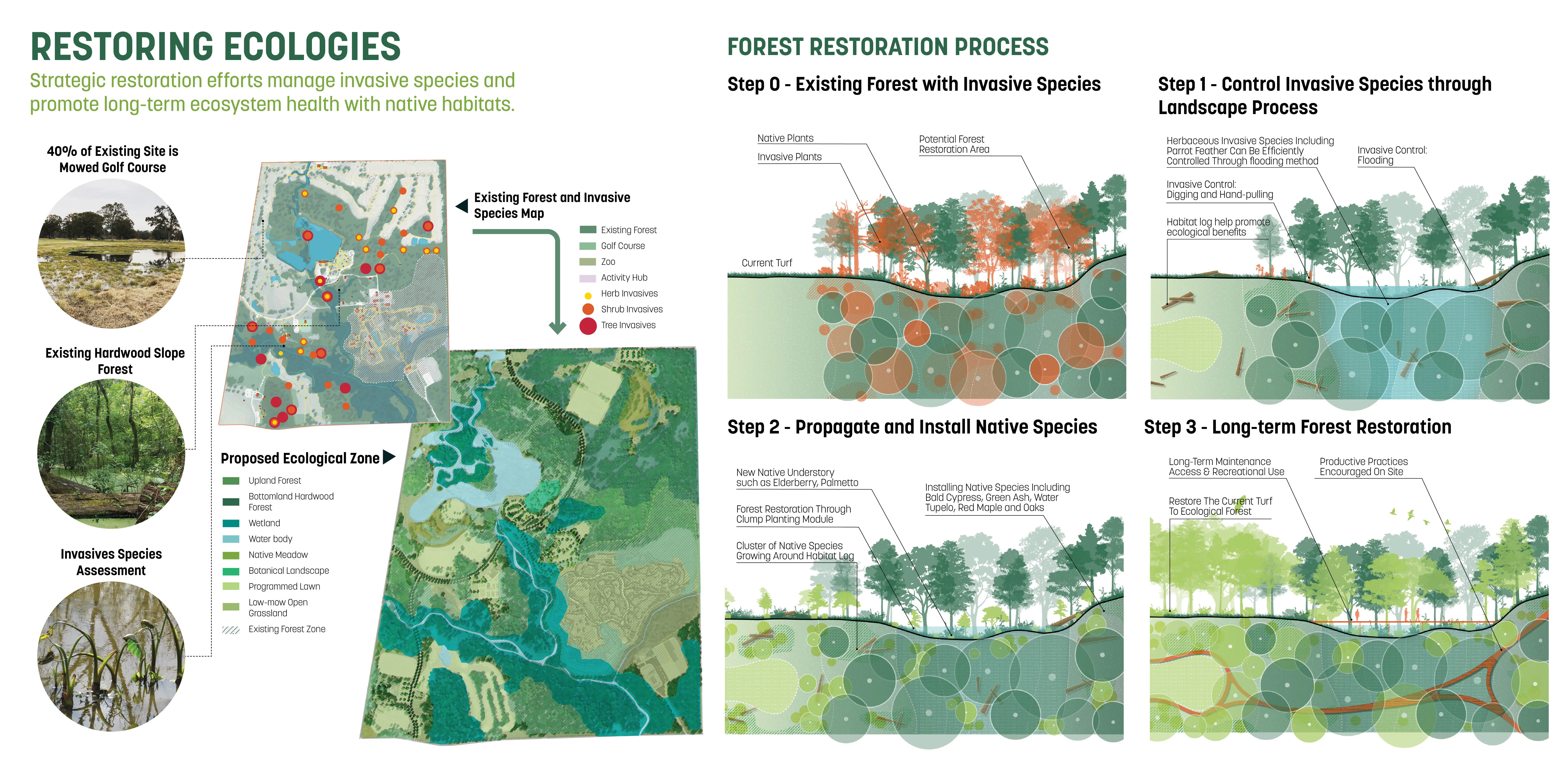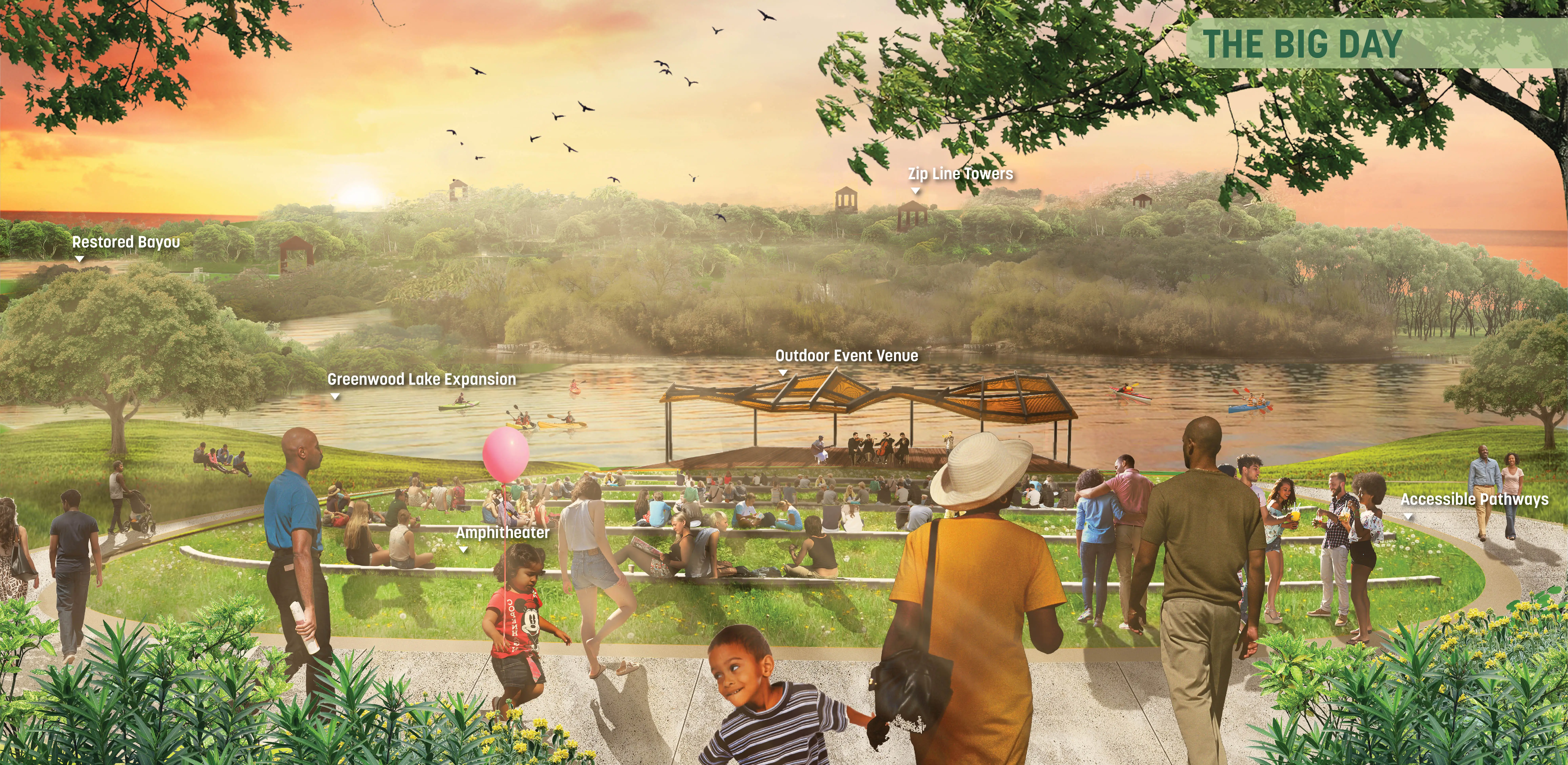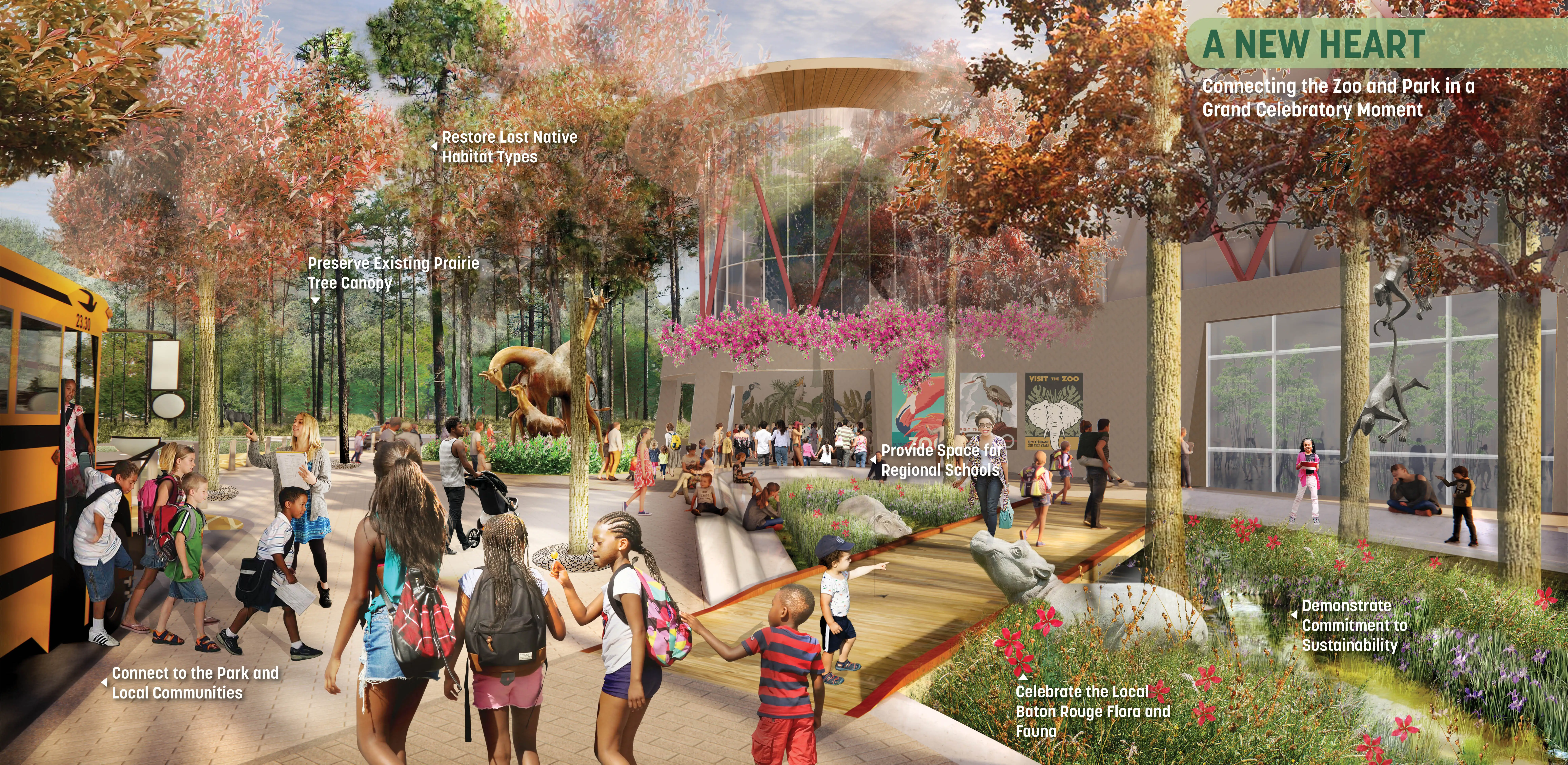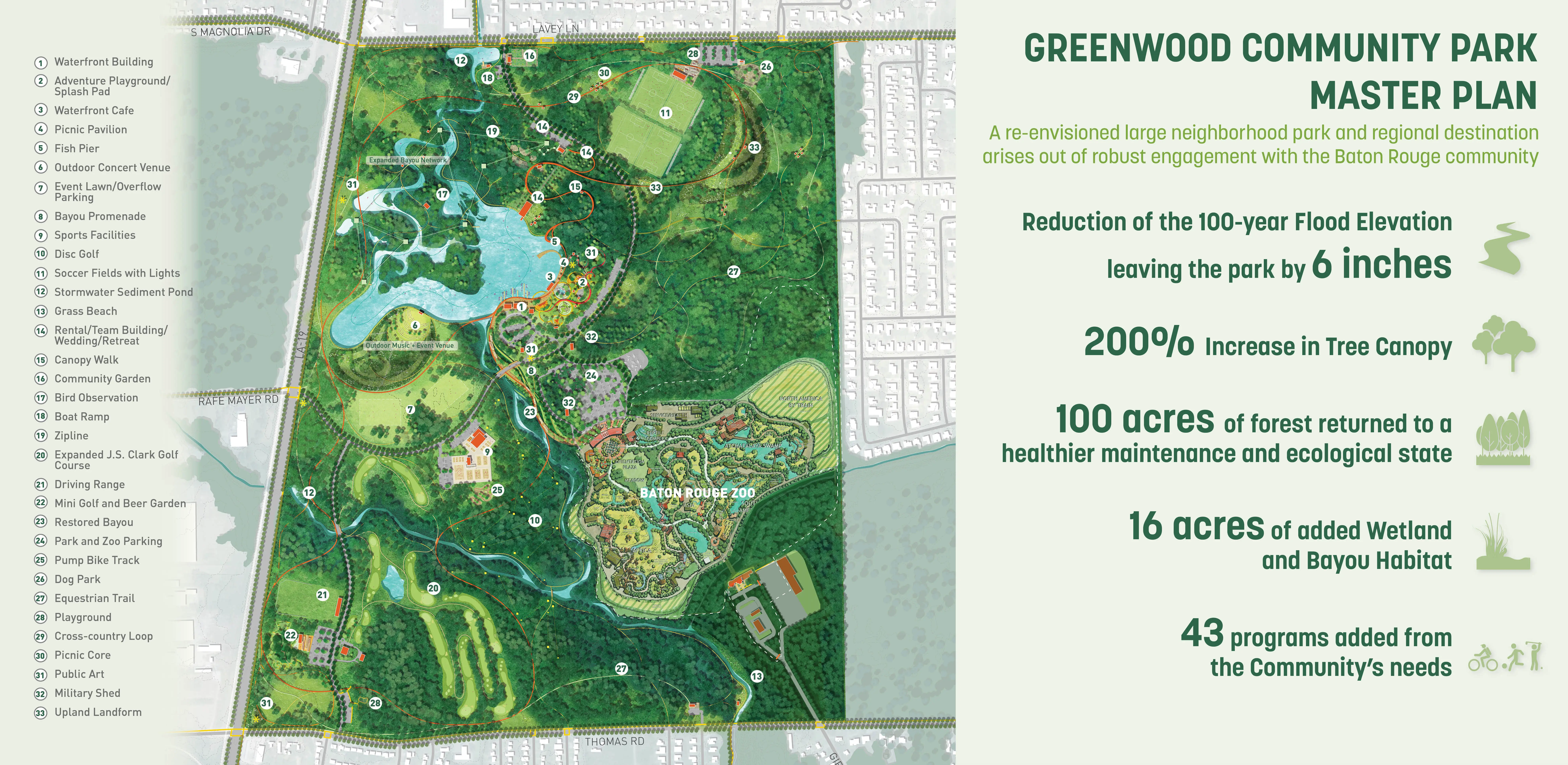East Baton Rouge Parks & Recreation Commission (BREC) had years of turmoil after some called for the Zoo to be relocated south of the parish, an overwhelmingly white area. As BREC entertained the idea, public outcry came from North Baton Rouge (NBR), a predominantly Black community. With support from local and state leadership and BREC we decided to keep the Zoo in NBR’s own Greenwood Park and embark on an ambitious master plan to heal historic patterns of disinvestment. After a year of intense community engagement and design, the front page of the paper quoted one of BREC’s former opponents: “It’s like a dream.” Rooted in Input & Analysis The team employed a methodical approach to build trust, collaborate with community leaders, and gather input from multiple stakeholders. A rigorous analysis of natural systems, economic performance, user patterns, and infrastructural integrity led to 4 guiding principles: Celebrate Louisiana’s Nature, A Park for Everyday & the Big Day, Open Up & Reach Out, and Welcome & Grow. A Constellation of Amenities The plan creates a neighborhood amenity that provides everyday activities for the residents of NBR and the surrounding region. It offers a dynamic set of spaces: an indoor/outdoor sports & recreation center, adventure playground, 6,000-person outdoor event space, woodland retreat & conference center with adventure course, multi-purpose fields, community gardens, cross-country trails and more. A network of trails and nodes nestle into the site support contemplative moments for groups of all sizes. The plan introduces revenuegenerating and free programs that foster a more sustainable and accessible operating model. A key component of the plan is reorienting the front entrance of the Zoo to open into the heart of the park, which reduces impacts on the site ecology and utilizes shared infrastructure. Embedding Resilience The bayous throughout the site were channelized to facilitate flood waters, cutting off natural hydrologic functions and resulting in invasive species. Additionally, a large urban watershed north of the park degraded the site’s water quality and, with virtually no flood-time benefits downstream, came to life in the devastating 2016 1,000-year flood. We used the park as a model for upstream stormwater management. Through a series of new channels that trace the patterns of the original bayous, the plan recharges historic meanders, lengthens the run of the bayou, and creates spillover areas. This reduces downstream flood waters while treating 100% of stormwater through natural processes. The site boasts hundreds of acres of swamp and forest. Over time, they were fragmented and overrun with invasive species. The plan uses natural processes to manage this: natural flooding, prescribed burns, and clump reforestation will restore nearly 150 acres of managed turf grass. The design also restores hilltop meadows formed by the spoils of the new bayou and flood storage work, referencing indigenous mound builders and providing habitat for insects and birds. Community First For the project to confront racism and disinvestment throughout its implementation, it's critical that the record-breaking investment into Greenwood Park has positive impacts for NBR. The plan’s Community Benefits Program defines strategies to mitigate displacement and other effects of green gentrification. At all stages, the project is committed to reconciling historic patterns of disinvestment in the community.