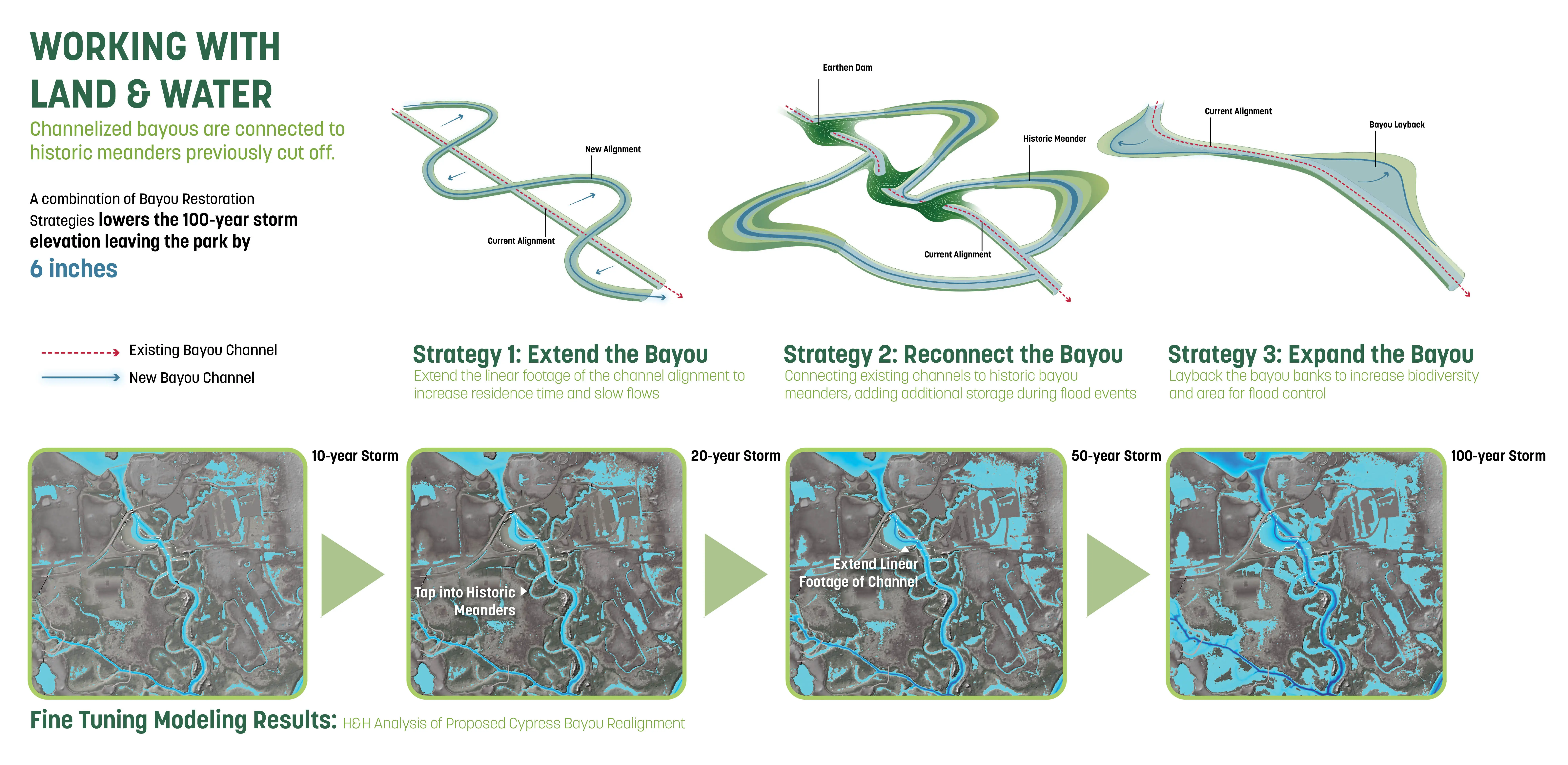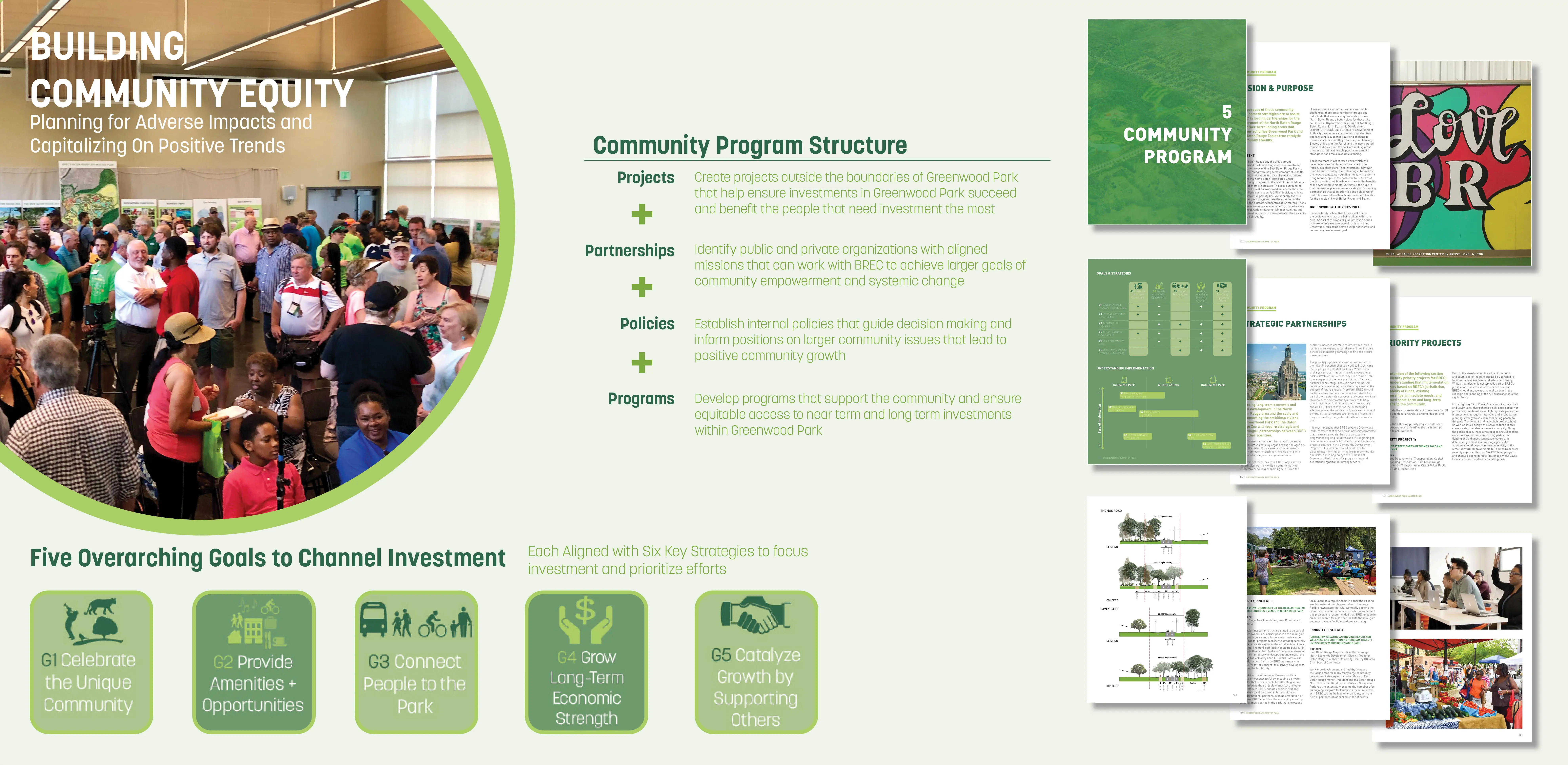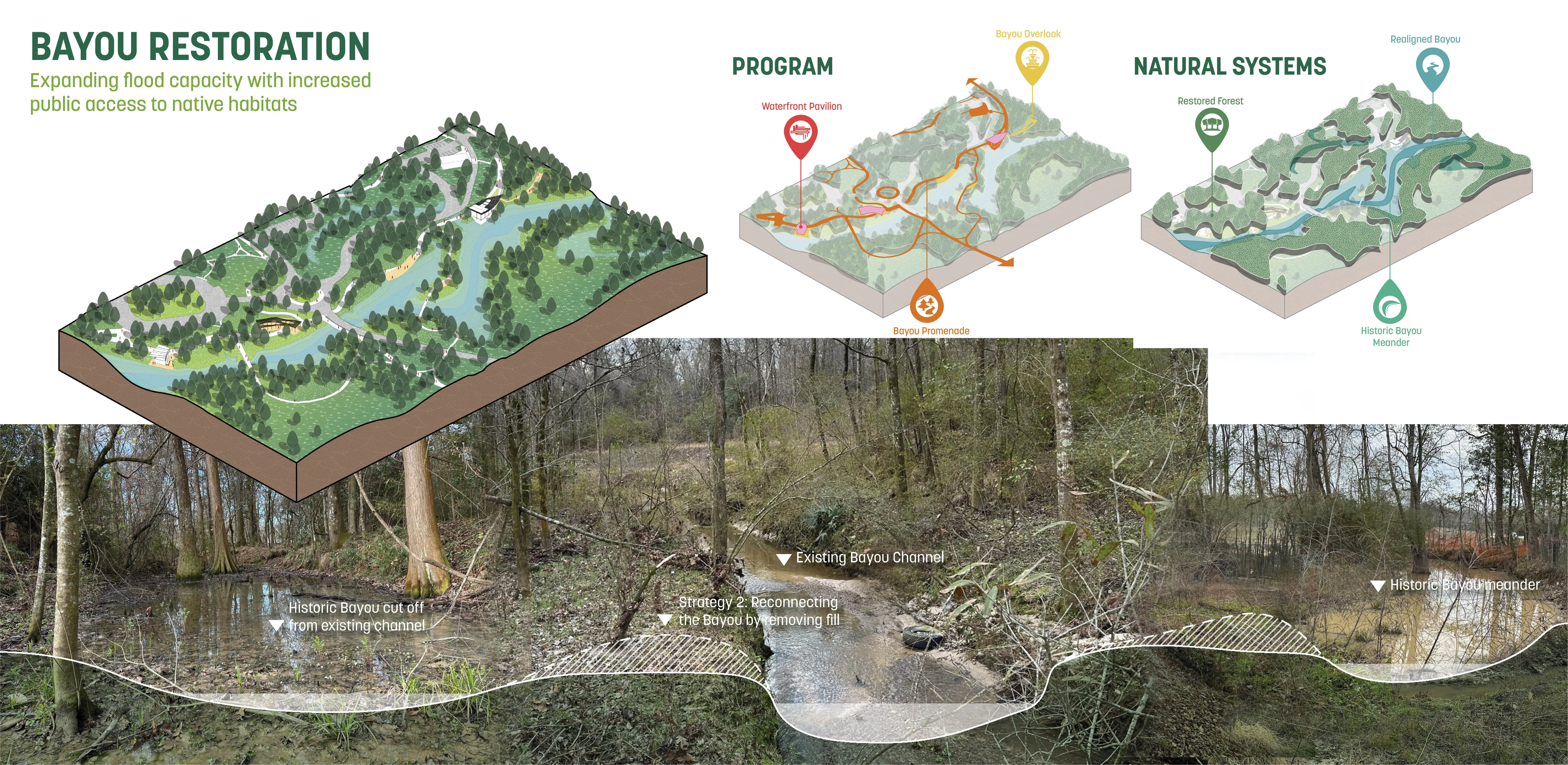 The Master Plan for the 660-acre Greenwood Park lays out a constellation of cultural and recreational programs that connect seamlessly into a network of preserved and restored ecologies. The plan simultaneously provides community value through flood protection, improved air quality, increased habitat, and reduced maintenance demands. The process brought together over 5,000 citizens, the largest outreach in Baton Rouge’s history, to have a conversation about race and disinvestment in this historically underserved low-income neighborhood. Building alignment and trust in a contentious context, the implementation-minded proposal is complemented by a community impact plan that focuses on equitable development to reverse decades of disinvestment.