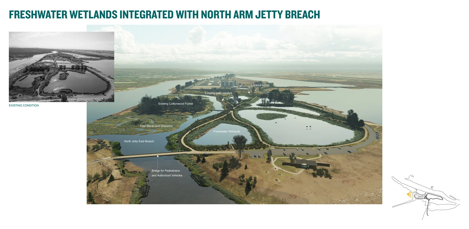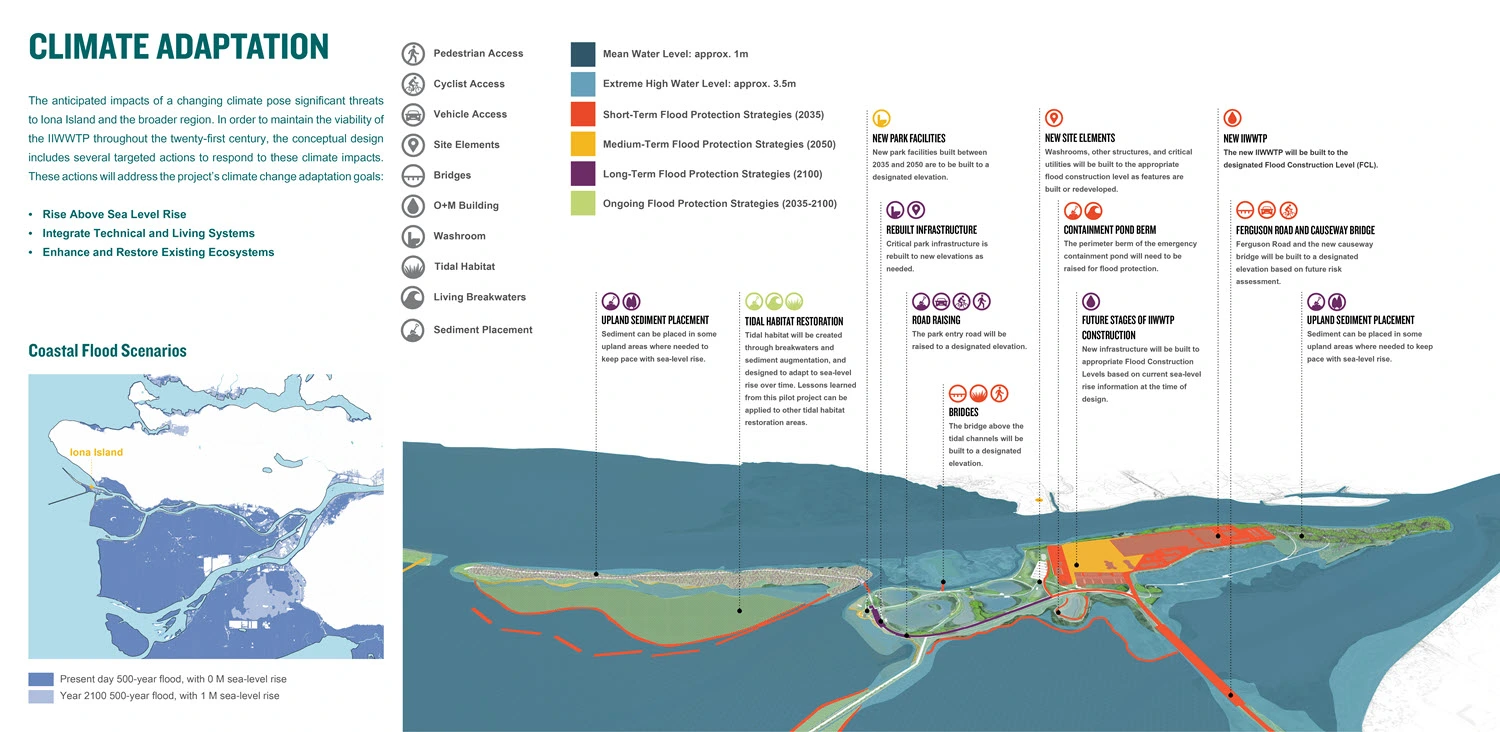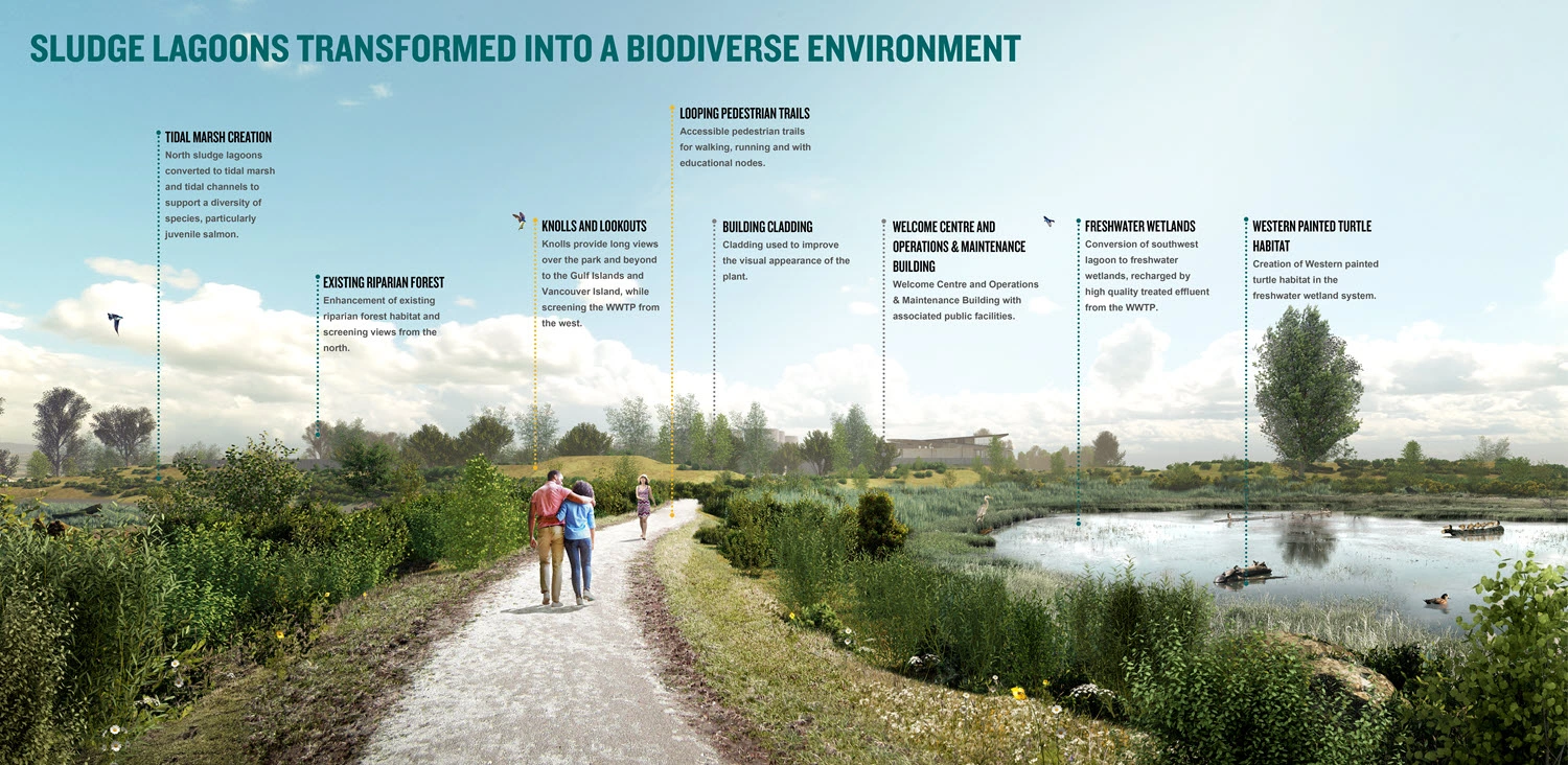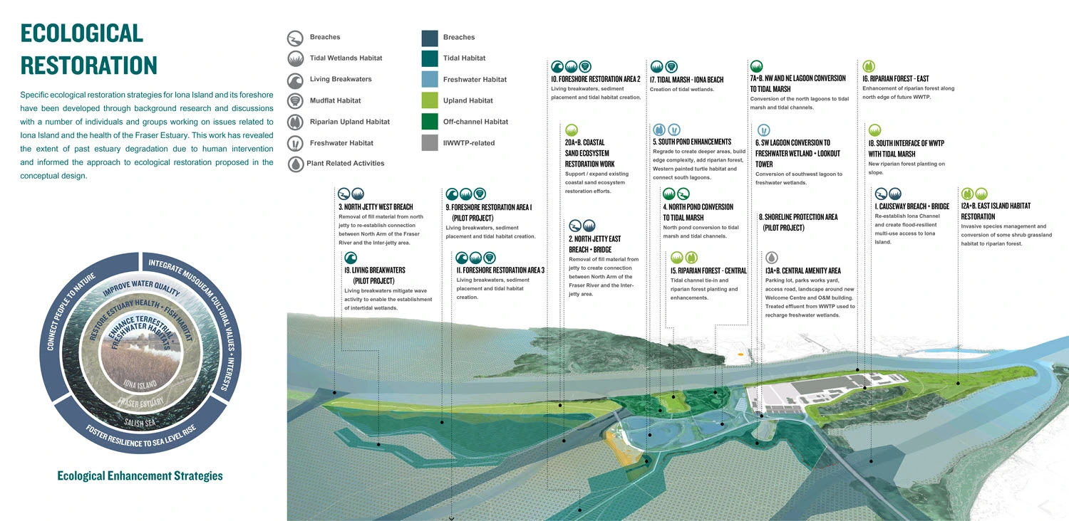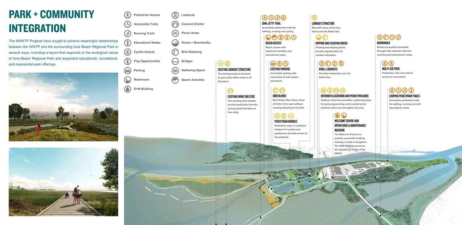 Ecological projects will restore dynamic estuary processes and enhance native and novel habitats to benefit numerous species. Ecosystem-based flood protection strategies will increase resilience against climate change impacts and protect new infrastructure. Park and community integration strategies will enable meaningful relationships between the IIWWTP and the surrounding Iona Beach Regional Park. The strategies will ensure that the plant’s layout responds to ecologically sensitive areas and the community’s desire to minimize its visual impact, while expanding educational, recreational, and experiential park offerings.