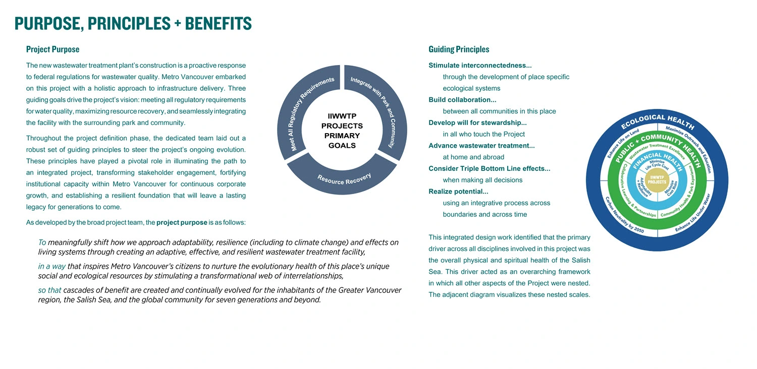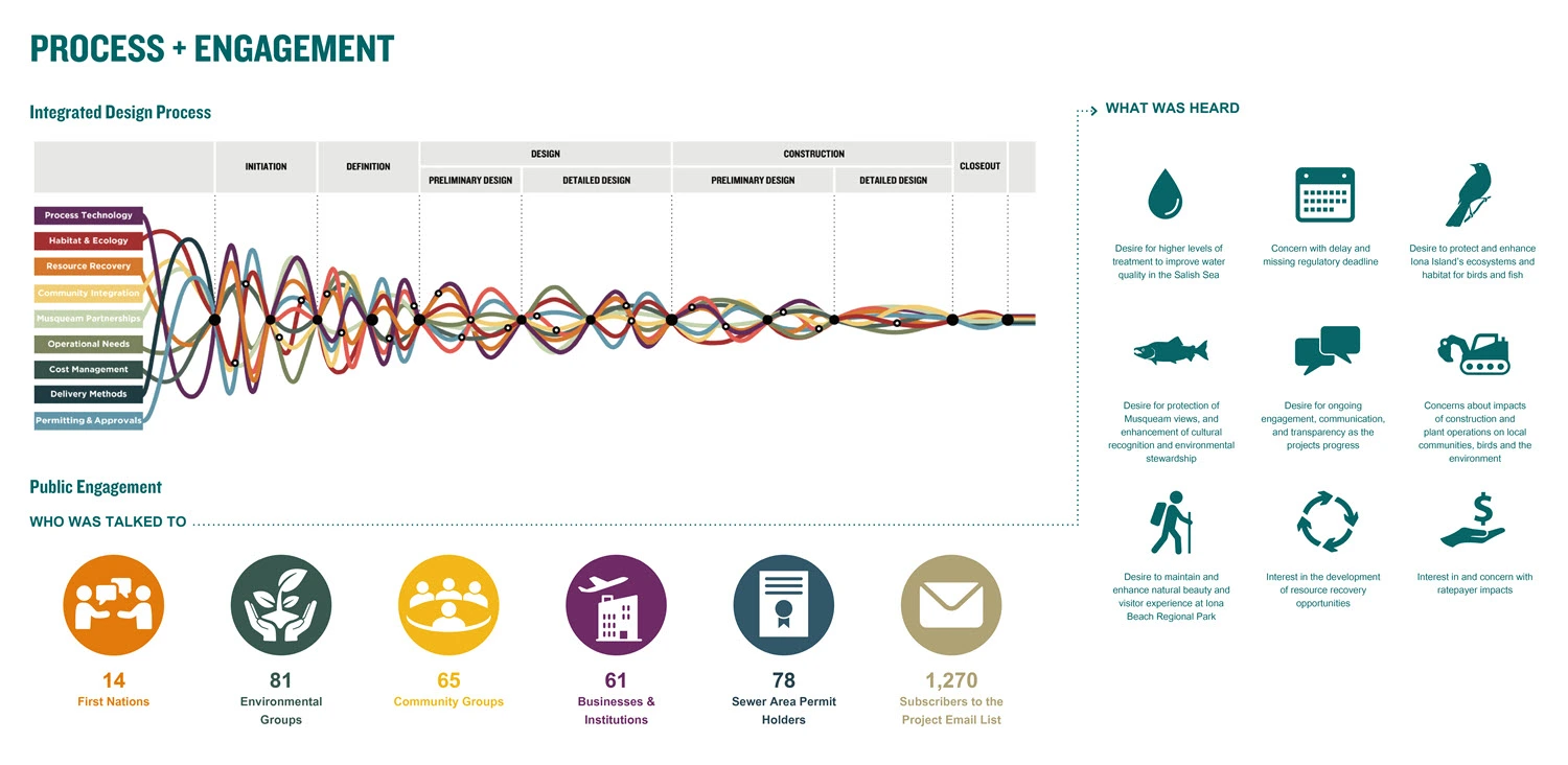An integrated design process brought together multi-disciplinary expertise to align the project's goals of improving water quality, resource recovery, and integration with the park and community. Throughout the project definition phase, an extensive engagement process was undertaken to work with a variety of organizations impacted by the IIWWTP Projects, including neighbours, park user groups, local government, and Indigenous groups. This collaborative process has enabled priorities such as habitat restoration, traditional resource access, and recognition of xʷməθkʷəy̓əm/Musqueam cultural practices and knowledge transfer to be integrated from early design stages. This process also demonstrated how to work inclusively across disciplines and jurisdictions to balance and integrate social, ecological, technical, and climate-related needs. Through the continuation of an integrated design and delivery process, work on the IIWWTP Projects will further develop and evolve until 2038, and continual improvement will be achieved through ongoing WWTP and park operations.