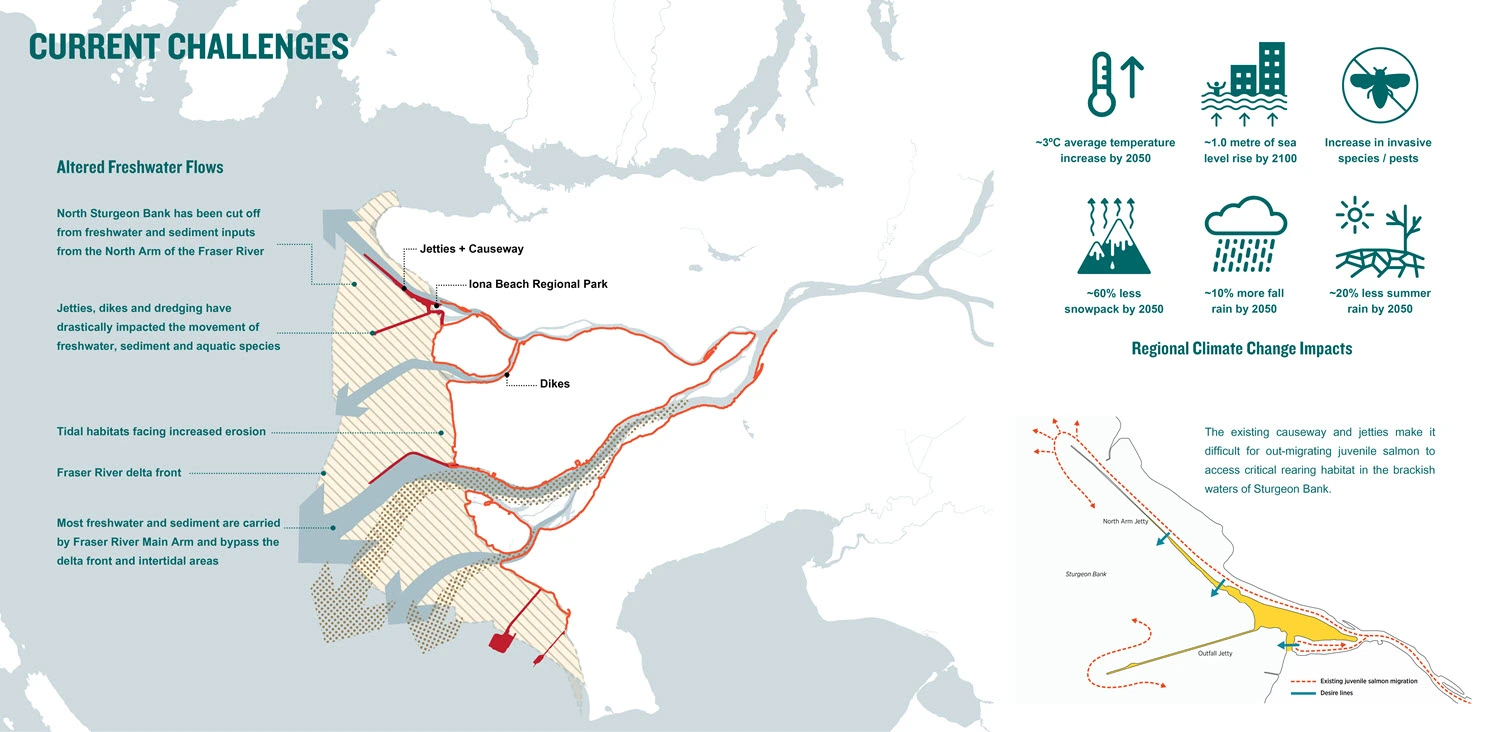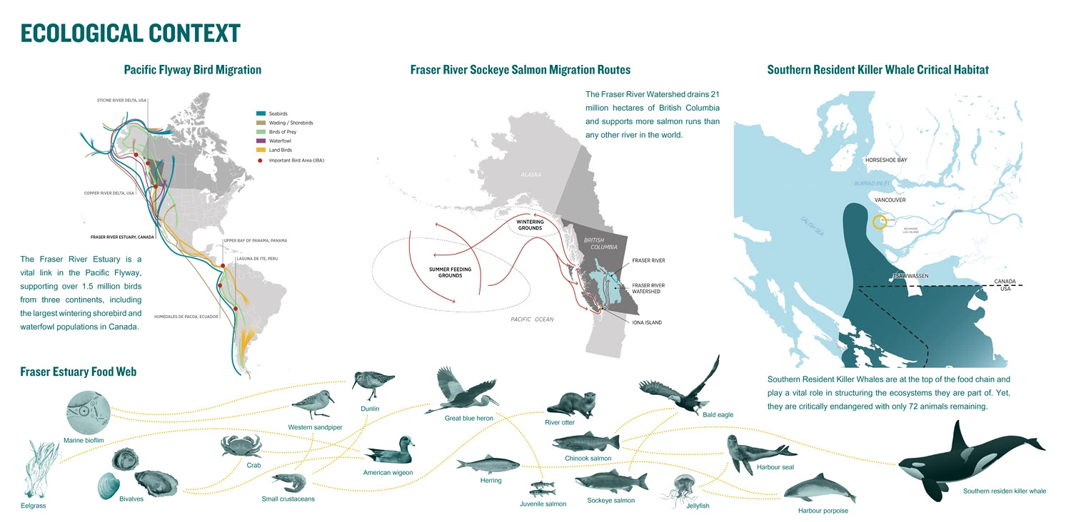 The Iona Island Wastewater Treatment Plant (IIWWTP) in Richmond, BC sits on xʷəyeyət/Iona Island, a complex site of intersecting human and ecological systems. Located in the Fraser River Estuary and across from xʷməθkʷəy̓əm/Musqueam, the existing treatment facility is one of the last plants on North America's west coast with only primary level wastewater treatment. Existing infrastructure in the estuary, including dikes and jetties, has disrupted natural sediment and freshwater flows, directly impacting juvenile salmon and other species. Furthermore, climate change poses a significant threat to the region, with projections estimating one metre of sea level rise by 2100.
