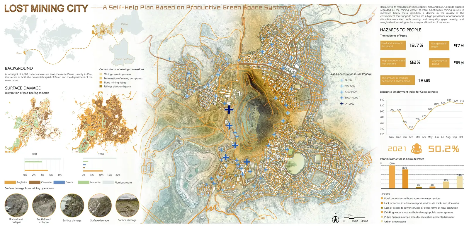 The design site is situated at an elevation of 4380 meters in a highland tropical wet and dry or savanna environment, with an area of around 14 km2 and 74,975 inhabitants (2023). We examined and researched the distribution of the local population, land pollution, urban industry, regional climate and vegetation, surface water catchment patterns, and the distribution of green space, among other things. A productive system of green spaces makes it possible for Cerro de Pasco to implement a sustainable self-help plan.