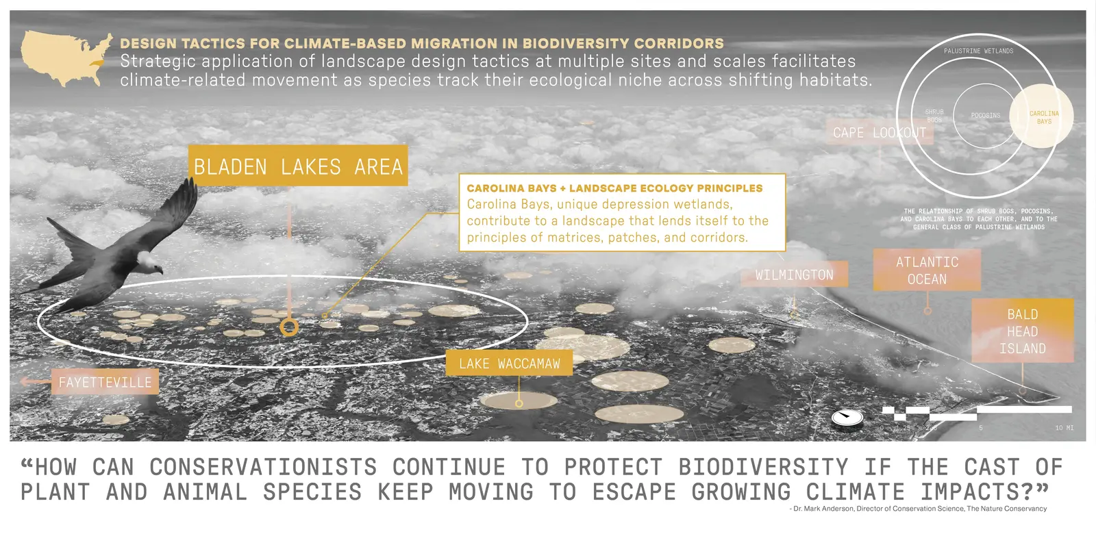 This project addresses biodiversity conservation through corridor design, exploring how the strategic application of design tactics at multiple sites and scales can facilitate climate-related movement as species track their ecological niche. The Nature Conservancy has identified “resilient and connected landscapes” across the US. These priority areas for conservation are linkages that could sustain the diversity of a region under a dynamically changing climate. This project examines the largest of these landscapes in NC’s Coastal Plain, resulting in a scalable framework for analyzing, planning, and designing for climate-related species movement. Applied broadly, this model could reduce the catastrophic effects of biodiversity loss.
