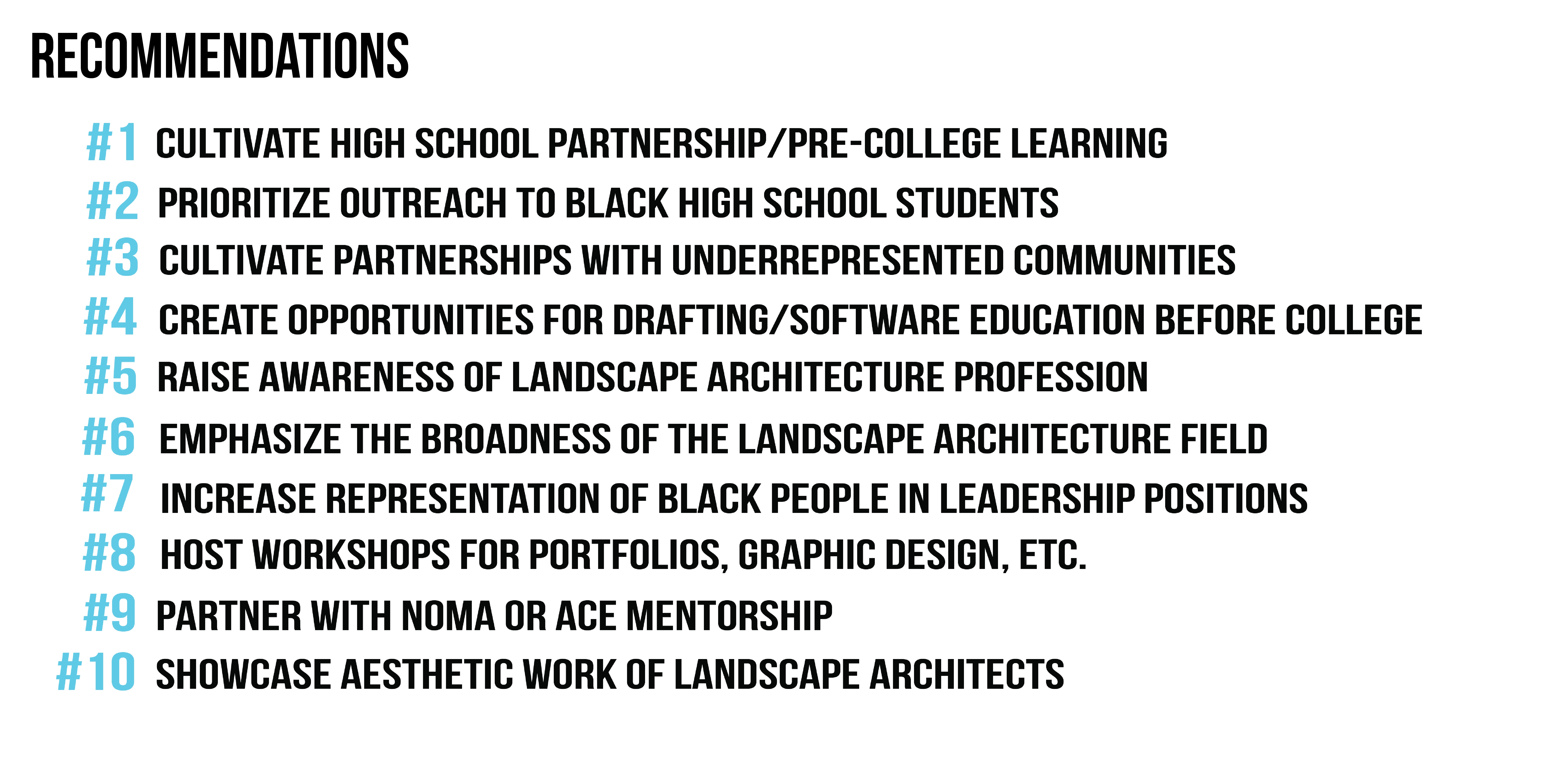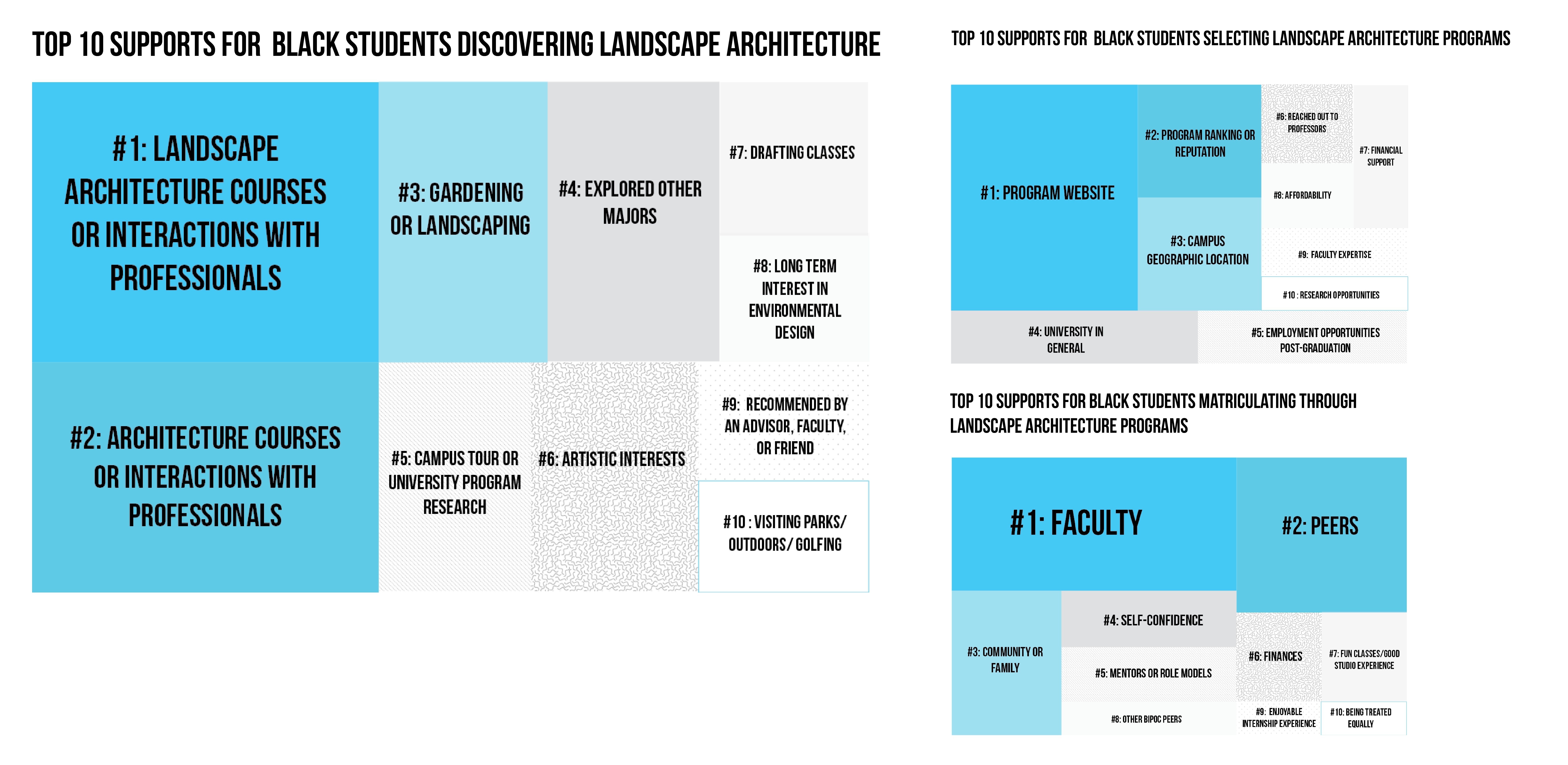 As the ASLA embarks on their Racial Diversity Plan of Action and the LAF continues with its Ignite program, the findings of this study provide valuable insights into the experiences of Black landscape architecture students. This study provides a starting point for informed actions by landscape architecture organizations and academic programs to increase diversity, equity, and inclusion in the landscape architecture field. It means to move individuals and organizations to further contemplate, research, and act on the disparities identified here.