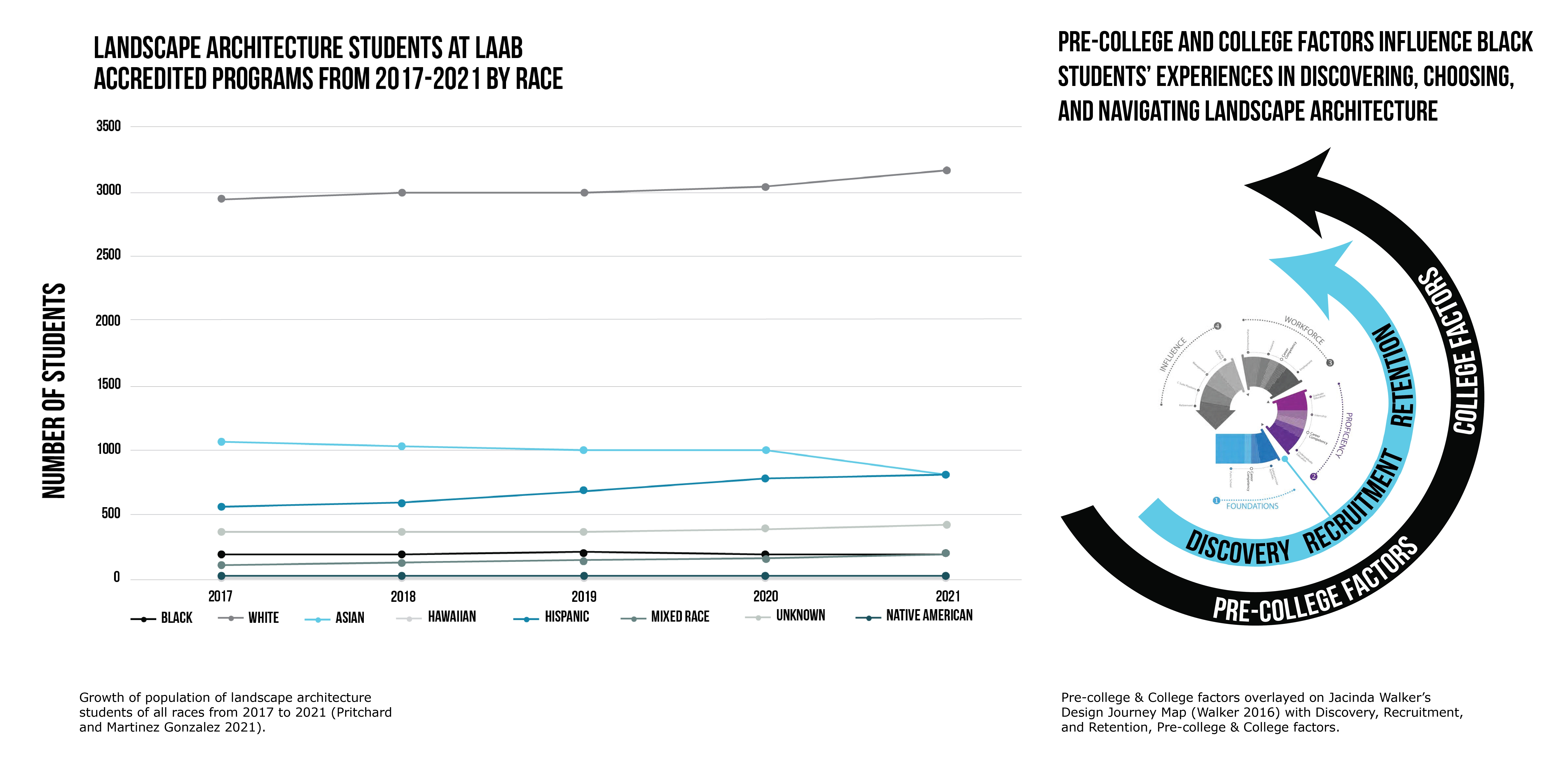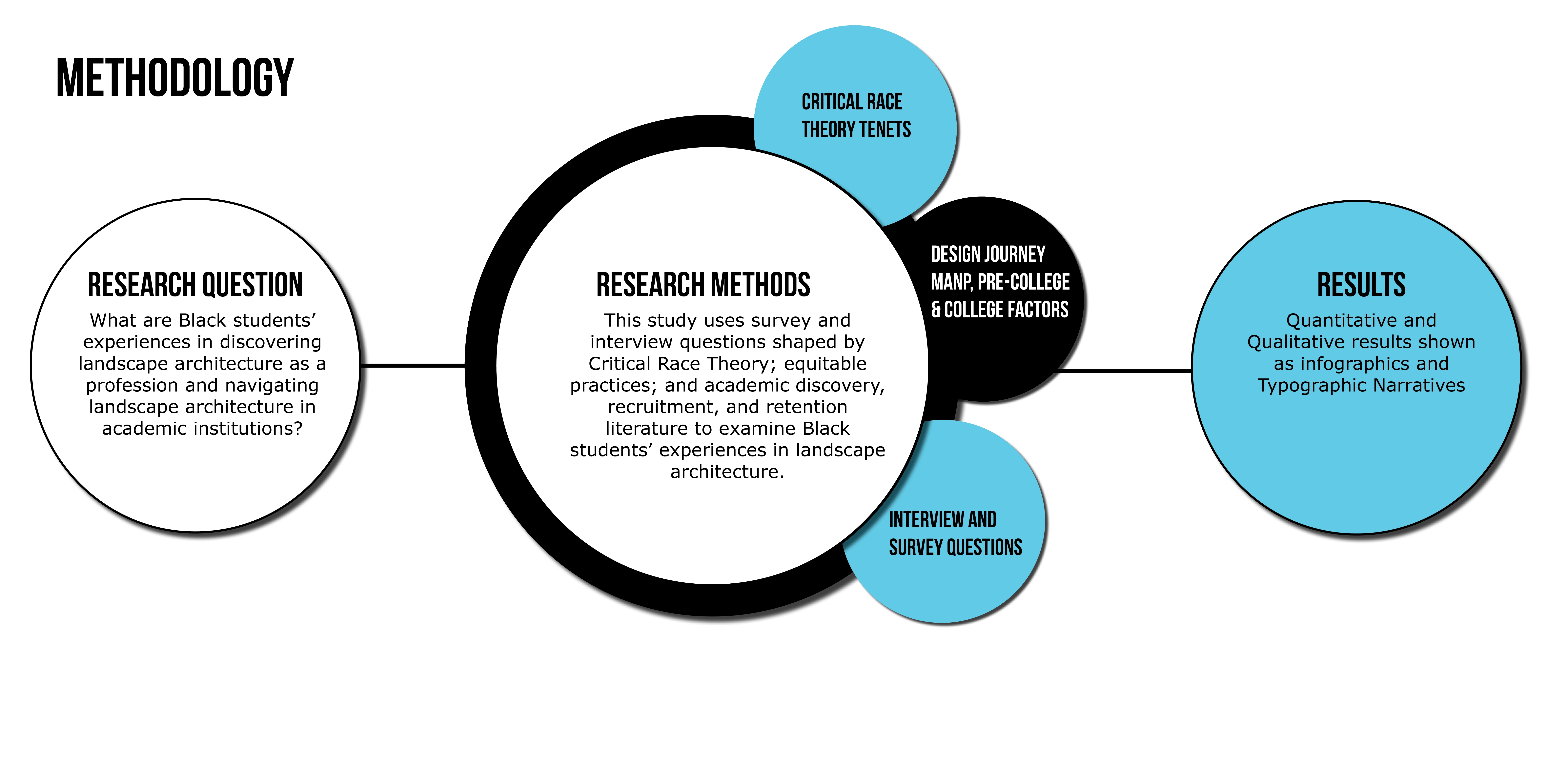 Quantitative and qualitative data from multiple-choice and open-ended survey questions and participant interviews were used to examine Black students’ experiences in discovering, choosing, and navigating their landscape architecture programs. The conceptual framework is informed by Critical Race Theory, narrative inquiry, and case study methods. Survey results were analyzed using descriptive statistics and deductive coding with apriori codes (Saldana 2021). The apriori codes were determined from an indepth literature review. The survey results are illustrated in infographics detailing students’ backgrounds, experiences, and recommendations to the landscape architecture field. Key points in the interviewees’ stories related to the discovery, recruitment, and retention portions of their design journey were identified and retold anonymously through counternarrative visualizations, dubbed “Typographic Narratives” by the researcher.