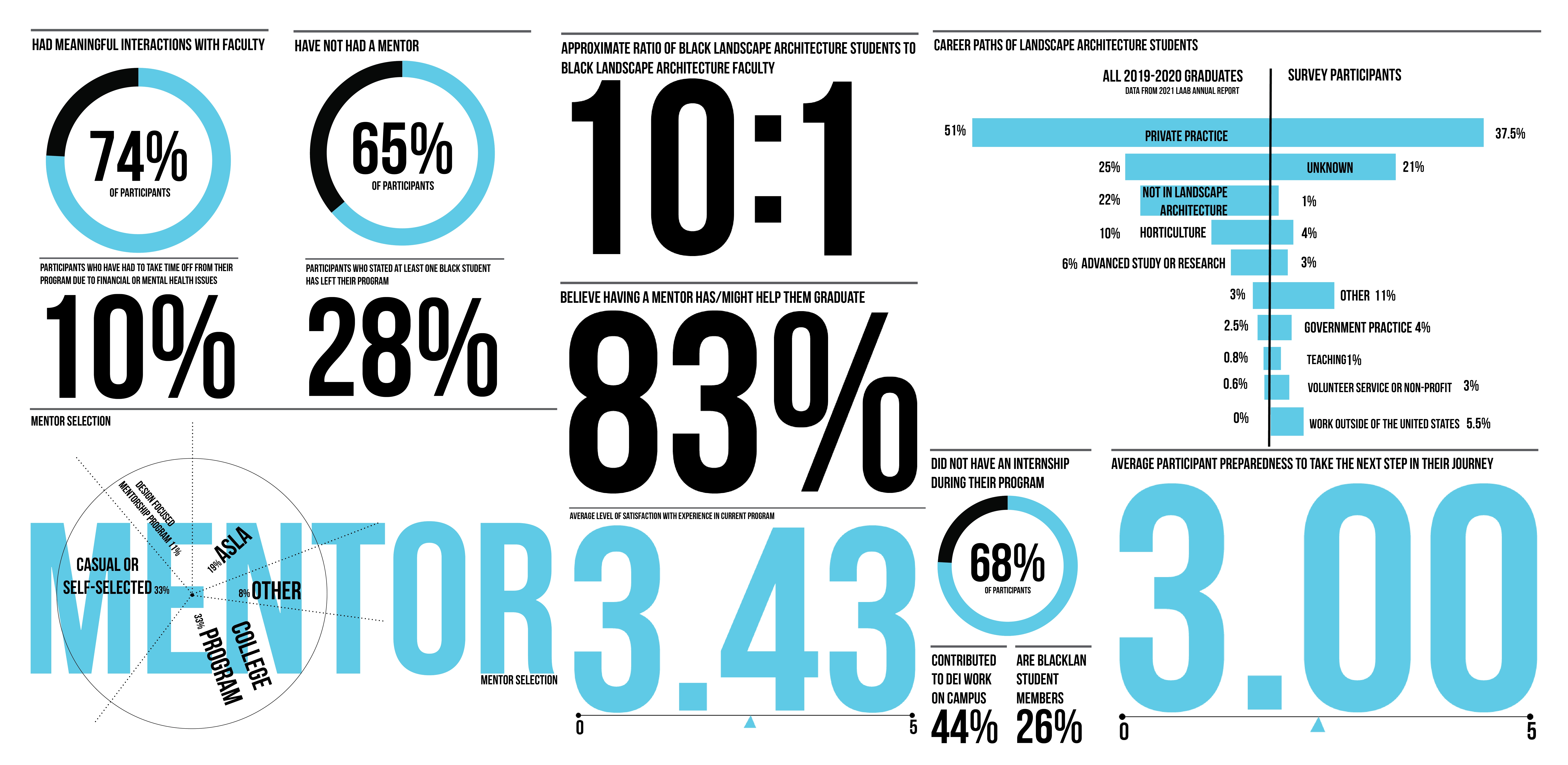 This study surveyed 97 students enrolled in 28 LAAB-accredited programs across the United States in the 2020-2021 academic year who identify as Black or African American. Eight survey respondents were selected for indepth interviews. The selection process was guided by proportional representation of undergraduate and graduate programs with reservation of two participant spots for students from historically black colleges and universities to ensure their stories are shared in this study.
