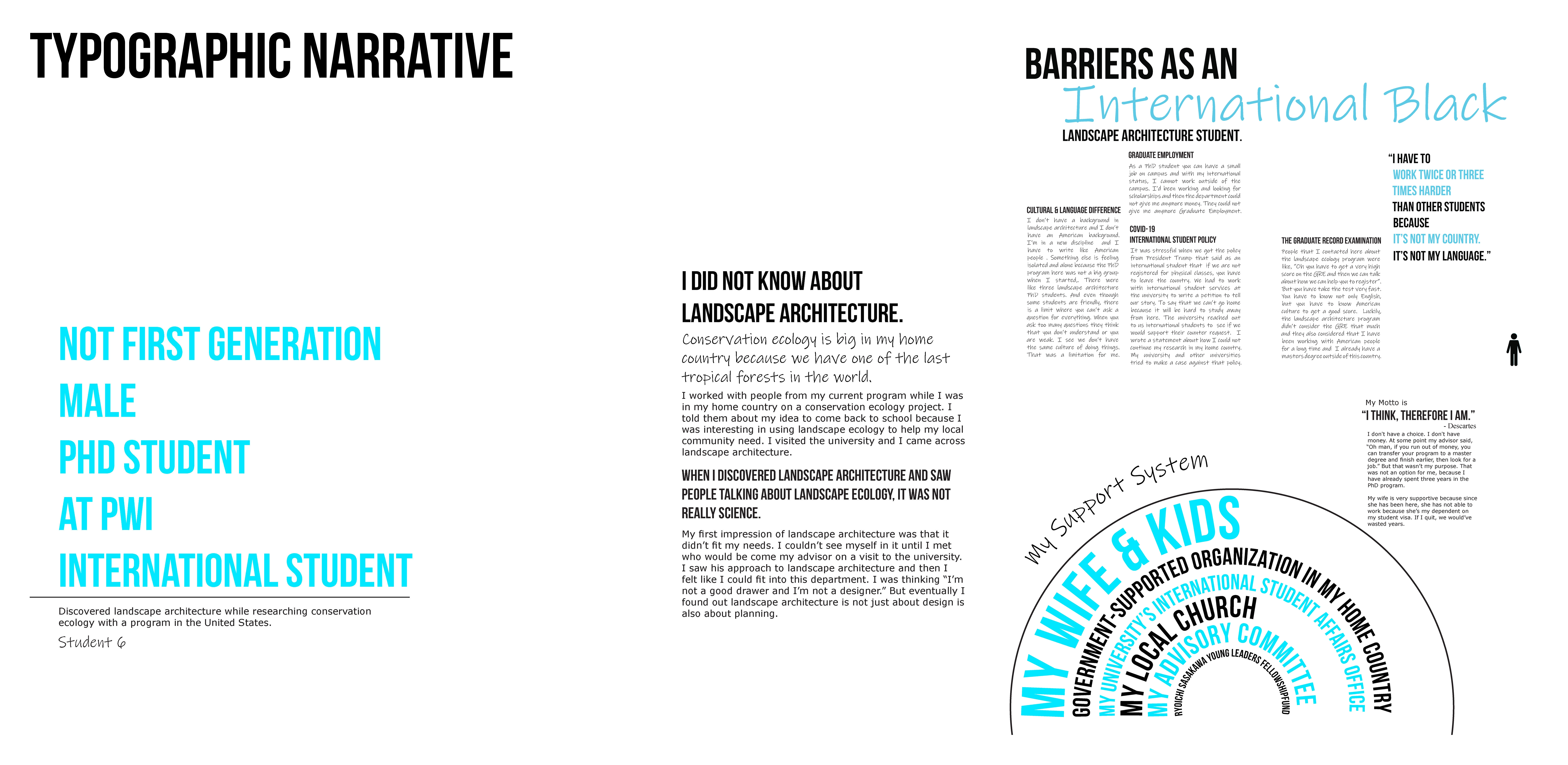 This engaged research revealed that cognitive diversity is prevalent amongst Black landscape architecture students, demonstrating the need for a range of techniques for recruiting and retaining them. The Typographic Narratives reinforce the importance of having both racial and cognitive diversity in peers and faculty. Primary recommendations to equitably diversify the landscape architecture field include cultivating pre-college learning partnerships, reworking landscape architecture curricula to be less white/Eurocentric, and increasing professional development mentorship.