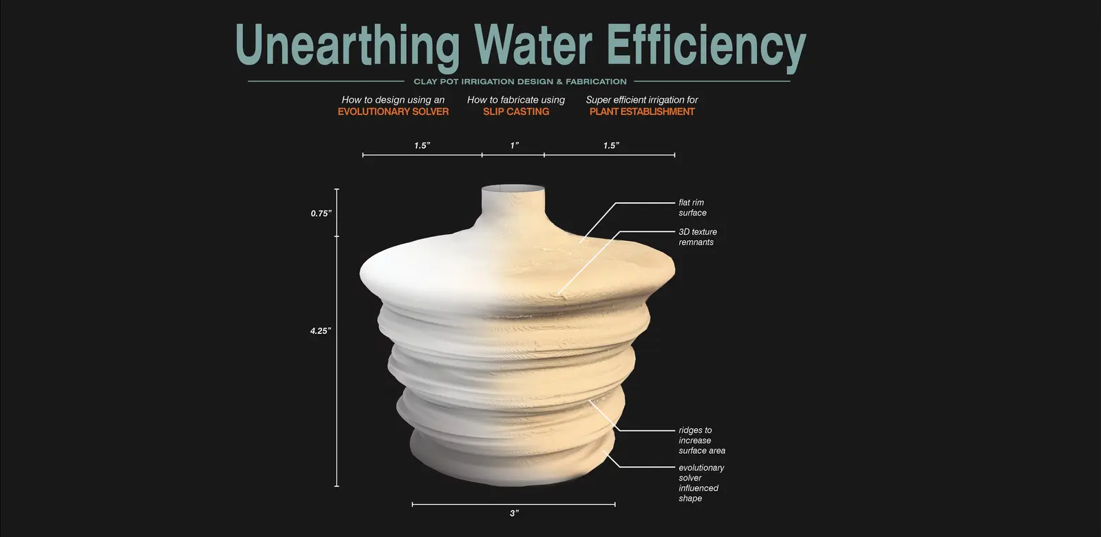 This project aimed to establish an iterative design approach using digital technologies, like 3D printing, to enhance irrigation performance, reduce water usage, and improve land management through the design of ceramic clay pots. While clay pots could be purchased, 3D printers provided opportunities for exploring pot design and efficiency. Multiple casts of homogenous pots were made using 3D-printed PLA master molds, ensuring greater accuracy and reproducibility. The slip casting technique enabled the creation of complex shapes not achievable with conventional methods.