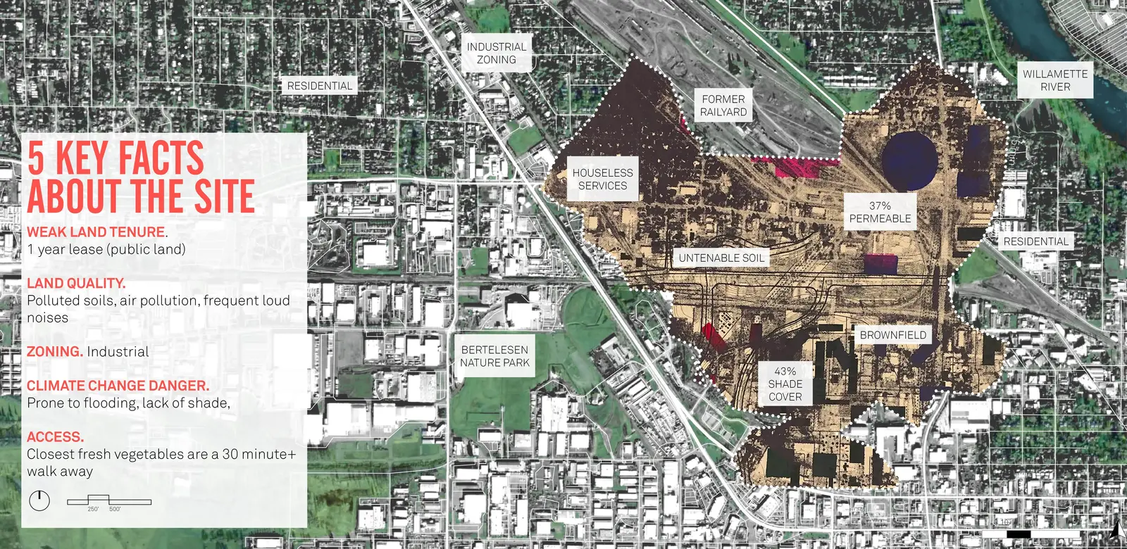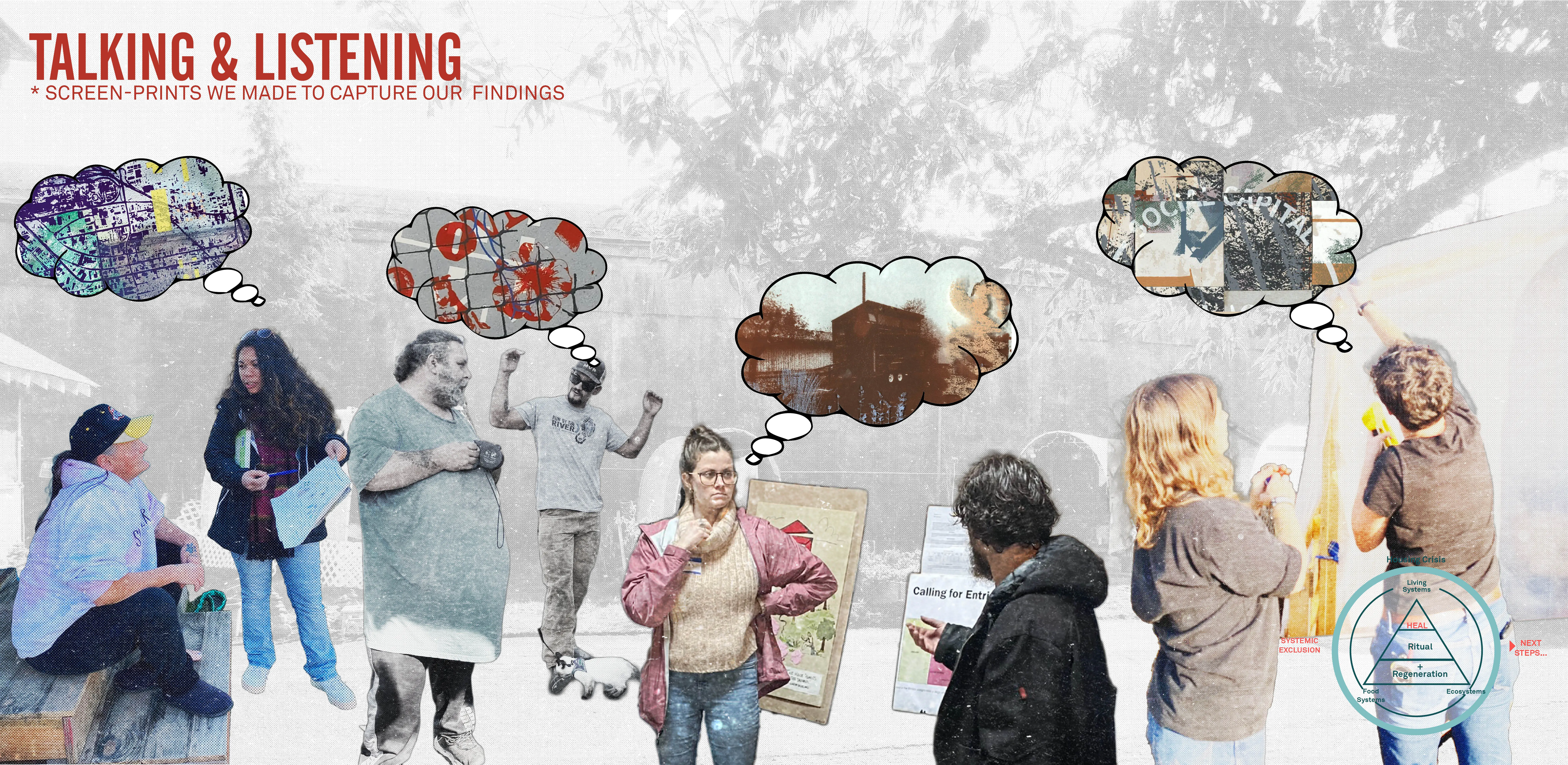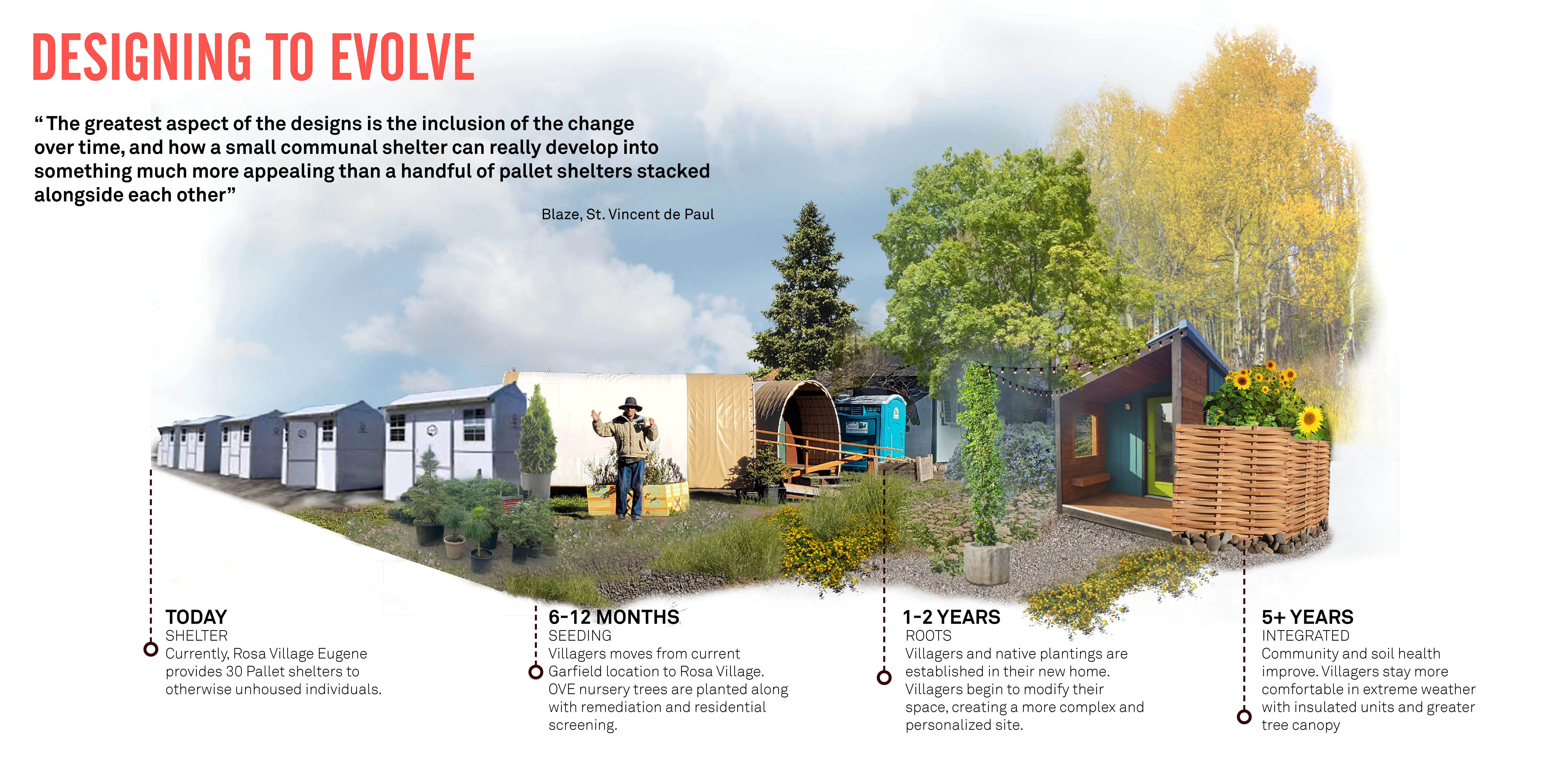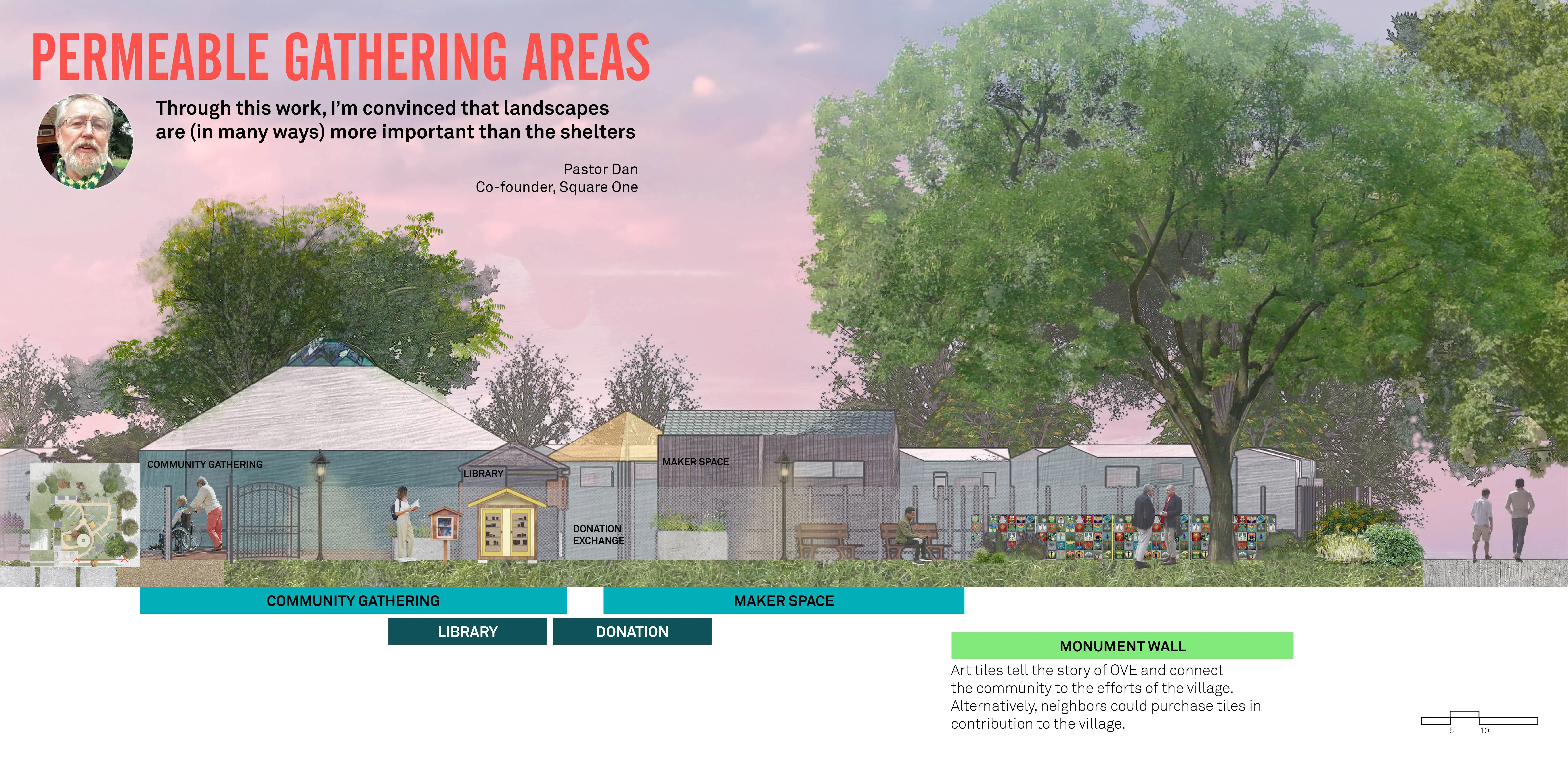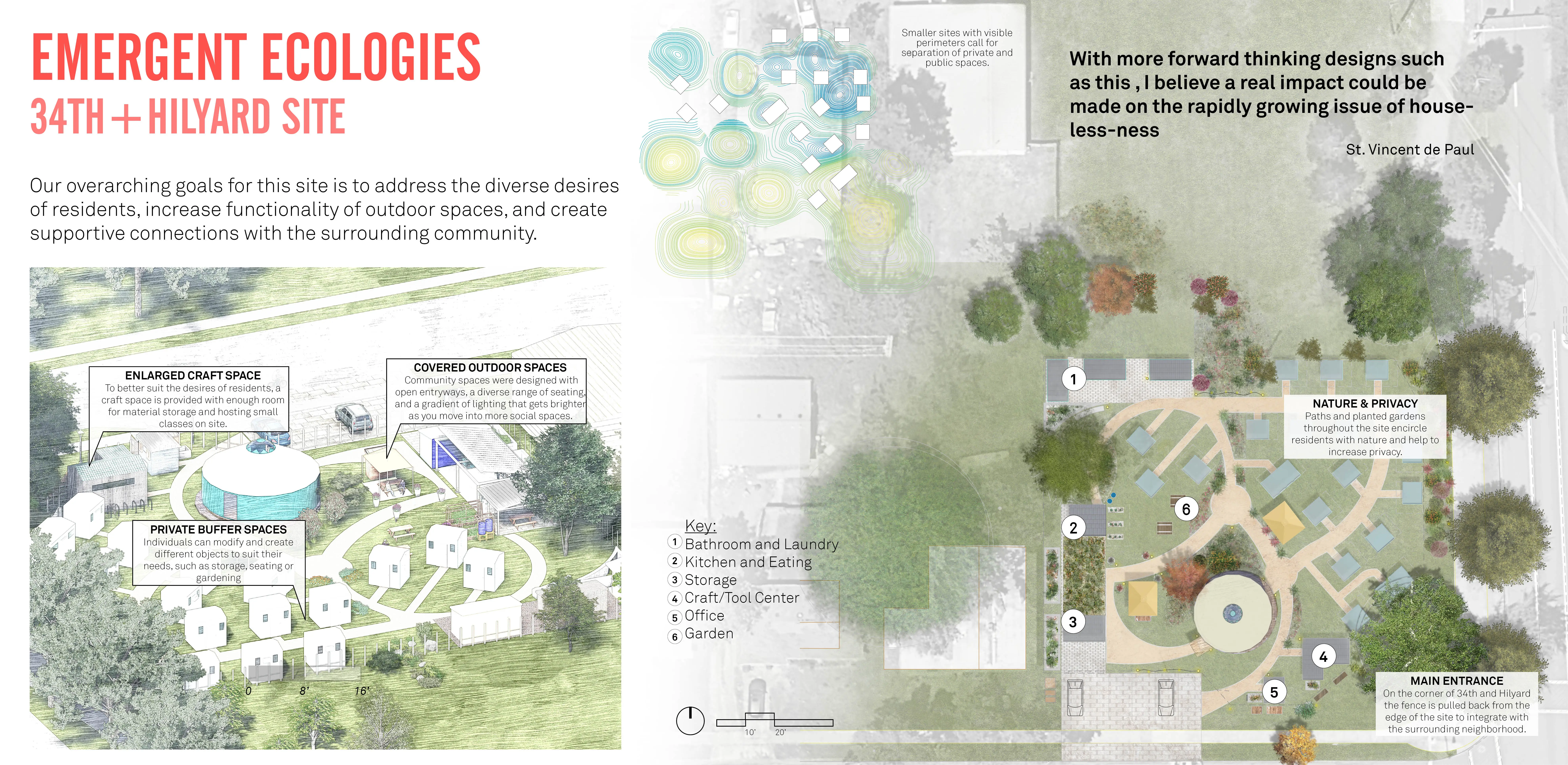 The lease is up. Opportunity Village Eugene (OVE), a tiny home community for otherwise houseless individuals and couples in Eugene must move the year. Located in Eugene’s (OR) industrial zone since 2011, Square One’s Opportunity Village is a unique collaboration between the housed and un-housed. Based on self-governance, partnership, and broad-based support, OVE has a unique approach to the houseless crisis. Our work this year considered how these values can manifest at the new site aesthetically, ecologically, culturally, and economically. We studied how the unique rhythm of a tiny home /gated/ formerly homeless community can inform new frameworks, synergies, cross-fertilization, and implications for landscape architecture.