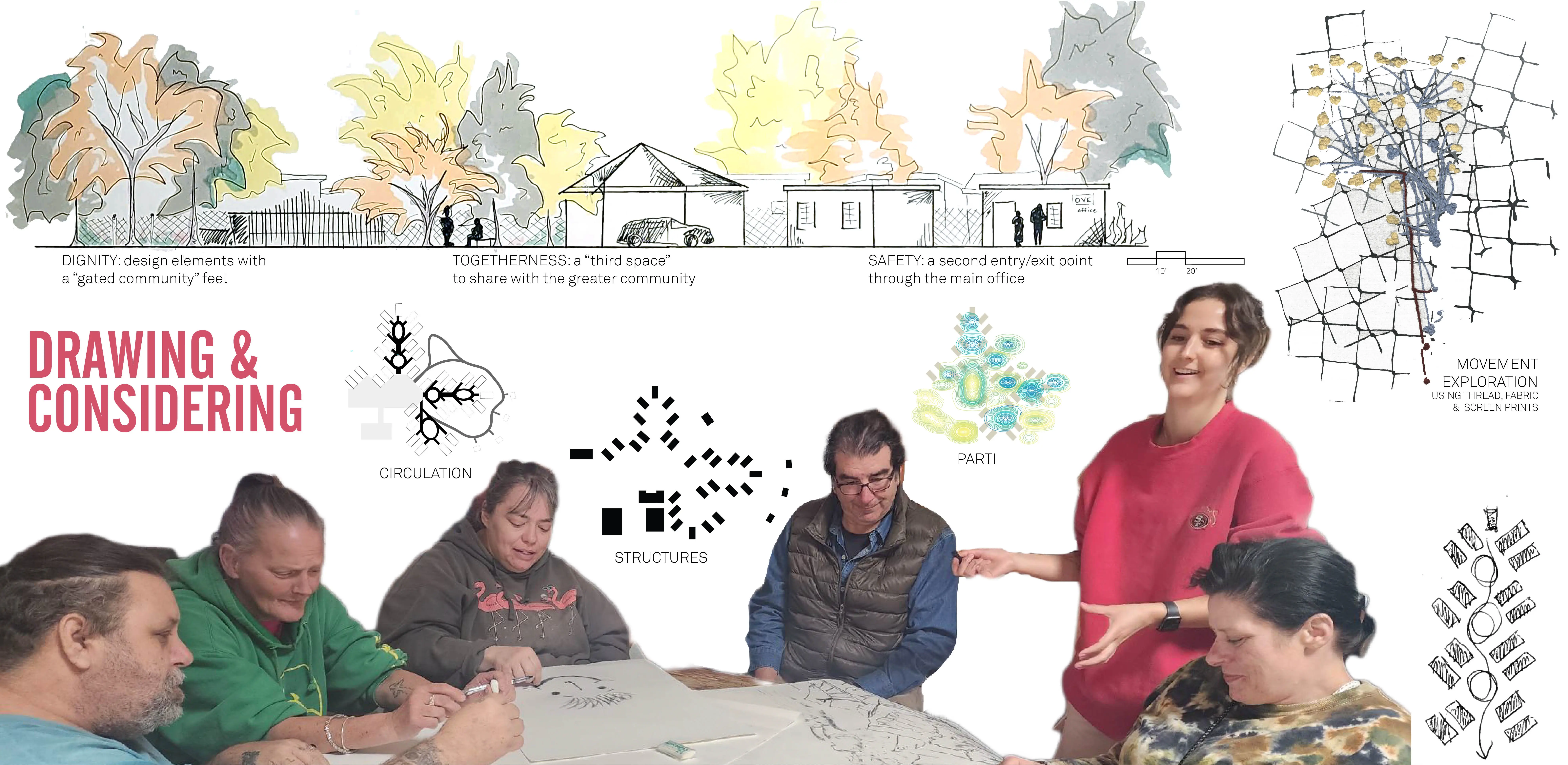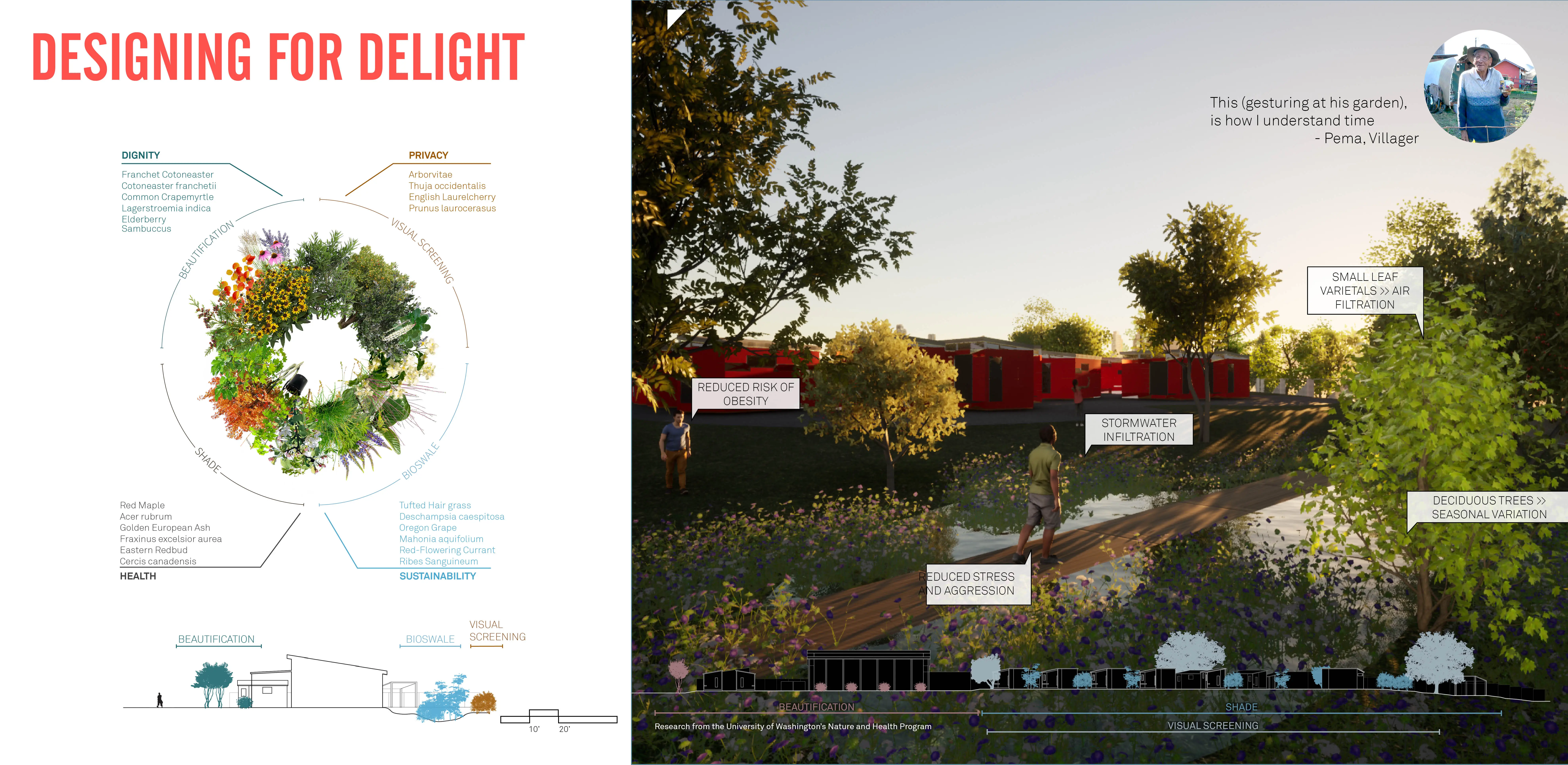 The design phase combined our education, community co-design, and the practicalities of the situation. We visited other tiny home / otherwise houseless communities. We met with the designers of pallet shelters and community supported shelters. We met with local leaders and village coordinators. We got advice from Jared McKnight (2021 ASLA Student Award Winner). We learned that providing as many beds as possible, as quickly as possible, was critical. So, we created site plans that maintain 30 dwelling units per acre - while also providing villagers with needed privacy. Because city designers usually only have a few days for each design – we create multiple site plans and typologies for planting, housing, open space, lighting, and security. Knowing that transient communities are usually placed on sites with high climate change risk, we drew up designs for stormwater capture, heat mitigation, and soil remediation. To reinforce the value of landscape - we clearly listed the multitude of design benefits (aesthetics, economic, cultural, ecological, physically, and mentally). Finally, we developed construction documents. Our sets are currently being reviewed by a panel of people (including registered landscape architects, architects, villagers, and City officials). We are looking forward to seeing our designs be built this Fall.
