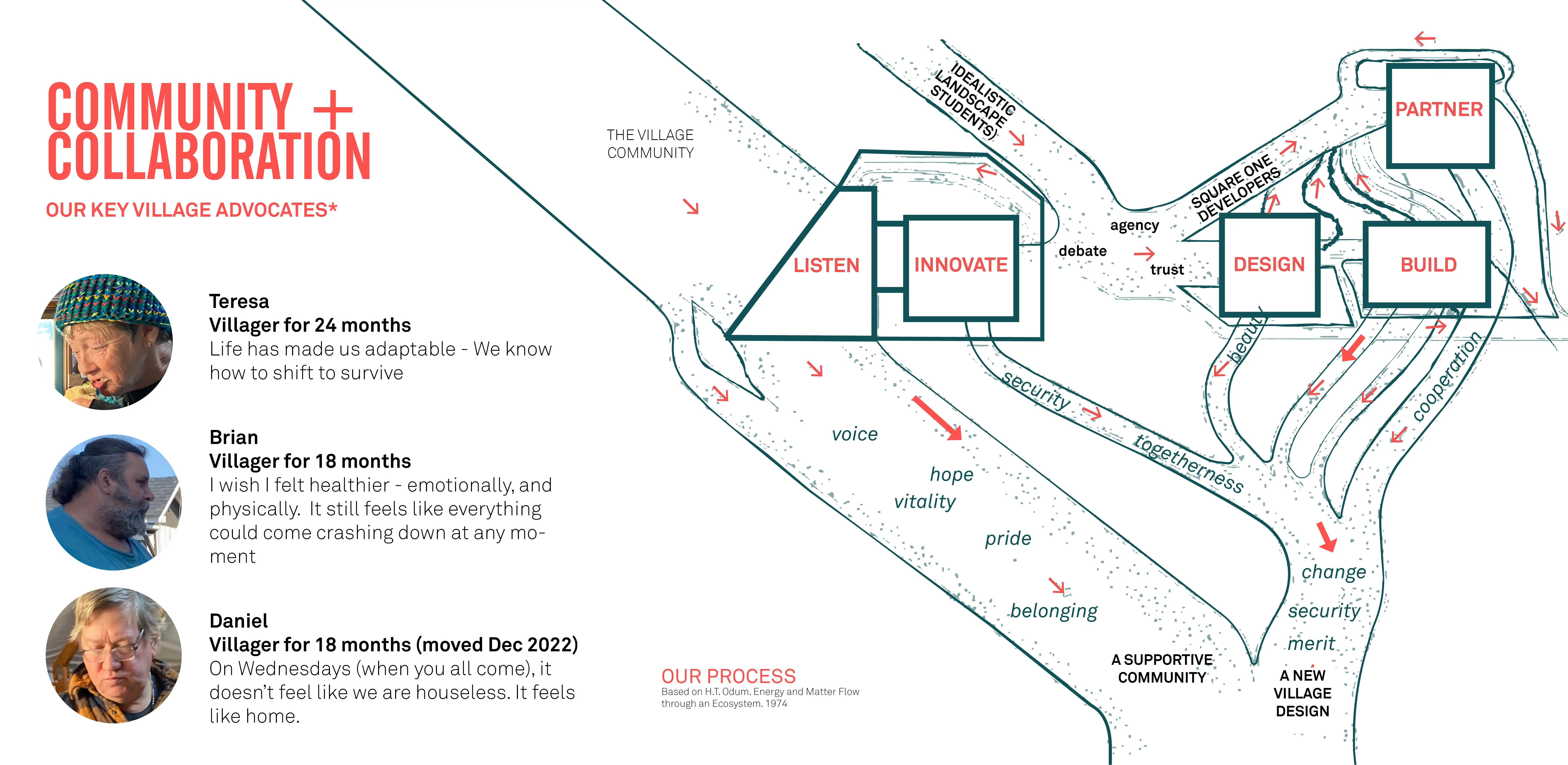 Houselessness is one of the defining crises of our time. The growing houseless crisis has affected 1 in 4 of us directly. As future landscape architects, we must use our unique ecological and cultural viewpoint to address this crisis. A real-world project, “From Shelter to Home” captures our year of work with Opportunity Village (OVE) a tiny home community for the otherwise houseless. With community partnership, we sought to understand how landscape architecture’s methods of inquiry, impact, and methods can help untangle the crisis. Our designs respond to daily routines, neighborhood concerns, and political, economic cultural practicalities. Construction planned for Fall 2023.
