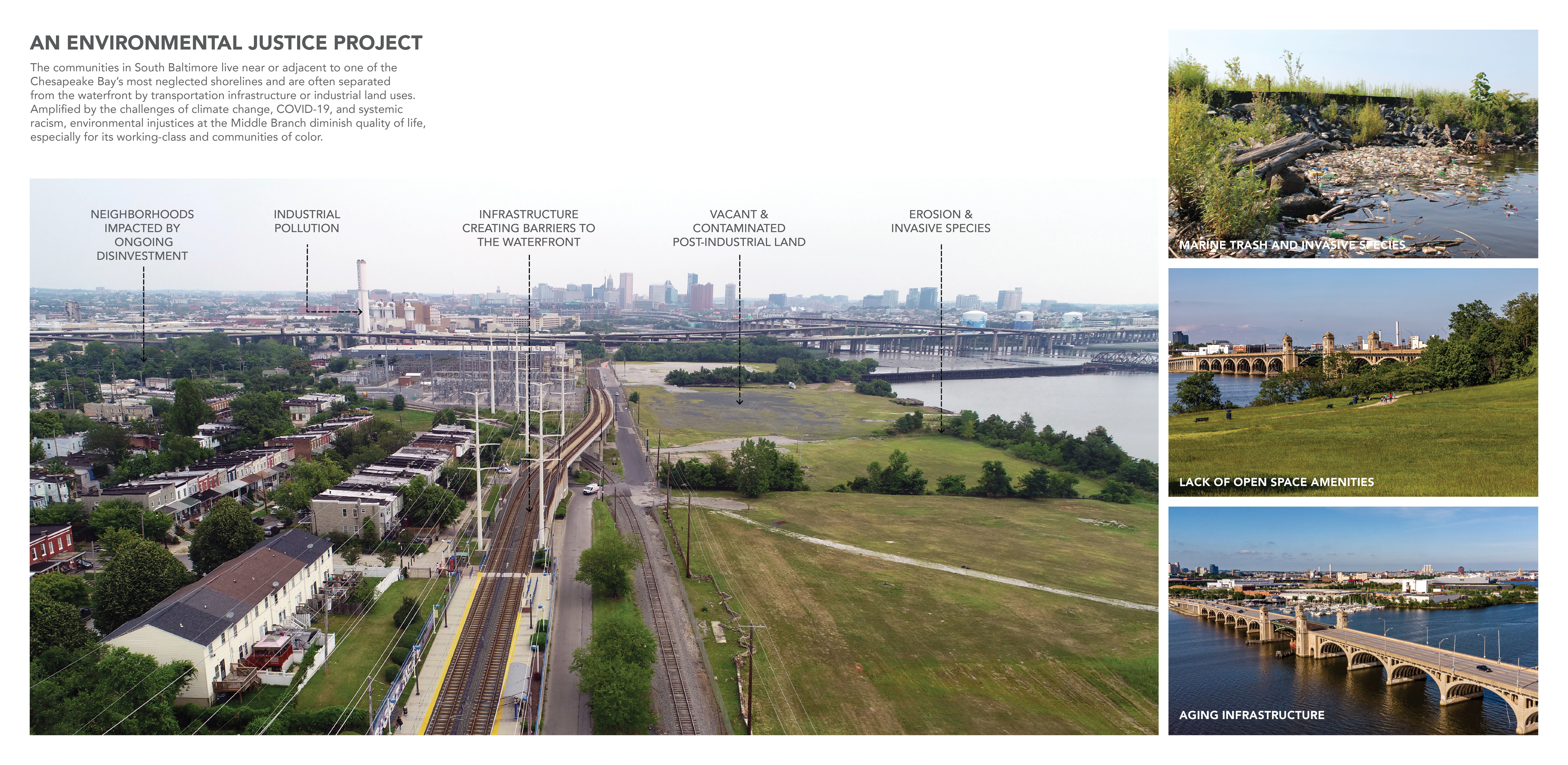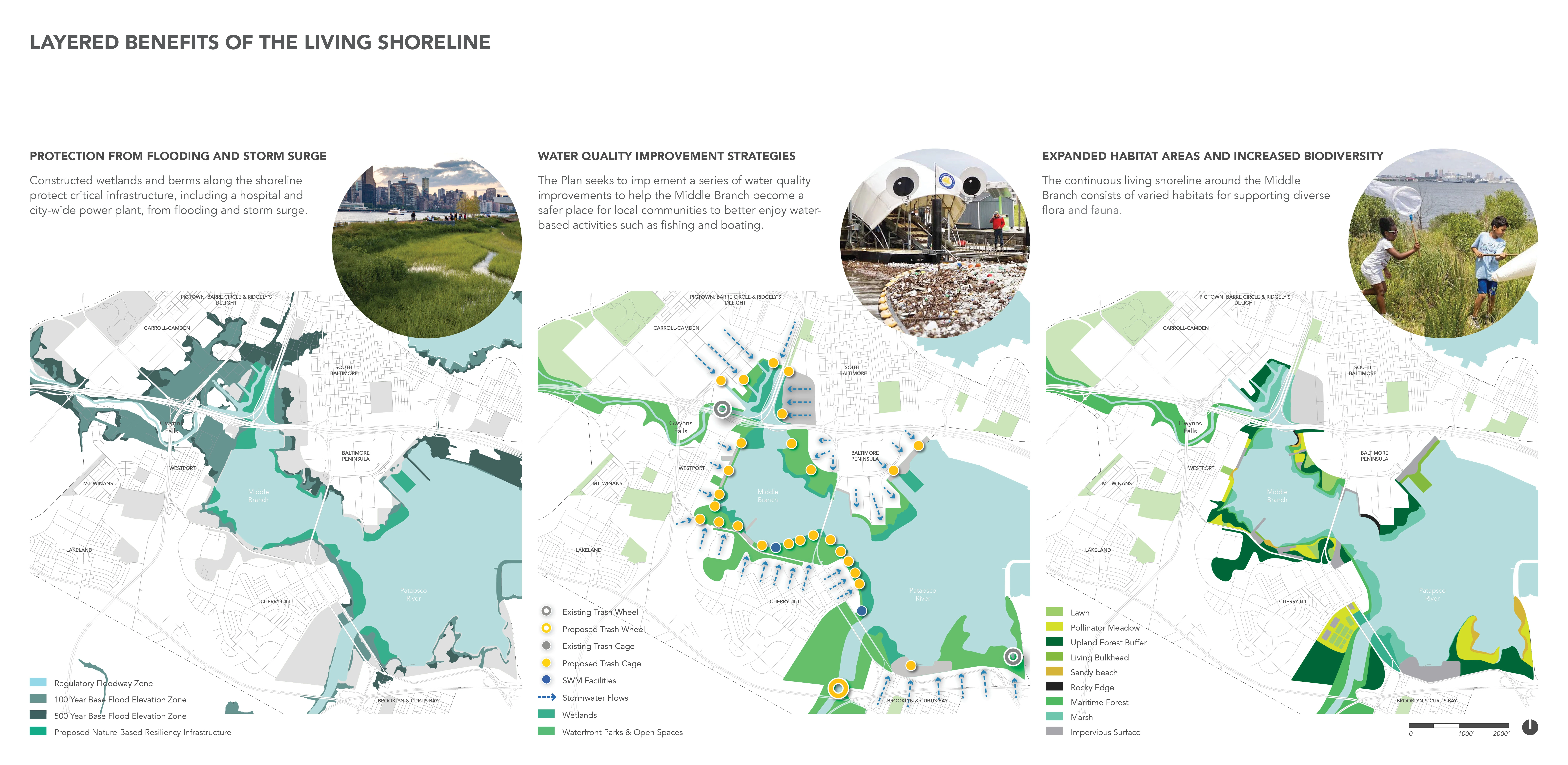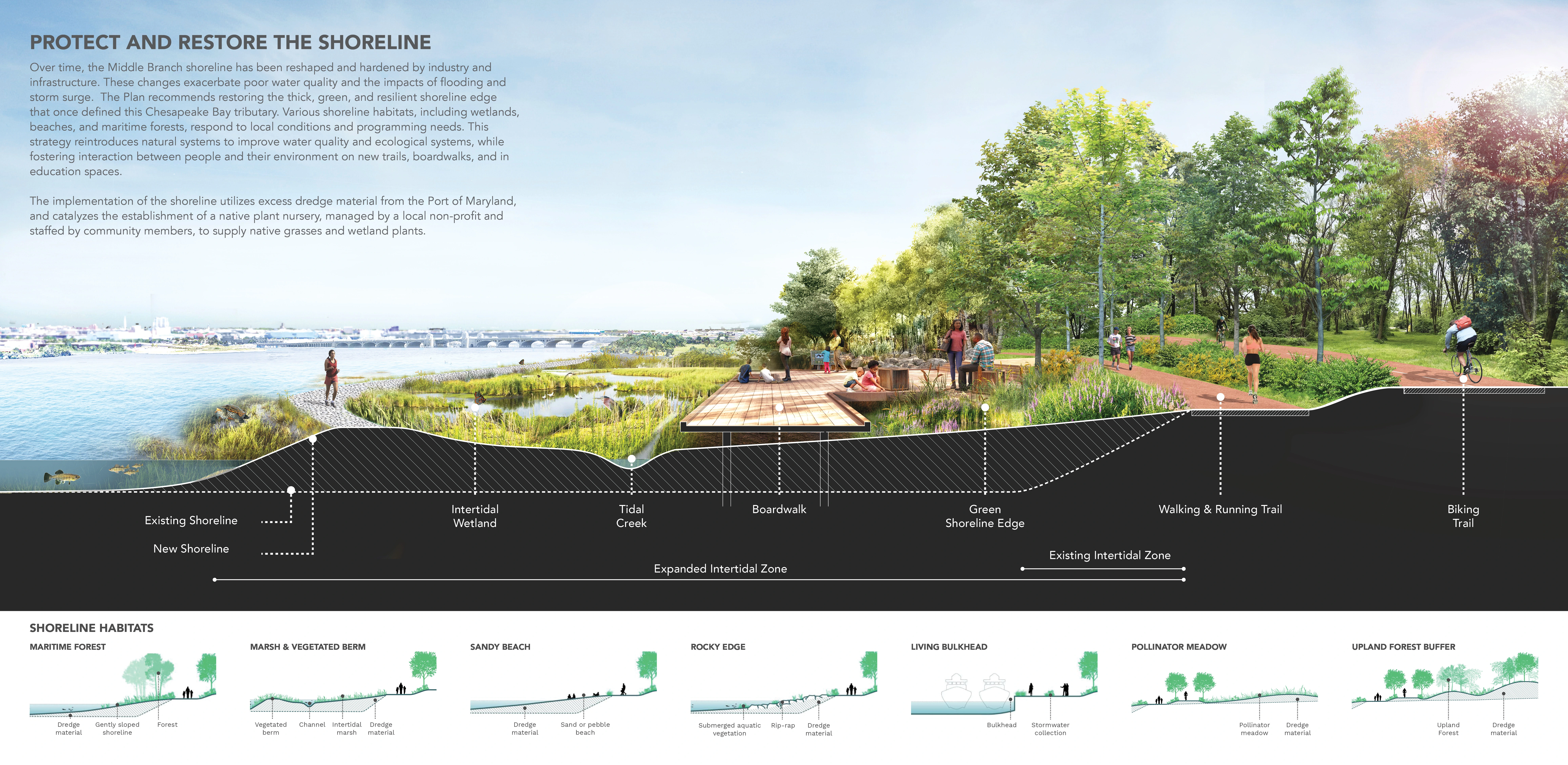 The Reimagine Middle Branch Plan presents a powerful, long-term vision to connect South Baltimore communities with one another and their waterfront. The Plan’s study area includes 11 miles of shoreline, 598 acres of parkland and 19 neighborhoods across South Baltimore. Communities there live near or adjacent to one of the Chesapeake Bay’s most neglected shorelines and are often separated from their waterfront by transportation infrastructure or industrial land uses. Amplified by the challenges of climate change and systemic racism, environmental injustices here diminish quality of life, especially for working-class residents of color. Fundamentally about equity and justice, resilience and health, the Plan imagines a holistic transformation of place supported by new jobs, wealth generation and quality of life amenities that extend beyond the built environment. Equity Frameworks Four “Equity Frameworks” (Restore the Shoreline, Transform Barriers into Connections, Create Active & Inclusive Parks and Support Communities with Equitable Development) structure the Plan’s design vision. The equity frameworks translate community input into design, programming, development and policy recommendations to be implemented over the next two decades. Investments that include living shorelines, complete streets, recreational trails, park amenities, piers and boardwalks are concentrated in the neighborhoods which have experienced acute disinvestment. Economic development and education initiatives are integrated with public realm improvements to catalyze a holistic transformation of place. Nature-Based Solutions A deep dive into the shoreline framework illustrates the depth, detail and level of resolution achieved: Over time, the Middle Branch shoreline has been reshaped and hardened by industry and infrastructure. These changes exacerbate poor water quality and the impacts of flooding and storm surge. The Plan recommends restoring the thick, green and resilient shoreline edge that once defined this Chesapeake Bay tributary. This strategy reintroduces natural systems to improve water quality and ecological systems while fostering interaction between people and their environment on new trails, boardwalks and in education spaces. Constructed wetlands and berms along the shoreline protect critical infrastructure, including a hospital and city-wide power plant, from flooding and storm surge. The implementation of this new shoreline utilizes excess dredge material from the Port of Maryland and catalyzes the establishment of a native plant nursery managed by a local non-profit and staffed by community members to supply native grasses and wetland plants. A Community-Driven Plan Creating this compelling vision was only possible with the creative and expert input of the community. The team reached the public in creative ways, including a mobile project hub that hosted pop-up events and a curated interview series shared on the Plan’s social media channels. To embody equity, three action-oriented projects were produced during the planning process: Splash! A Community Waterfront Event, the Morgan State University Fellowship Program, and the Community Design Lab. While not traditionally included in large-scale master plans, these “catalysts” were critical to building equitable outcomes. With recent approval by the Baltimore Planning Commission, the Reimagine Middle Branch Plan is poised to deliver visionary projects and programs to South Baltimore.