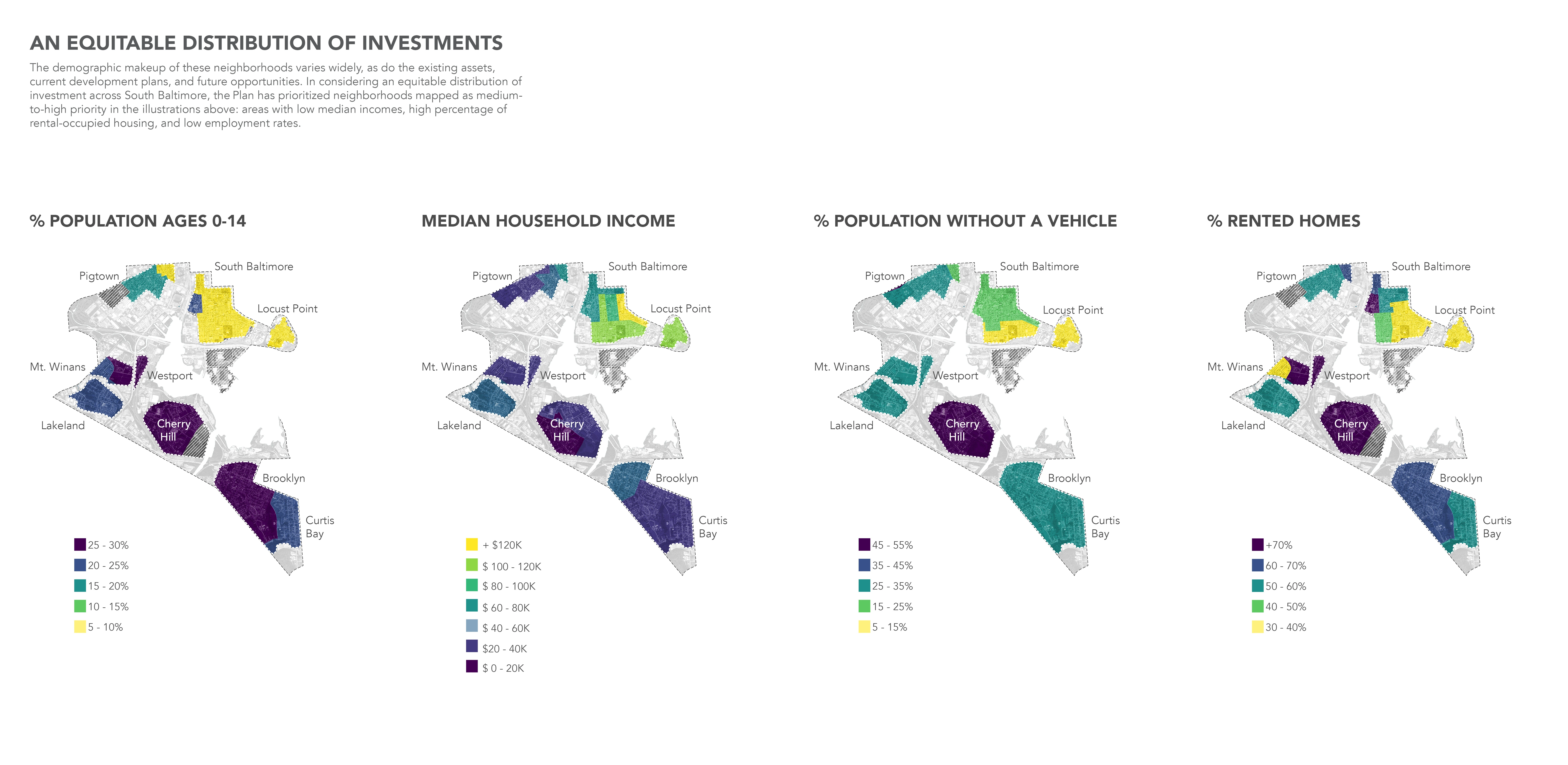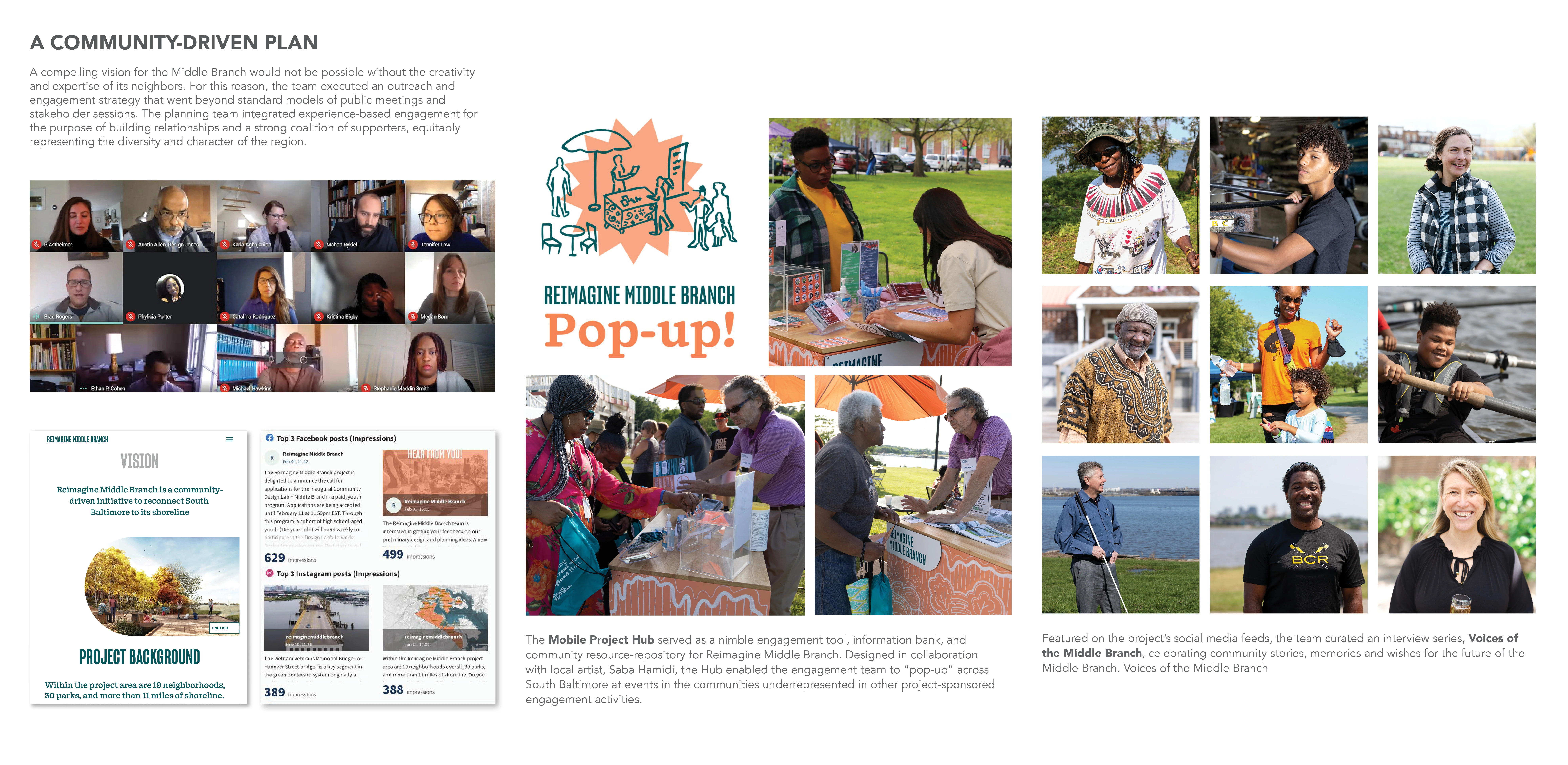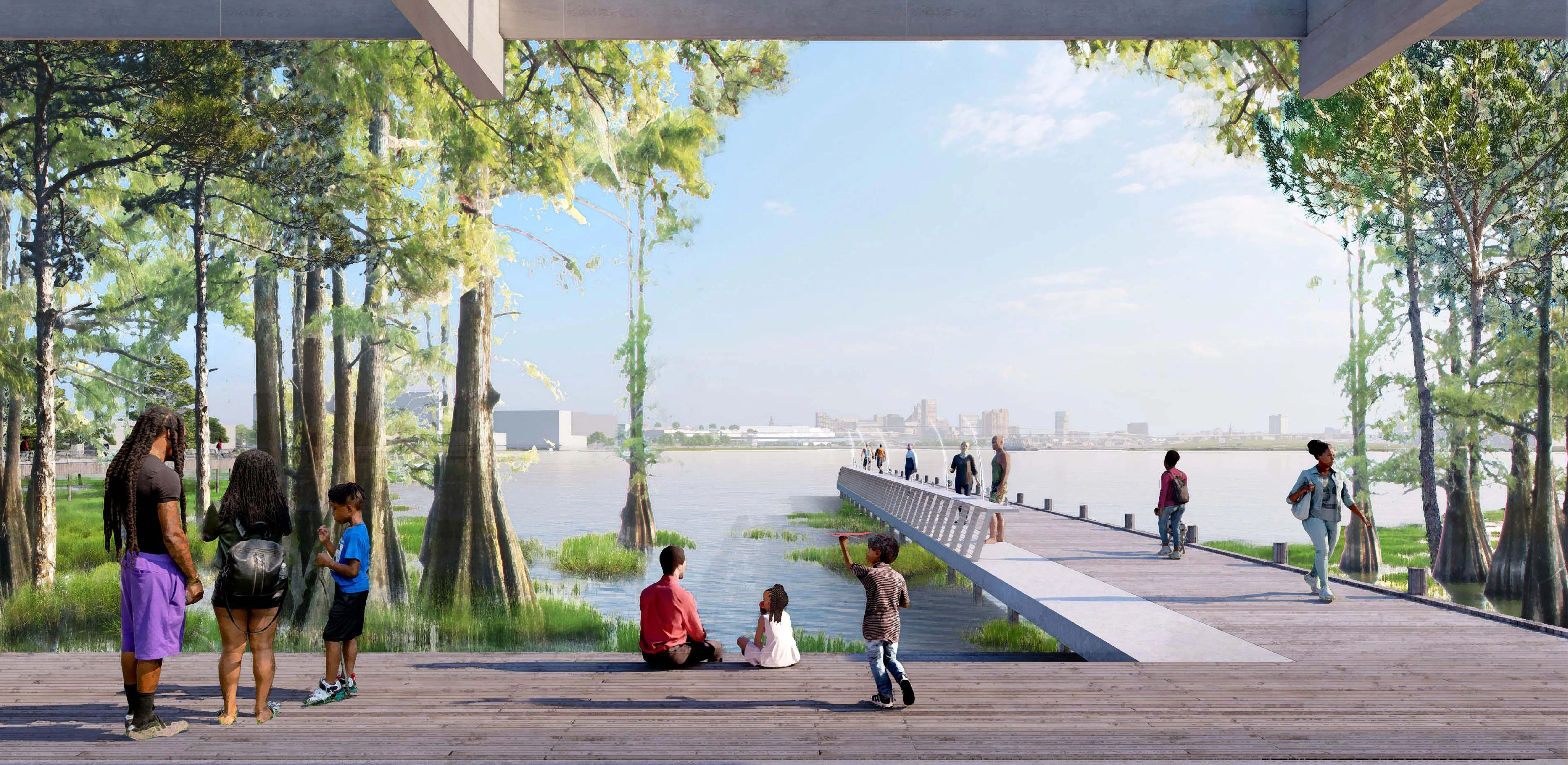 The Reimagine Middle Branch Plan presents a powerful, long-term vision to connect South Baltimore communities with one another and their waterfront. The Plan’s study area includes 11 miles of shoreline, 598 acres of parkland and 19 neighborhoods across South Baltimore. Communities there live near or adjacent to one of the Chesapeake Bay’s most neglected shorelines and are often separated from their waterfront by transportation infrastructure or industrial land uses. Amplified by the challenges of climate change and systemic racism, environmental injustices here diminish quality of life, especially for working-class residents of color. Fundamentally about equity and justice, resilience and health, the Plan imagines a holistic transformation of place supported by new jobs, wealth generation and quality of life amenities that extend beyond the built environment. Equity Frameworks Four “Equity Frameworks” (Restore the Shoreline, Transform Barriers into Connections, Create Active & Inclusive Parks and Support Communities with Equitable Development) structure the Plan’s design vision. The equity frameworks translate community input into design, programming, development and policy recommendations to be implemented over the next two decades. Investments that include living shorelines, complete streets, recreational trails, park amenities, piers and boardwalks are concentrated in the neighborhoods which have experienced acute disinvestment. Economic development and education initiatives are integrated with public realm improvements to catalyze a holistic transformation of place. Nature-Based Solutions A deep dive into the shoreline framework illustrates the depth, detail and level of resolution achieved: Over time, the Middle Branch shoreline has been reshaped and hardened by industry and infrastructure. These changes exacerbate poor water quality and the impacts of flooding and storm surge. The Plan recommends restoring the thick, green and resilient shoreline edge that once defined this Chesapeake Bay tributary. This strategy reintroduces natural systems to improve water quality and ecological systems while fostering interaction between people and their environment on new trails, boardwalks and in education spaces. Constructed wetlands and berms along the shoreline protect critical infrastructure, including a hospital and city-wide power plant, from flooding and storm surge. The implementation of this new shoreline utilizes excess dredge material from the Port of Maryland and catalyzes the establishment of a native plant nursery managed by a local non-profit and staffed by community members to supply native grasses and wetland plants. A Community-Driven Plan Creating this compelling vision was only possible with the creative and expert input of the community. The team reached the public in creative ways, including a mobile project hub that hosted pop-up events and a curated interview series shared on the Plan’s social media channels. To embody equity, three action-oriented projects were produced during the planning process: Splash! A Community Waterfront Event, the Morgan State University Fellowship Program, and the Community Design Lab. While not traditionally included in large-scale master plans, these “catalysts” were critical to building equitable outcomes. With recent approval by the Baltimore Planning Commission, the Reimagine Middle Branch Plan is poised to deliver visionary projects and programs to South Baltimore.