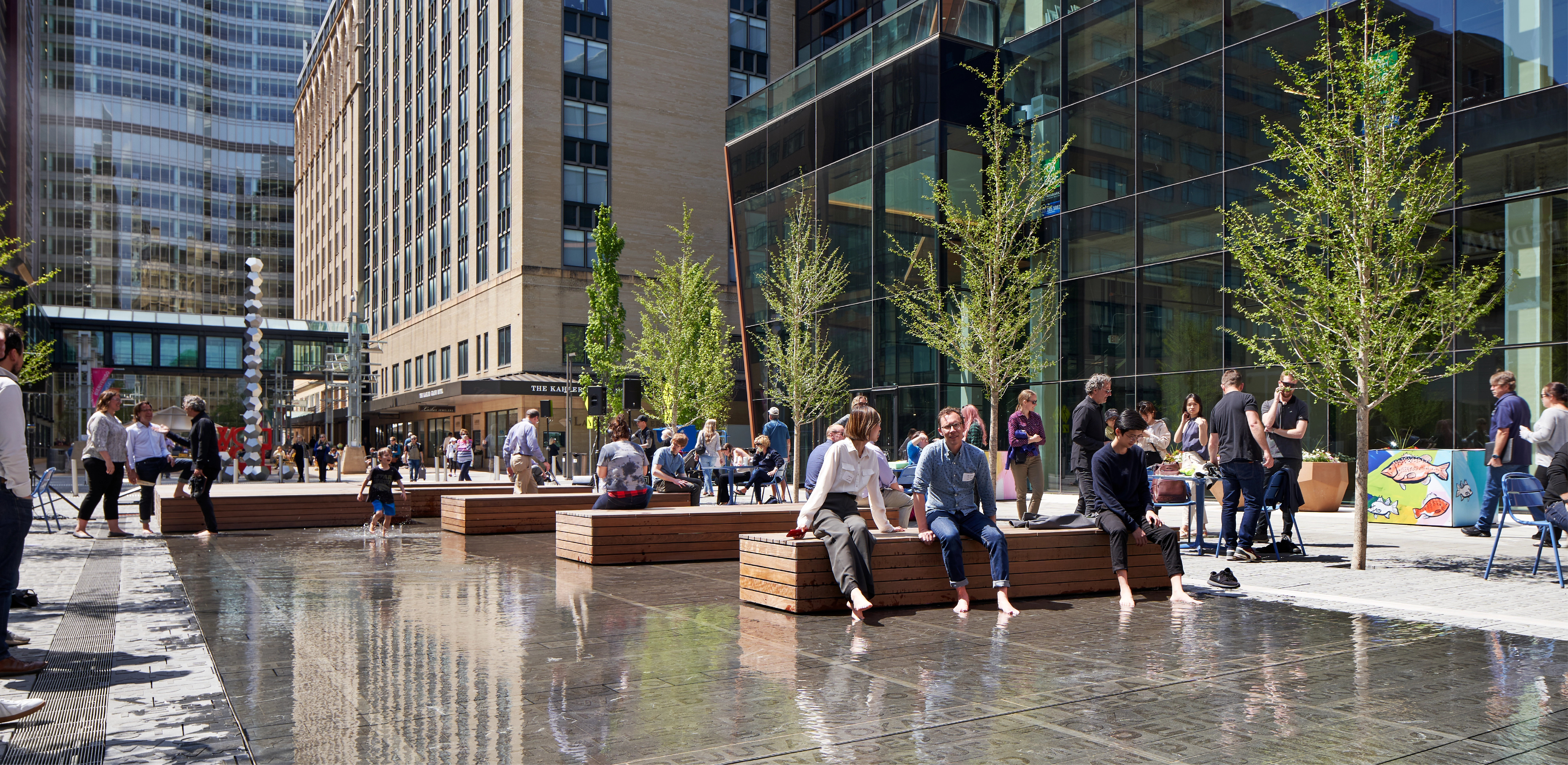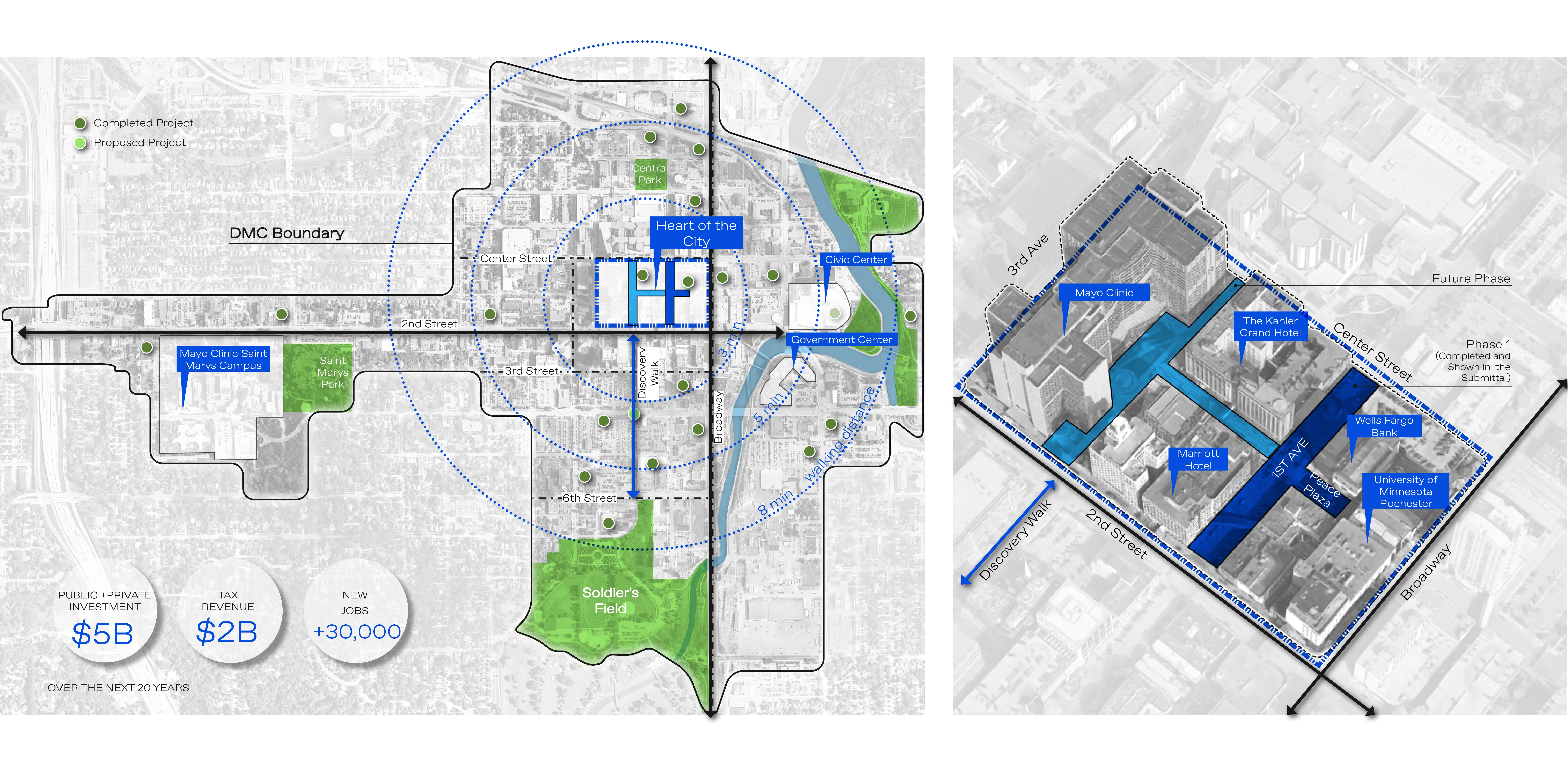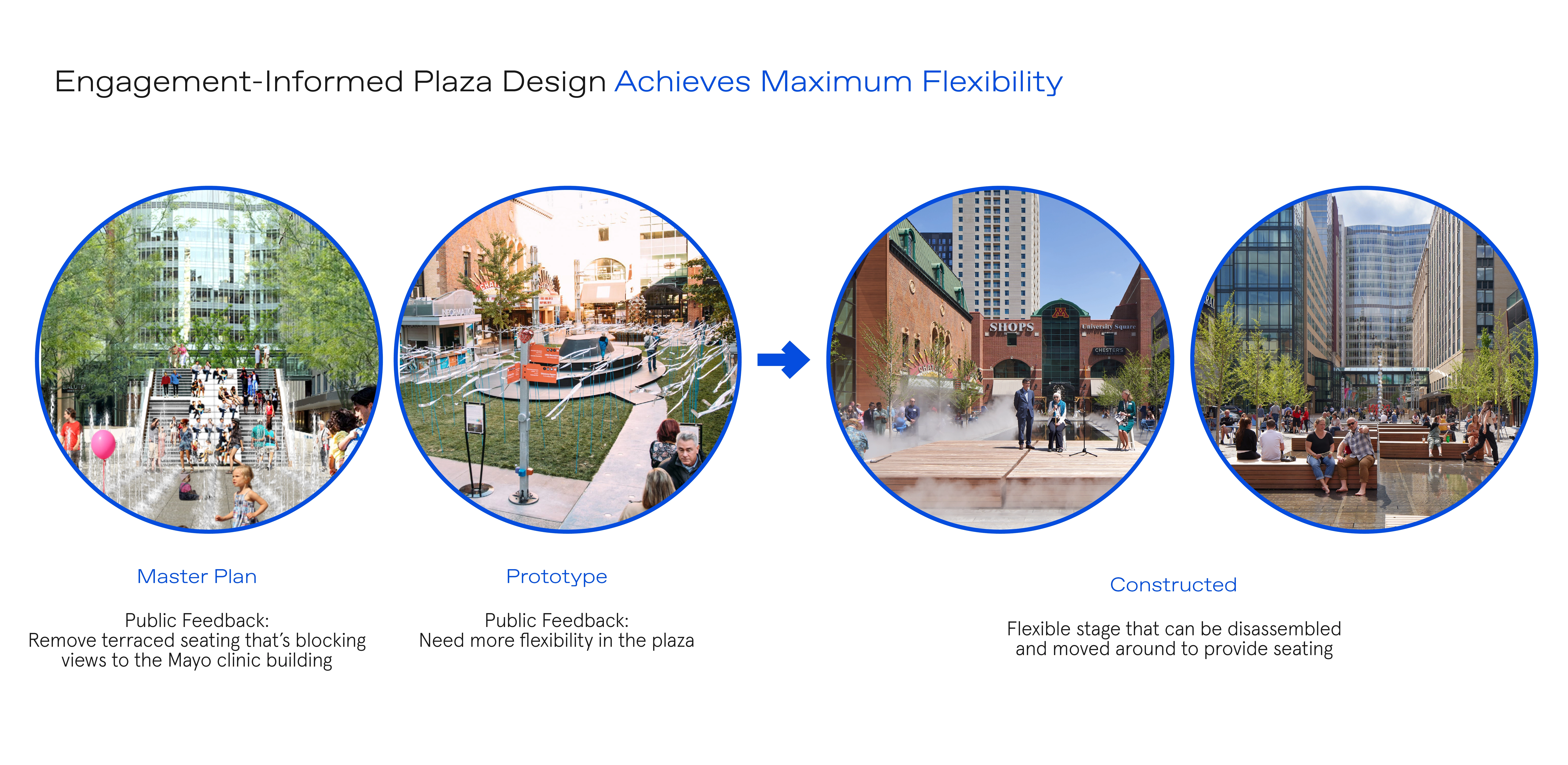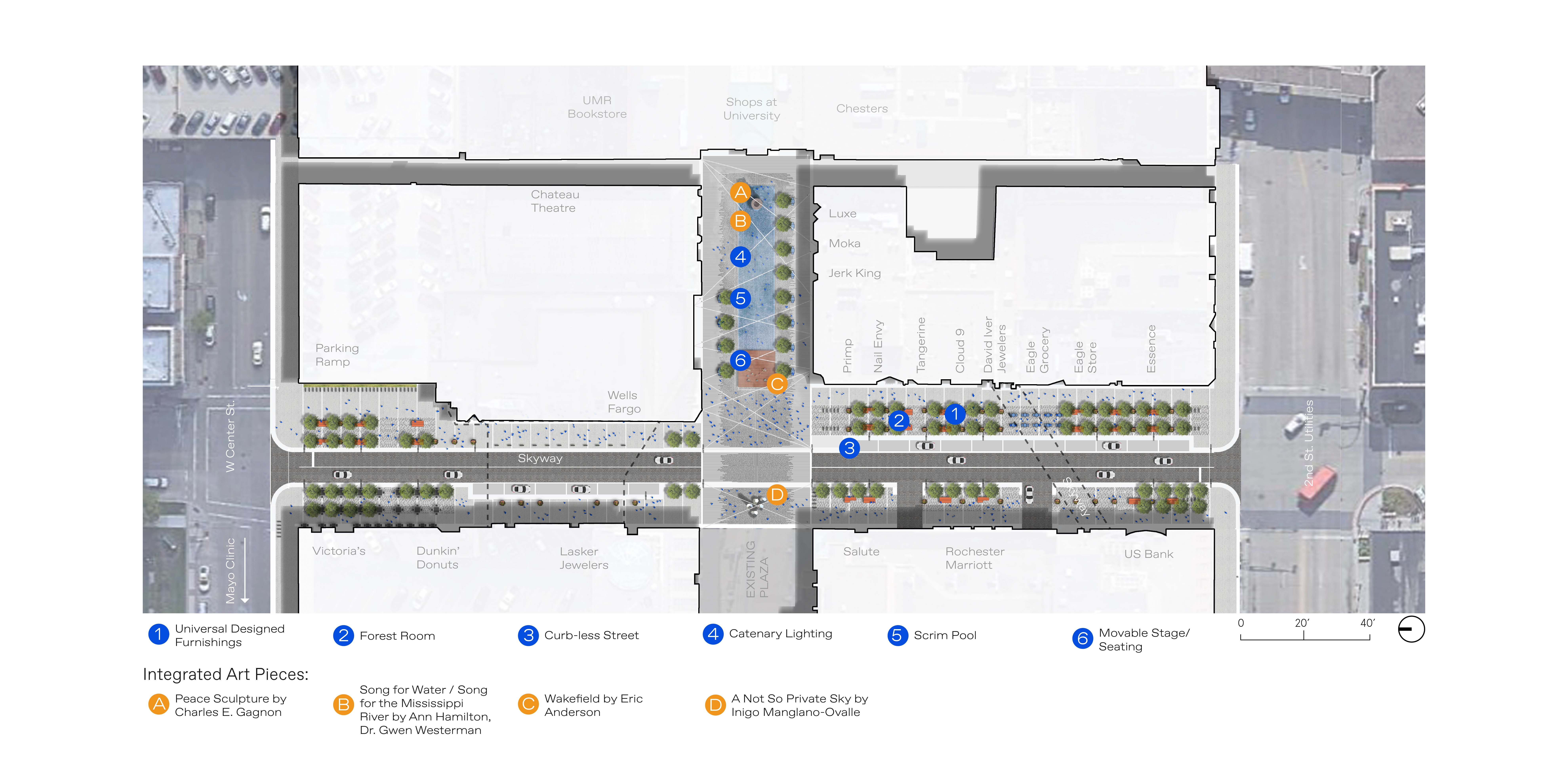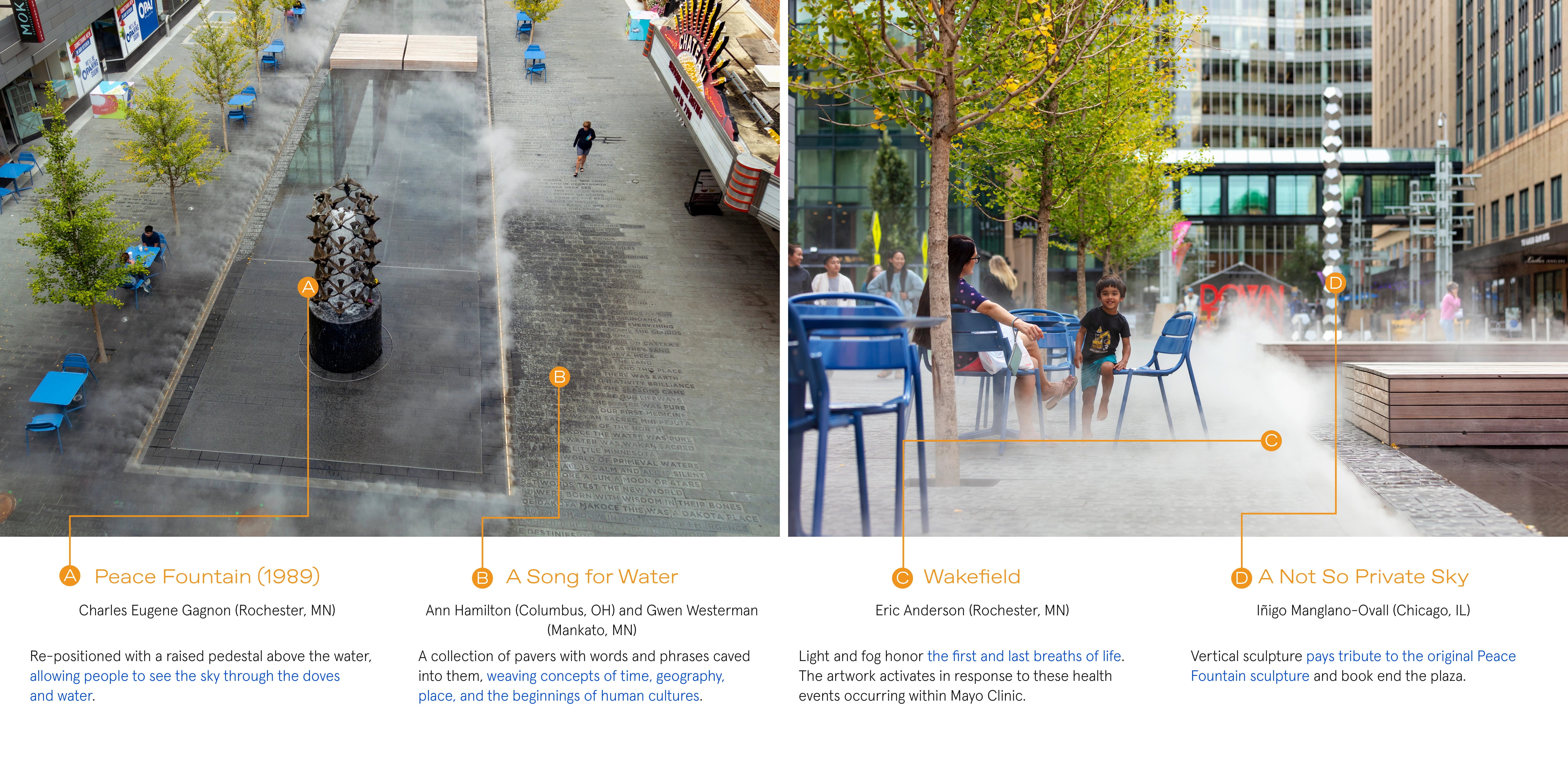 This project re-imagines the car-centric streetscape of two city blocks and a plaza. The new public realm aligns with the city’s vibrant community that welcomes millions of guests each year (Mayo Clinic patients and their families). Our client, Destination Medical Center (DMC), is a non-profit organization implementing a $5.6 billion, 20-year economic development initiative. Heart of the City is Phase 1 of a public realm master plan. Since opening May 2022, this project has fulfilled its main goal of activating downtown Rochester. The plaza has held 100+ events, and averages 2,500+ daily pedestrians. Design Solution: The project site is adjacent to the Mayo Clinic’s campus. The road was wide and flanked with parking; most sidewalks were not ADA accessible; and there were no gathering places. These constrained, hardscape-dominated spaces created a drab, unwelcoming experience. We transformed this area through three main design processes: Creative Community Engagement: Community engagement played a central part in understanding and addressing the needs of this project’s user groups (residents and Mayo Clinic visitors), and other stakeholders. The design team went beyond traditional engagement methods to meet the community on their terms. We held over 70 engagement sessions, including 35 one-on-one meetings with business and property-owners, 12 open house and art & design events, 12 pop-up events, 11 prototyping events, and 3 DMC discussions. During one of the first engagement sessions, we summarized the public’s core project principles: • Make It Rochester • Make It A Destination • Make It Big & Keep It Small • Reveal The Unseen • Make It About Life • Make It About Art • Make It About Healing • Make It Inviting • Embrace The North • Make It Bright • Make It Connected • Make It Green We gathered community feedback on site elements—including the desire for a performance stage. The community felt our first mock-up (a terraced viewing stage) blocked too much of the plaza. After more studies, we settled a bench system on rails that can be re-arranged to form a stage. Make It About Art: The community wanted the plaza to capture the imaginations of visitors. With the help of an art curator, we were able to integrate public art from local and internationally renowned artists. Peace Plaza acknowledges the site's history as Dakota land through Ann Hamilton’s artwork Song for Water, which embeds Dr. Gwen Westerman’s poem De Wakpa Taŋka Odowaŋ / Song for the Mississippi River into a 200-foot-long plaza. Eric Anderson’s “Wakefield” consists misting jets that are actuated by Mayo Clinic data: emitting mist for every first and last breath taken. We redesigned the plinth for Peace Sculpture (1986) so people could view the sky through the structure of overlapping doves. This sculpture informed Inigo Manglano-Ovall‘s piece, “A Not So Private Sky”. His artwork creates a vertical element made of reflective materials that offers another experience of the sky. Healthy Place for People and Nature: A Mayo Clinic ADA specialist advised on universal design. We emphasized accessible circulation and site furniture—including custom wheelchair-friendly furniture and paving patterns that are easier for visually impaired people to navigate. We planted 117 street trees using soil cell systems. Pervious pavement allows stormwater to percolate down to the cells. Heated sidewalks throughout reduce the need for ice-melting salt—reducing stress on the trees.
