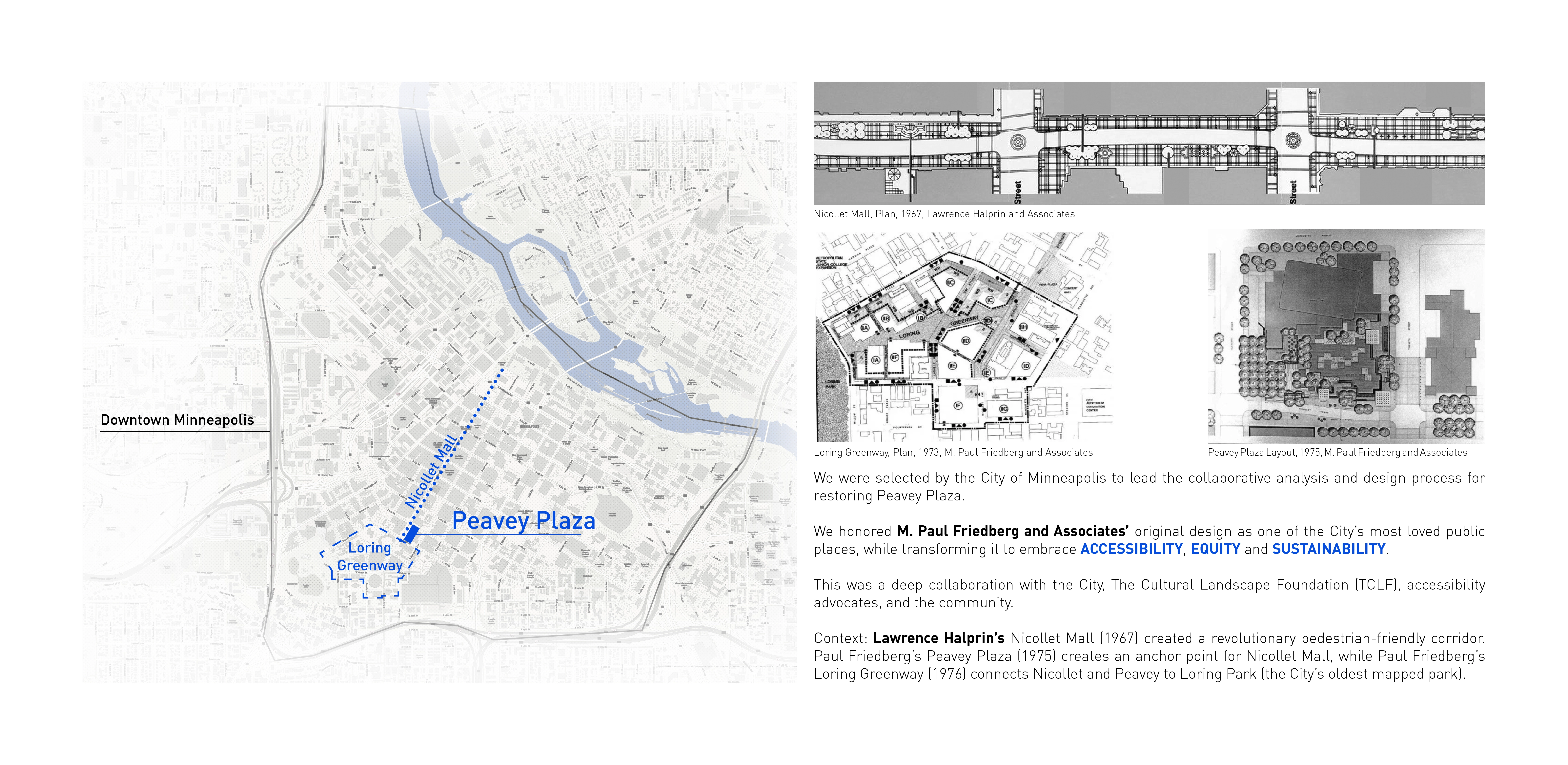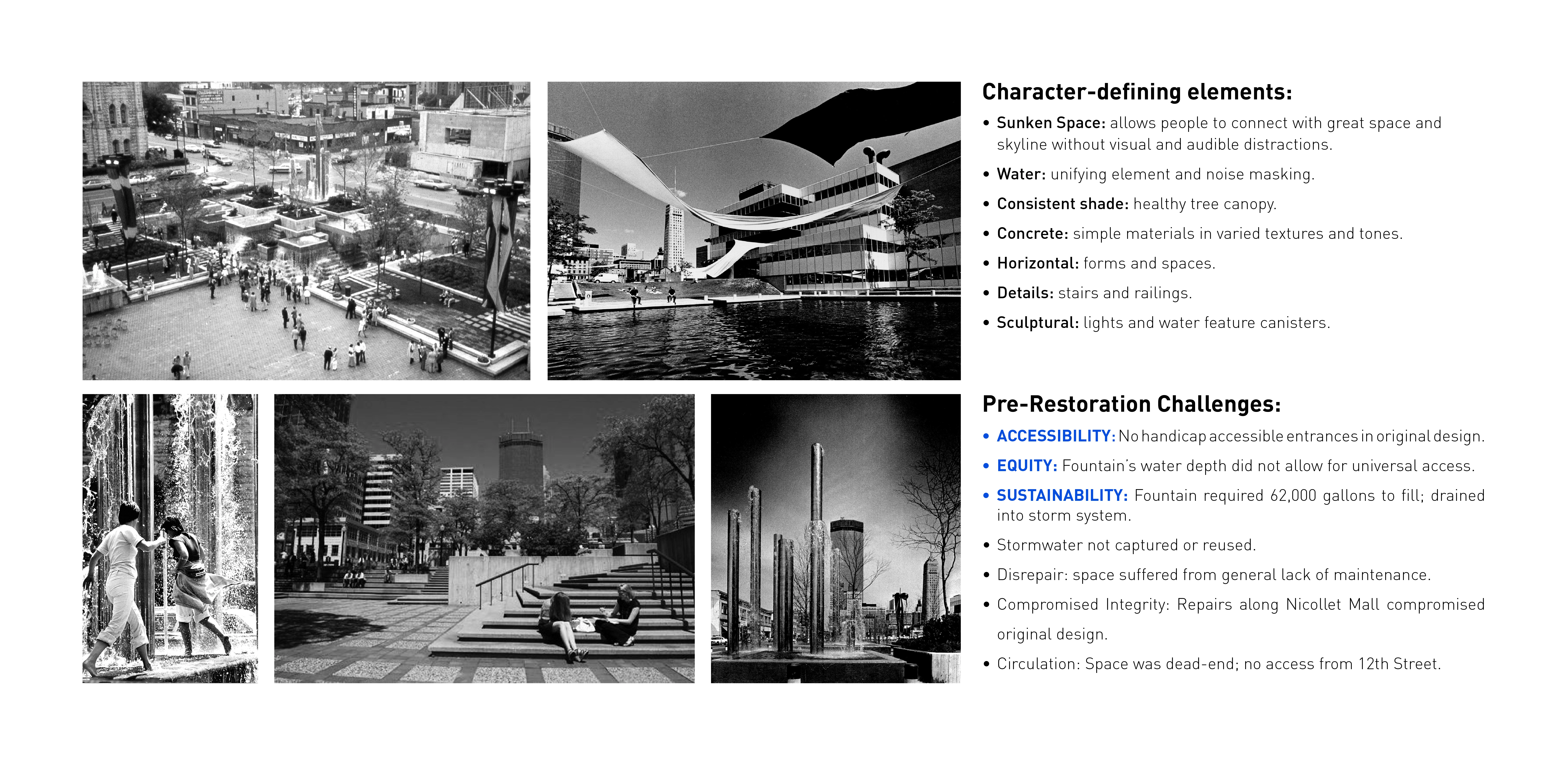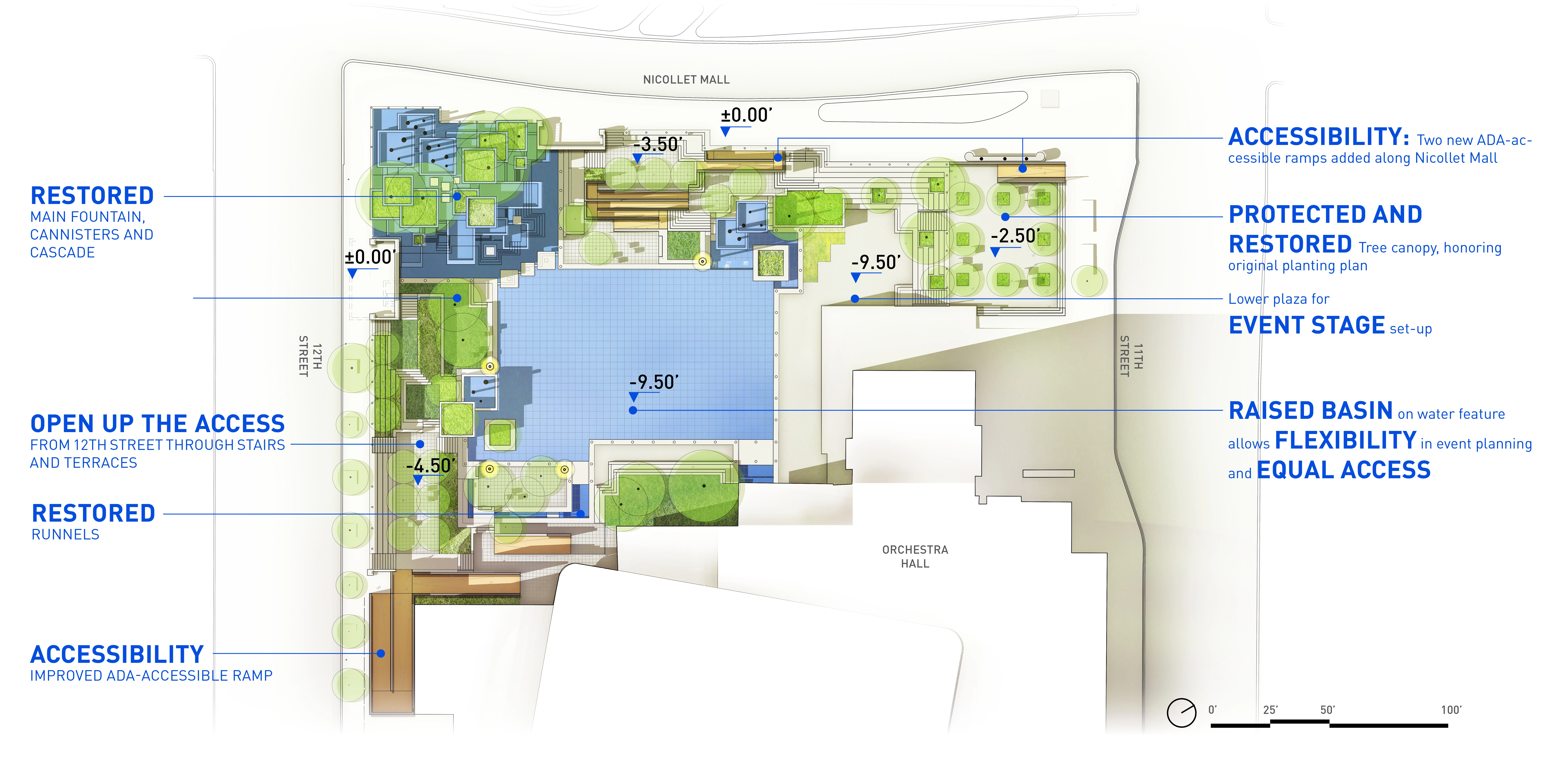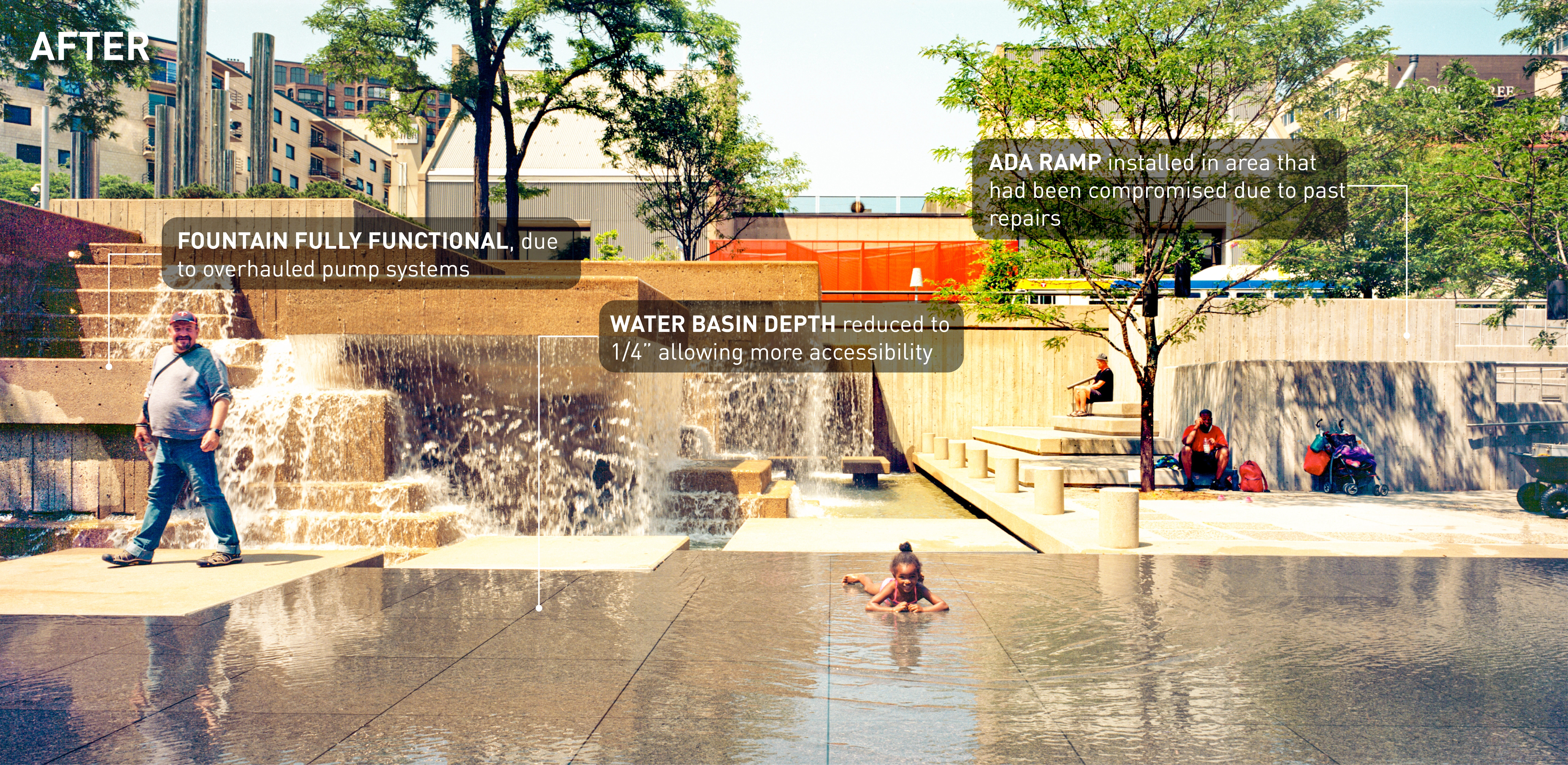 M. Paul Friedberg conceived Peavey Plaza (1975) as the “living room” of downtown Minneapolis. The iconic sunken plaza balanced the tranquility of a fountain and reflecting pool with active programming. It was the site of summer concerts and markets, winter ice skating, and provided office workers a moment of daily rejuvenation. Within a few years of opening, challenges arose. The water features’ pumps failed, while the vegetation required hard-to-access maintenance. Lawns were replaced with concrete; light fixtures failed; wooden site furnishings were painted; chemicals in the water tarnished the fountain’s stainless steel canisters. Eventually, the basin was drained and the plaza lay dormant. BUILDING CONSENSUS The project was slated for demolition. The Cultural Landscape Foundation stepped in last-minute to try to save the space through legal avenues. The plaza was saved and elevated to the National Register of Historic Places in 2013. The City of Minneapolis, with the State of Minnesota and private donors, began a revitalization process to preserve its iconic brutalist character—all while improving accessibility, equity, and sustainability. As the landscape architect, we walked a diplomatic tight-rope from the start. Some stakeholders pushed for rehabilitating the project to its original condition; however, restoring to the original design would perpetuate several issues: poor ADA accessibility, significant water waste, and safety issues. To build consensus, we assembled a technical review team comprised of historic preservationists, accessibility community representatives, safety officials, and the facility management team. REHABILITATION Restoring this brutalist design called for an intensive study of horizontal planes, overlapping concrete terraces, and board-formed walls. The restored cascading fountains and vegetation create a sense of renewal and revitalization. Custom pavers were developed to replicate originals. Some terraced lawns were restored, while other terraces were converted to permeable pavers to create an accessible surface that also supports the stormwater strategy. Site furniture, stainless steel canisters, and light fixtures were all either restored or recreated. EQUAL ACCESS We placed new accessibility ramps in areas already compromised due to failing non-historic CMU walls. A new entrance from Nicollet Mall is comprised of 4% sloped walkways connecting all existing terraces. By utilizing board-formed concrete finishes, mimicking the horizontal planes, and weaving the walkways within the existing fabric, it is difficult to tell where the new design begins and original ends. Raising the basin enhanced accessibility and created a more vibrant public realm. However, raising the basin disturbed the reflecting pool. Through careful technical coordination, prototyping, and consensus-building, the strategy assured the impact and corresponding aesthetics were appropriate for the site. SUSTAINABILITY Through permeable pavers, lawn, and below-ground storage, 95% of stormwater is captured and infiltrated where it lands. Void space below the scrim surface holds stormwater for reuse. Reducing the basin water depth from 10” to 1/4” reduced the total required volume from 62,000 gallons to 14,000 gallons. The basin originally took days to fill or drain, and all water drained to the storm sewer. Now, the basin can fill in 15 minutes and drain in an hour—quickly transitioning from reflecting pool to programmed plaza.