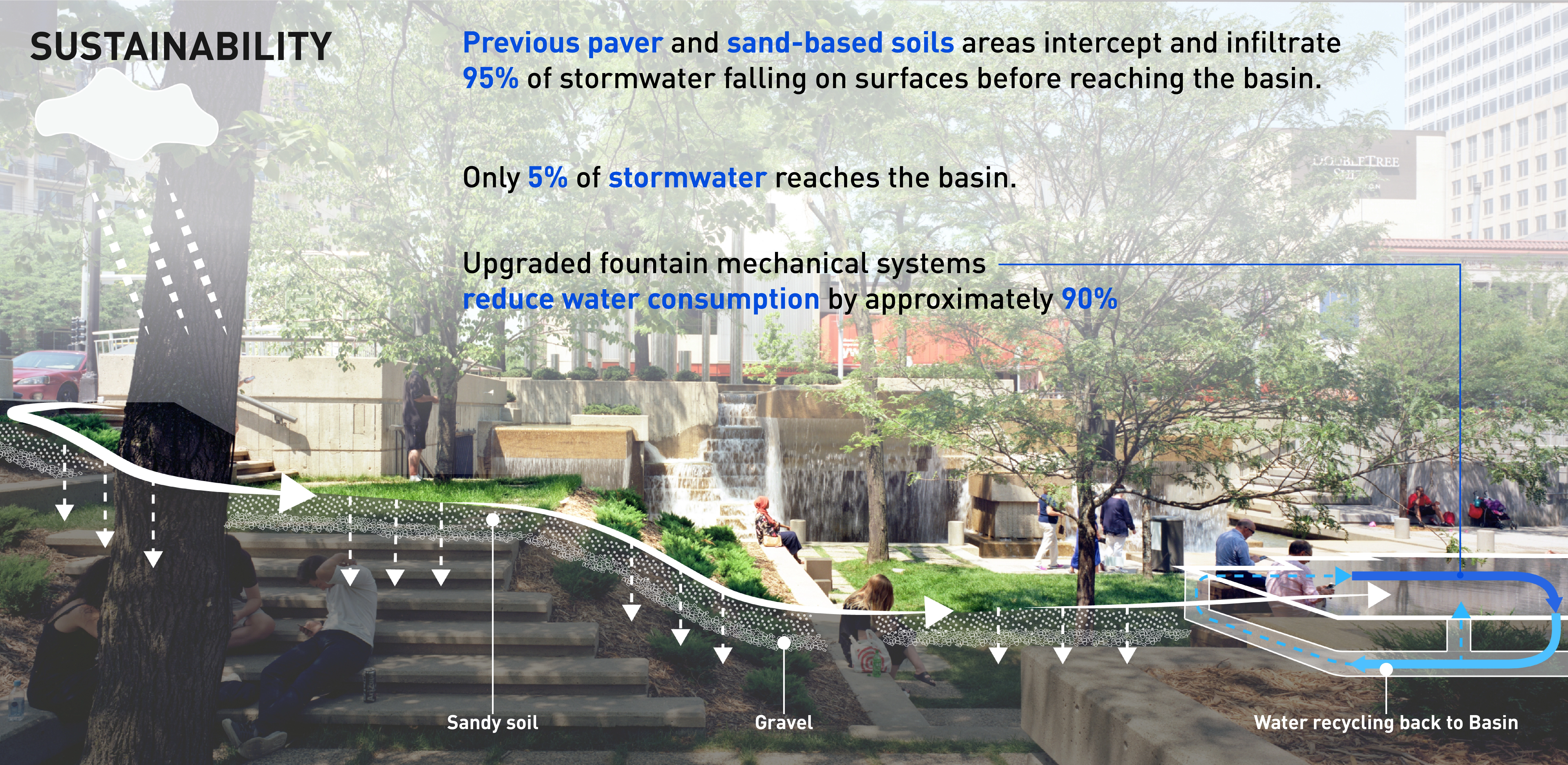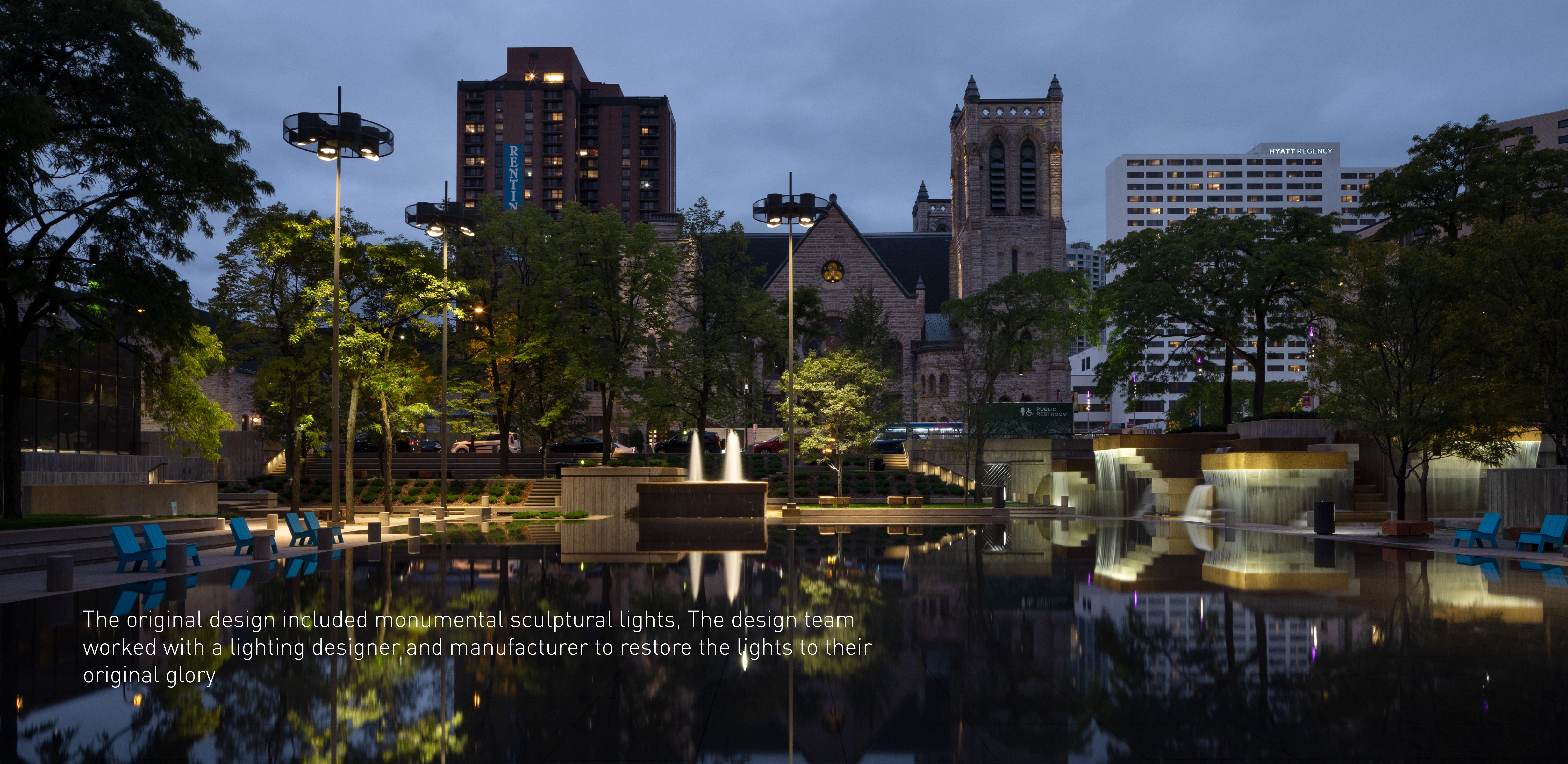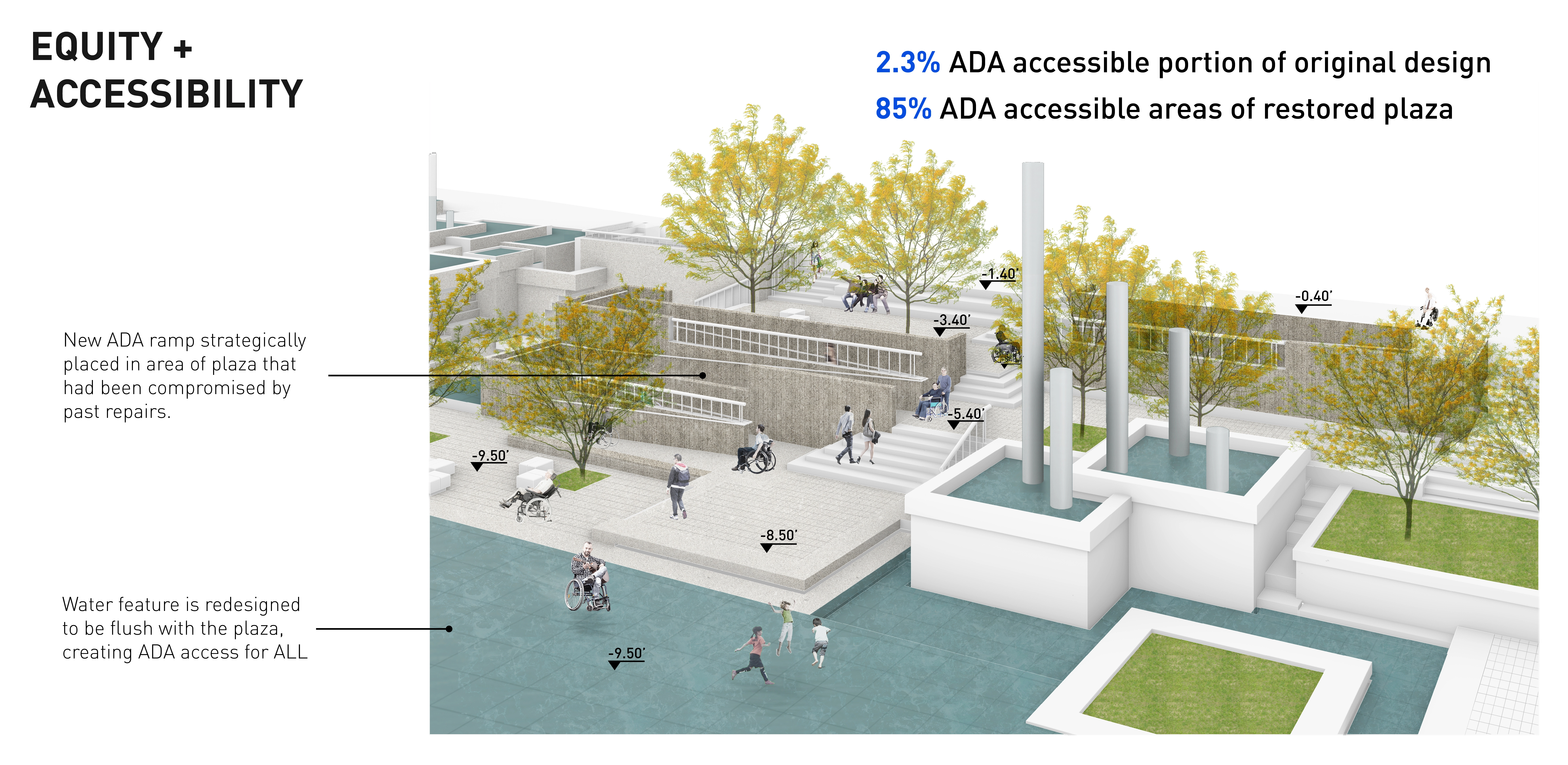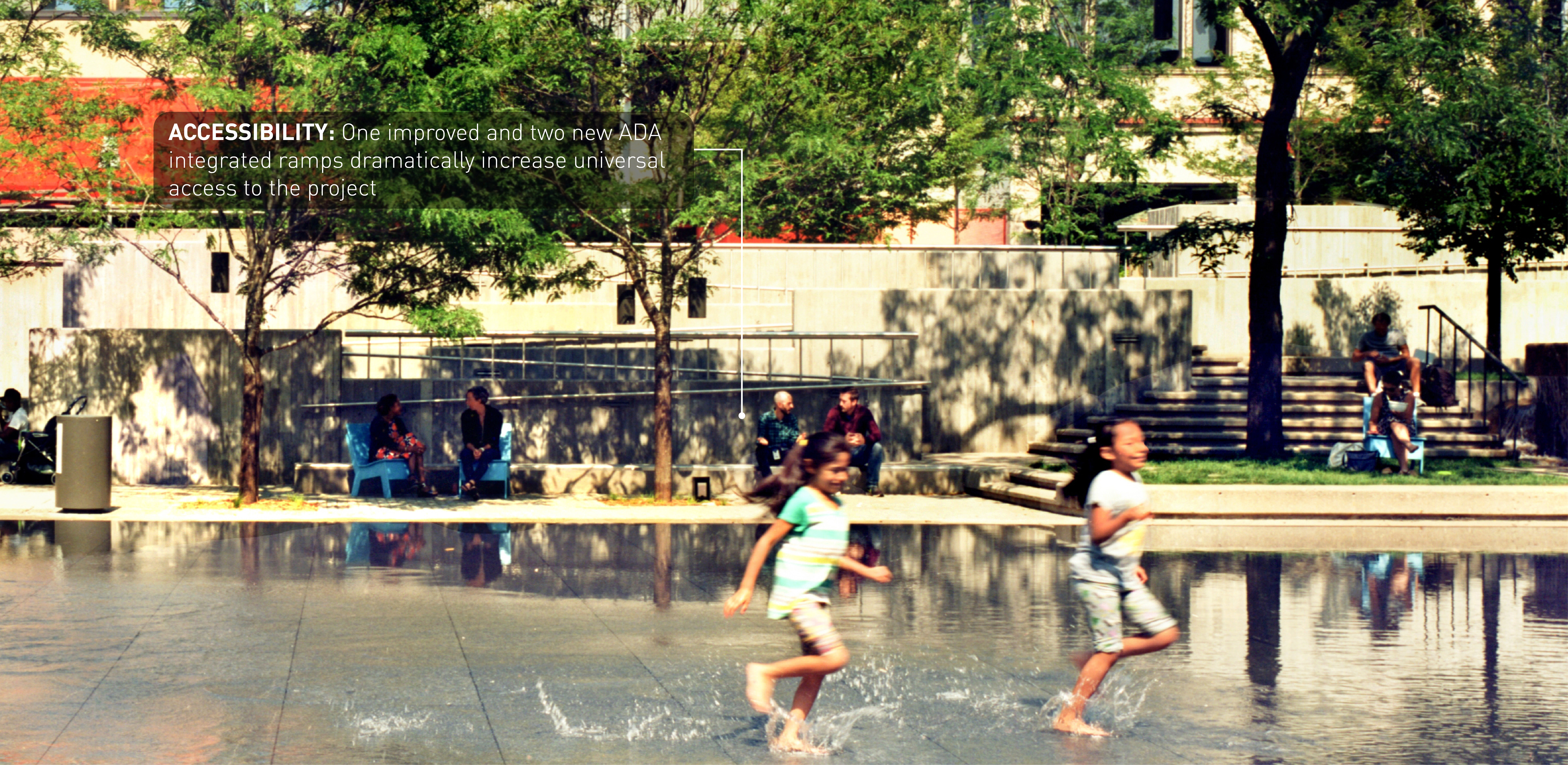 M. Paul Friedberg conceived Peavey Plaza (1975) as the “living room” of downtown Minneapolis. The iconic sunken plaza balanced the tranquility of a fountain and reflecting pool with active programming. It was the site of summer concerts and markets, winter ice skating, and provided office workers a moment of daily rejuvenation. Within a few years of opening, challenges arose. The water features’ pumps failed, while the vegetation required hard-to-access maintenance. Lawns were replaced with concrete; light fixtures failed; wooden site furnishings were painted; chemicals in the water tarnished the fountain’s stainless steel canisters. Eventually, the basin was drained and the plaza lay dormant. BUILDING CONSENSUS The project was slated for demolition. The Cultural Landscape Foundation stepped in last-minute to try to save the space through legal avenues. The plaza was saved and elevated to the National Register of Historic Places in 2013. The City of Minneapolis, with the State of Minnesota and private donors, began a revitalization process to preserve its iconic brutalist character—all while improving accessibility, equity, and sustainability. As the landscape architect, we walked a diplomatic tight-rope from the start. Some stakeholders pushed for rehabilitating the project to its original condition; however, restoring to the original design would perpetuate several issues: poor ADA accessibility, significant water waste, and safety issues. To build consensus, we assembled a technical review team comprised of historic preservationists, accessibility community representatives, safety officials, and the facility management team. REHABILITATION Restoring this brutalist design called for an intensive study of horizontal planes, overlapping concrete terraces, and board-formed walls. The restored cascading fountains and vegetation create a sense of renewal and revitalization. Custom pavers were developed to replicate originals. Some terraced lawns were restored, while other terraces were converted to permeable pavers to create an accessible surface that also supports the stormwater strategy. Site furniture, stainless steel canisters, and light fixtures were all either restored or recreated. EQUAL ACCESS We placed new accessibility ramps in areas already compromised due to failing non-historic CMU walls. A new entrance from Nicollet Mall is comprised of 4% sloped walkways connecting all existing terraces. By utilizing board-formed concrete finishes, mimicking the horizontal planes, and weaving the walkways within the existing fabric, it is difficult to tell where the new design begins and original ends. Raising the basin enhanced accessibility and created a more vibrant public realm. However, raising the basin disturbed the reflecting pool. Through careful technical coordination, prototyping, and consensus-building, the strategy assured the impact and corresponding aesthetics were appropriate for the site. SUSTAINABILITY Through permeable pavers, lawn, and below-ground storage, 95% of stormwater is captured and infiltrated where it lands. Void space below the scrim surface holds stormwater for reuse. Reducing the basin water depth from 10” to 1/4” reduced the total required volume from 62,000 gallons to 14,000 gallons. The basin originally took days to fill or drain, and all water drained to the storm sewer. Now, the basin can fill in 15 minutes and drain in an hour—quickly transitioning from reflecting pool to programmed plaza.