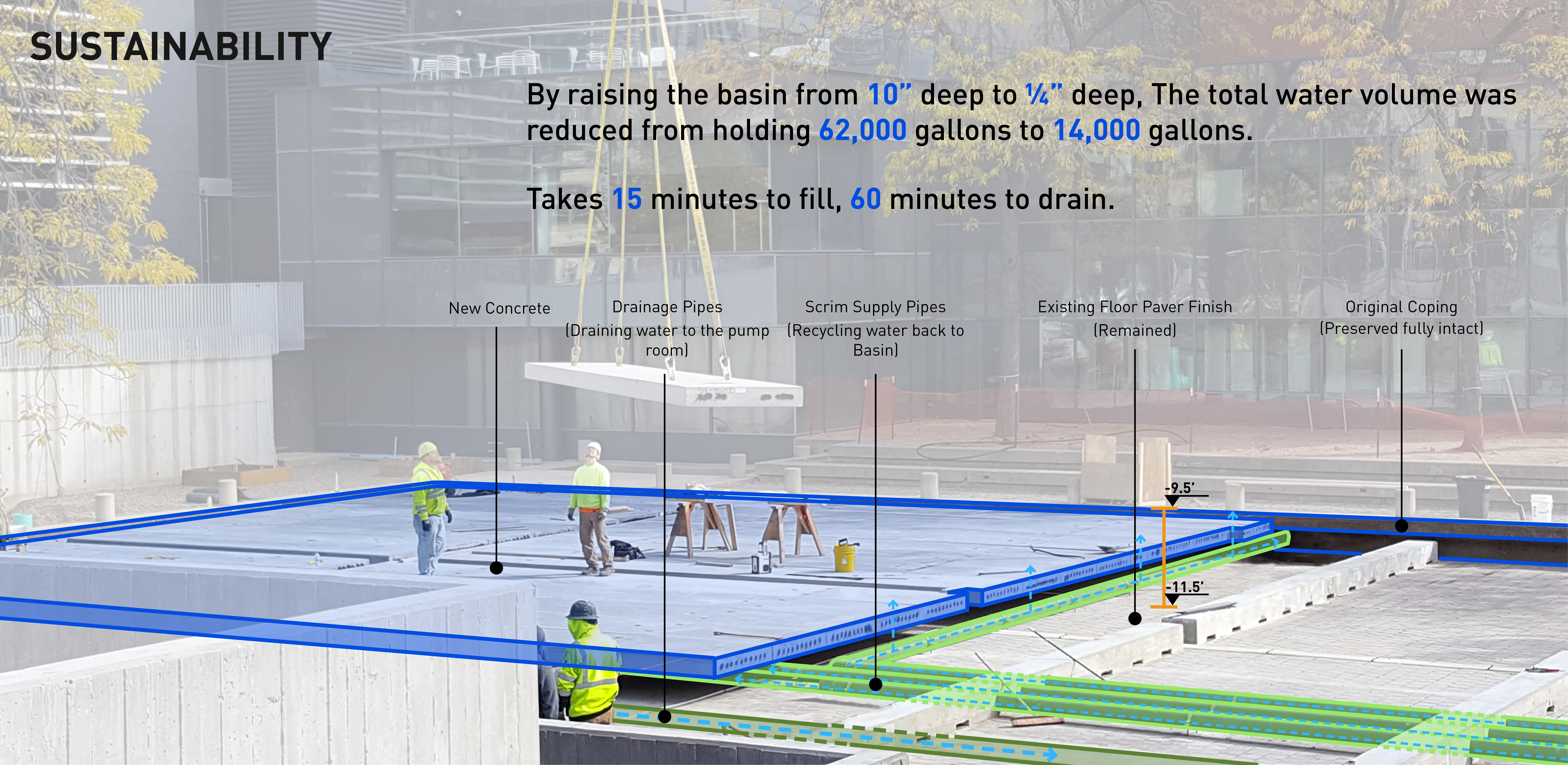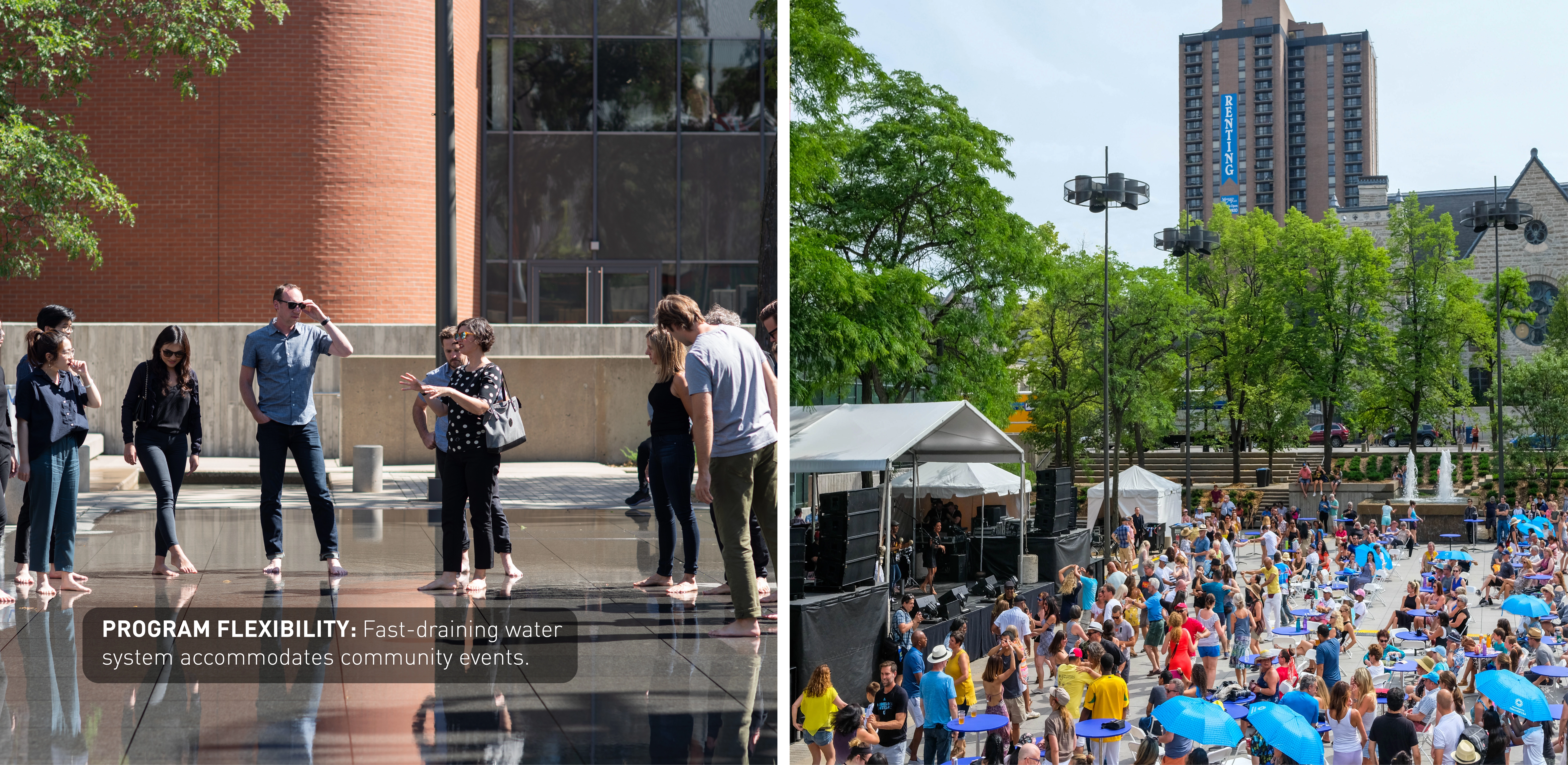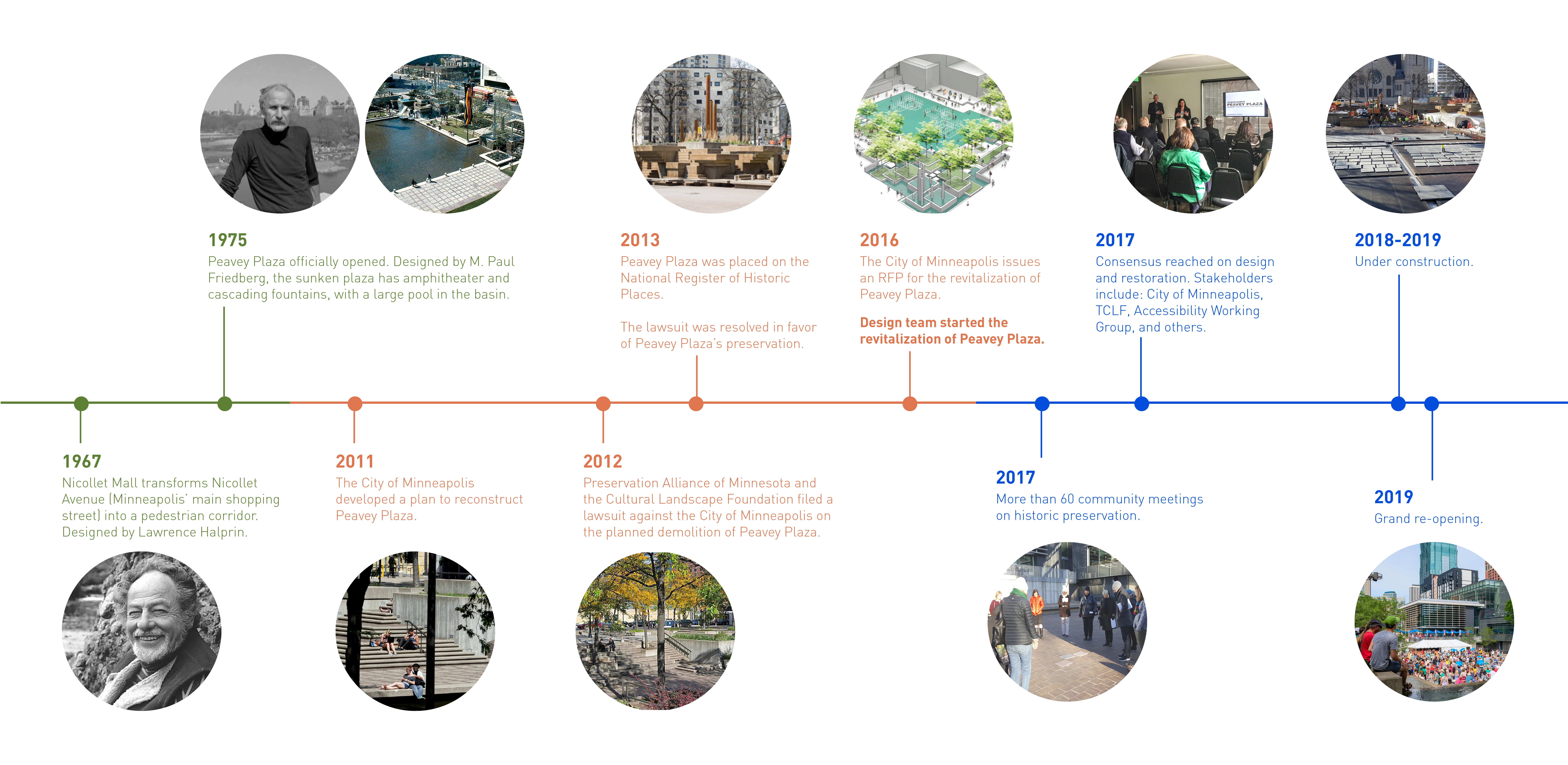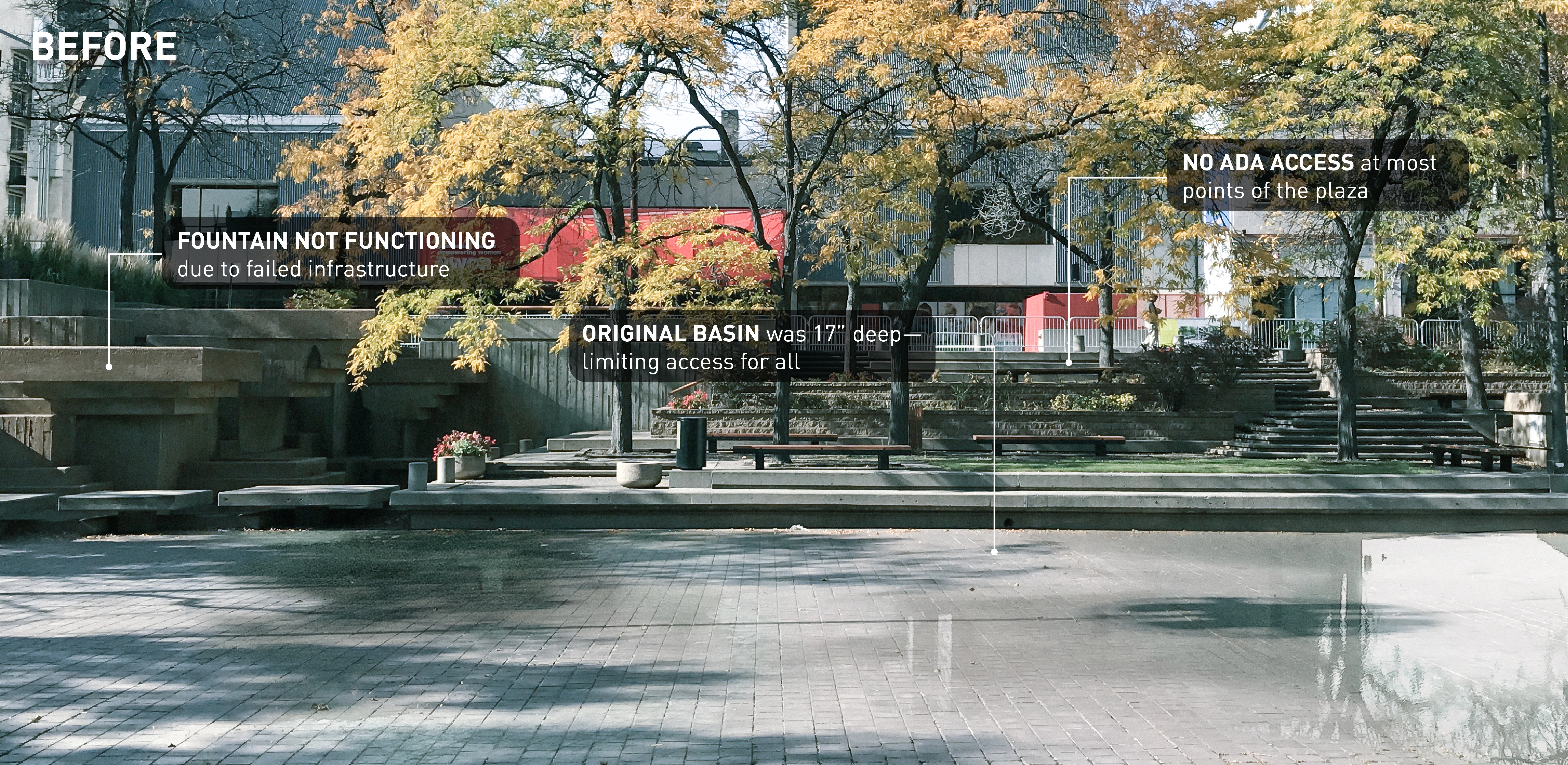 M. Paul Friedberg conceived Peavey Plaza (1975) as the “living room” of downtown Minneapolis. The iconic sunken plaza balanced the tranquility of a fountain and reflecting pool with active programming. It was the site of summer concerts and markets, winter ice skating, and provided office workers a moment of daily rejuvenation. Within a few years of opening, challenges arose. The water features’ pumps failed, while the vegetation required hard-to-access maintenance. Lawns were replaced with concrete; light fixtures failed; wooden site furnishings were painted; chemicals in the water tarnished the fountain’s stainless steel canisters. Eventually, the basin was drained and the plaza lay dormant. BUILDING CONSENSUS The project was slated for demolition. The Cultural Landscape Foundation stepped in last-minute to try to save the space through legal avenues. The plaza was saved and elevated to the National Register of Historic Places in 2013. The City of Minneapolis, with the State of Minnesota and private donors, began a revitalization process to preserve its iconic brutalist character—all while improving accessibility, equity, and sustainability. As the landscape architect, we walked a diplomatic tight-rope from the start. Some stakeholders pushed for rehabilitating the project to its original condition; however, restoring to the original design would perpetuate several issues: poor ADA accessibility, significant water waste, and safety issues. To build consensus, we assembled a technical review team comprised of historic preservationists, accessibility community representatives, safety officials, and the facility management team. REHABILITATION Restoring this brutalist design called for an intensive study of horizontal planes, overlapping concrete terraces, and board-formed walls. The restored cascading fountains and vegetation create a sense of renewal and revitalization. Custom pavers were developed to replicate originals. Some terraced lawns were restored, while other terraces were converted to permeable pavers to create an accessible surface that also supports the stormwater strategy. Site furniture, stainless steel canisters, and light fixtures were all either restored or recreated. EQUAL ACCESS We placed new accessibility ramps in areas already compromised due to failing non-historic CMU walls. A new entrance from Nicollet Mall is comprised of 4% sloped walkways connecting all existing terraces. By utilizing board-formed concrete finishes, mimicking the horizontal planes, and weaving the walkways within the existing fabric, it is difficult to tell where the new design begins and original ends. Raising the basin enhanced accessibility and created a more vibrant public realm. However, raising the basin disturbed the reflecting pool. Through careful technical coordination, prototyping, and consensus-building, the strategy assured the impact and corresponding aesthetics were appropriate for the site. SUSTAINABILITY Through permeable pavers, lawn, and below-ground storage, 95% of stormwater is captured and infiltrated where it lands. Void space below the scrim surface holds stormwater for reuse. Reducing the basin water depth from 10” to 1/4” reduced the total required volume from 62,000 gallons to 14,000 gallons. The basin originally took days to fill or drain, and all water drained to the storm sewer. Now, the basin can fill in 15 minutes and drain in an hour—quickly transitioning from reflecting pool to programmed plaza.