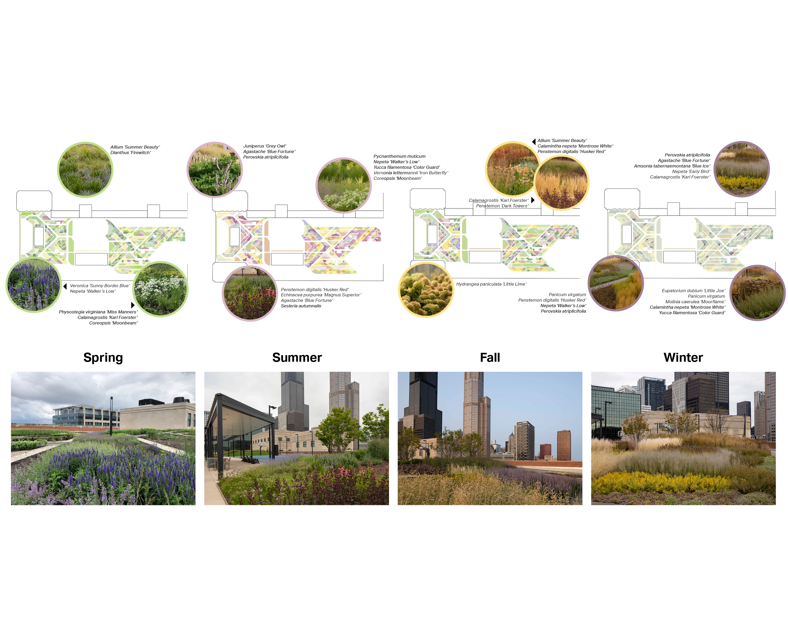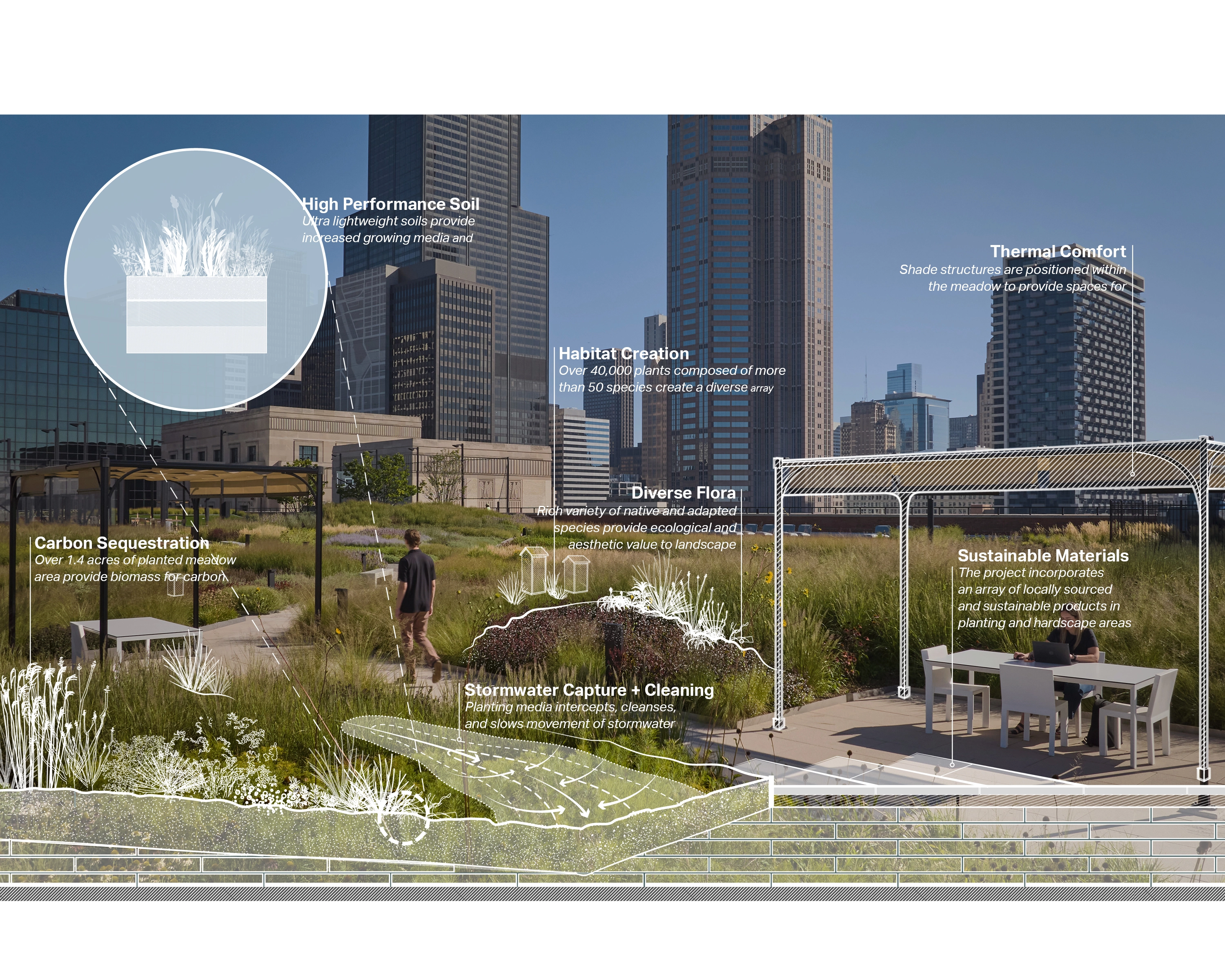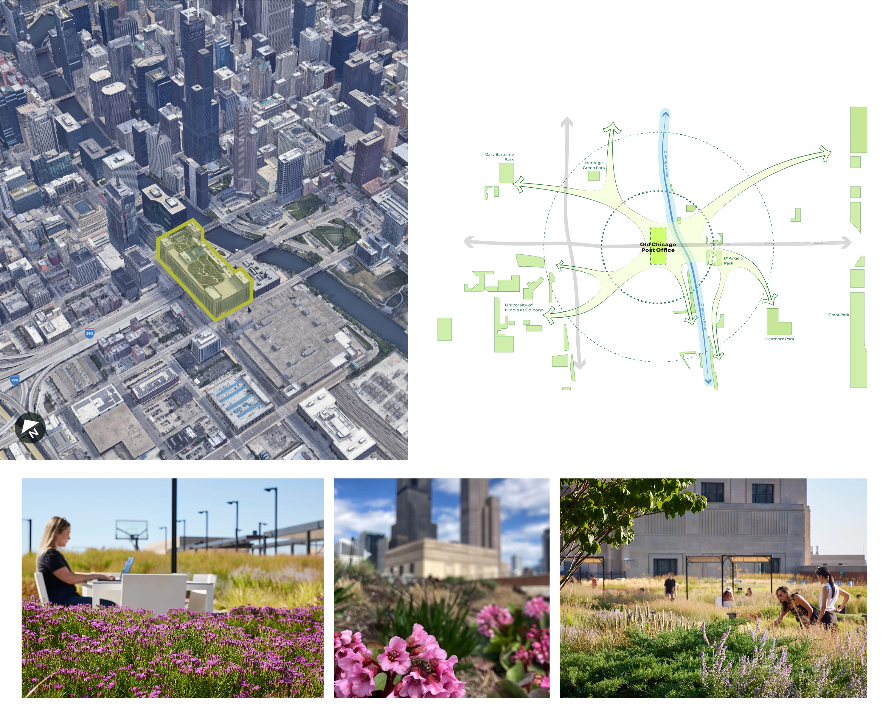 The Old Chicago Post Office story is the tale of how an iconic piece of architecture gained a second chance at life. Built in 1921, the 13-story structure occupies two city blocks with over 2.5 million SF space. Despite its size and recognition, the building fell victim to the modernization of the postal delivery system and closed. In 2016, developer 601W Companies purchased the building to revitalize it into a modern work environment. The surrounding neighborhood lacked the green space desired to support the influx of nearly 10,000 tenants who would occupy the building. Leveraging the building’s vast roof area, nearly four acres, the Meadow was born, becoming the nation’s largest private rooftop garden. Benefit to Wider Community: Through its adaptive reuse, Chicago has gained a sizeable new urban employment center. The project serves as a highly visible example of how rooftop landscapes can be used to accommodate a wide variety of programs in an attractive and sustainable setting. While it serves primarily as an area of respite and nature for tenants, the space can be rented for events and has already hosted a variety of conferences, fundraisers, and weddings. Sensitivity to Surrounding Aesthetics: The design of the rooftop was inspired by the building’s Art Deco style of architecture. Because of loading restrictions, the primary pathways were organized along major structural beams, setting the framework. Sensitivity to Surrounding Ecological Systems: The Meadow is a highly viable patch of nature in an urban environment. This robust landscape of native and adapted perennials and grasses promotes connectivity through its role as a habitat. Sheltered by a continuous perimeter of 8-foot-tall parapet walls, the Meadow provides a semi-protected landscape that many bird and insect species now call home. Three bee colonies have been added to the roof, to help pollinate the Meadows. Soil Innovation: The project’s greatest challenge was creating an immersive landscape while working within the loading constraints of the existing roof. The plants the design sought to utilize typically require a minimum of six to nine inches of soil depth which was not possible using traditional green roof soil mix. The design team worked with a green roof soil provider to create a new ultra-lightweight soil mix that would support the growth of larger perennials and grasses within the loading constraints of the existing roof. Because this was going to be the first application of the soil, and at such a large scale, the design team required the supplier to create and maintain a mockup on the roof for one growing season before construction. Materials and Installation Methods: With over 40,000 individual plants, the project sought to reduce the carbon footprint of the plant growing and delivery process by treating the project site as a nursery. Instead of installing larger-sized plant material, most of the plants were sourced as small plugs inserted into a biodegradable erosion mat. Water Management: The richly planted meadows serve as a giant sponge absorbing and filtering more than a quarter-million gallons of stormwater annually from entering the City’s strained storm sewer system. The roof intercepts and helps divert over 300K gallons of stormwater from entering the sewer system. As the largest above-grade green roof in Chicago, the Meadow illustrates how vegetated roofs can be attractive, functional, and an asset to development projects.