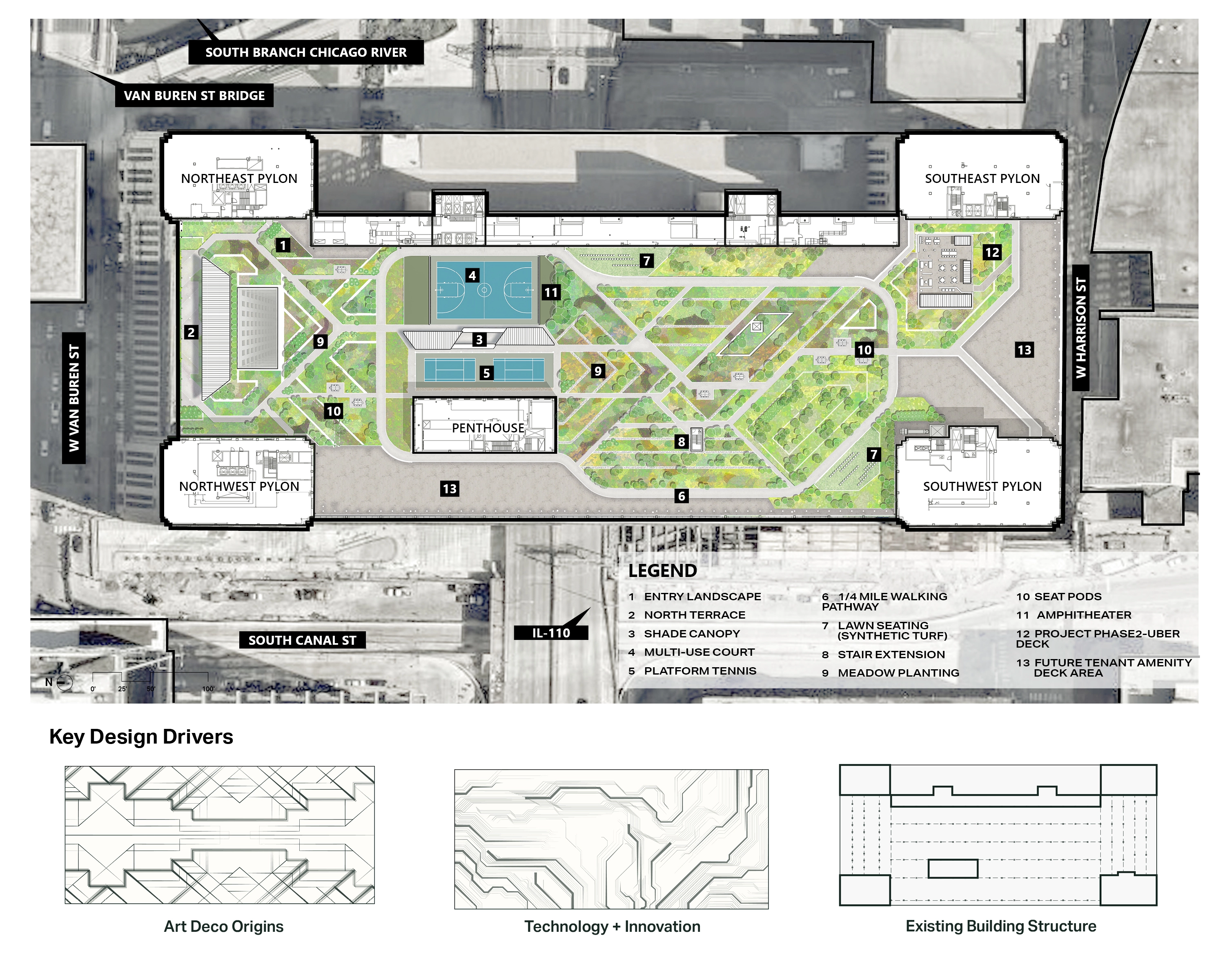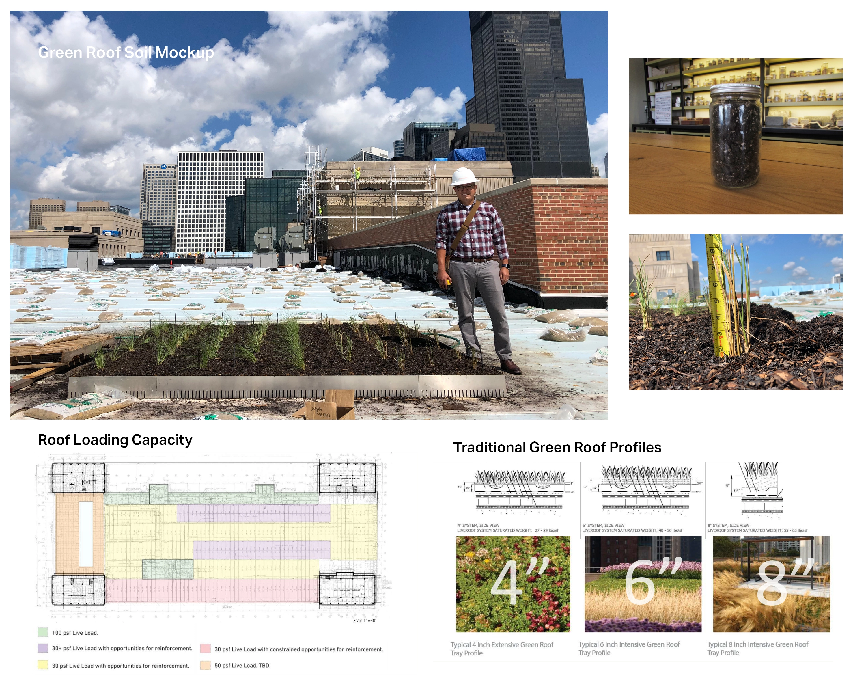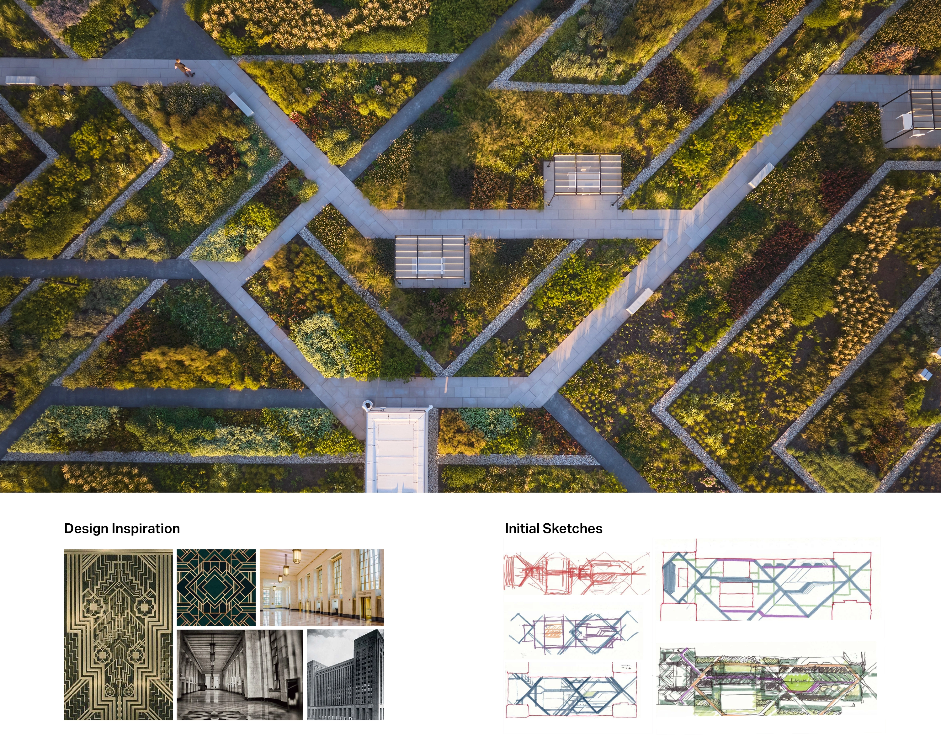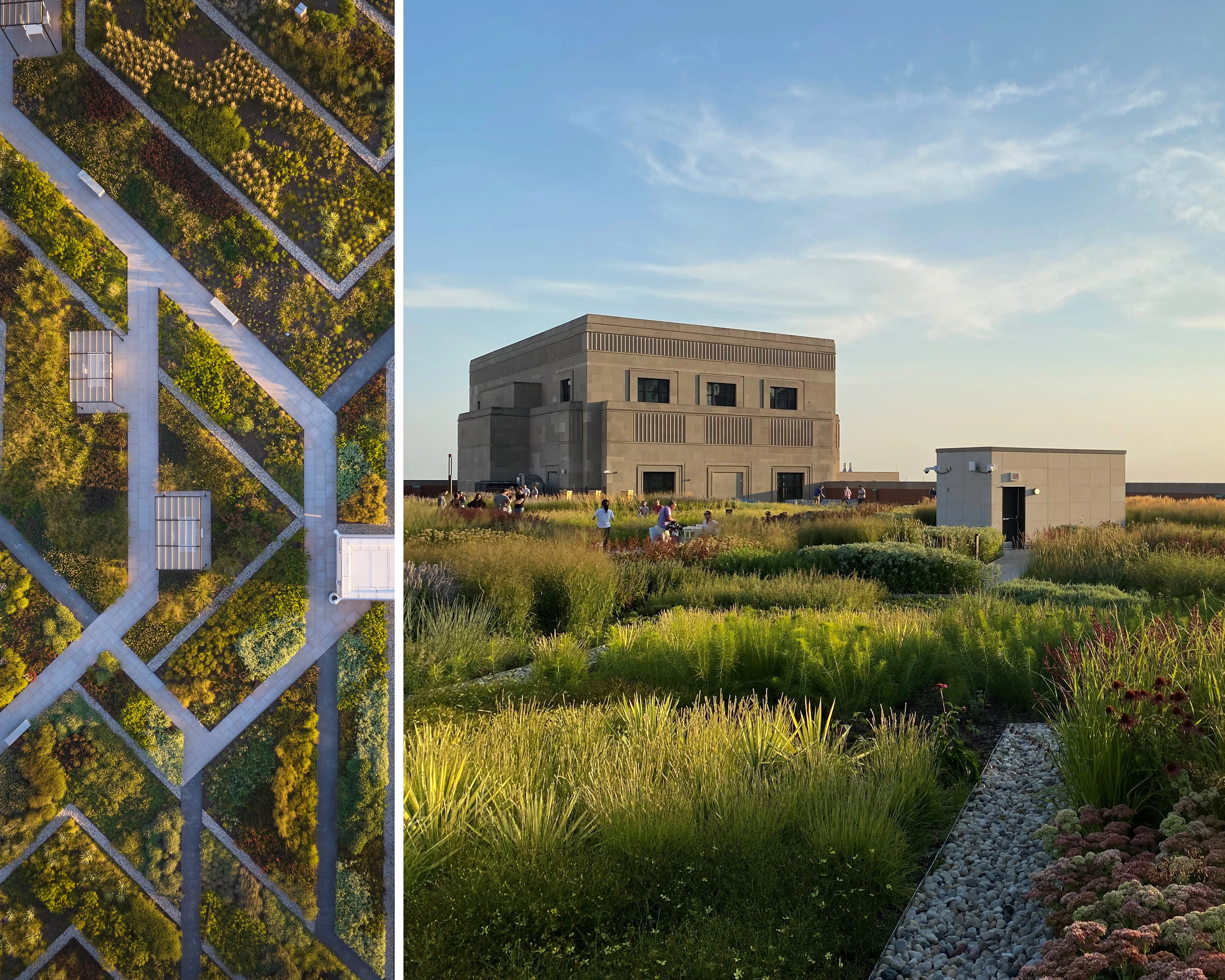 The Old Chicago Post Office story is the tale of how an iconic piece of architecture gained a second chance at life. Built in 1921, the 13-story structure occupies two city blocks with over 2.5 million SF space. Despite its size and recognition, the building fell victim to the modernization of the postal delivery system and closed. In 2016, developer 601W Companies purchased the building to revitalize it into a modern work environment. The surrounding neighborhood lacked the green space desired to support the influx of nearly 10,000 tenants who would occupy the building. Leveraging the building’s vast roof area, nearly four acres, the Meadow was born, becoming the nation’s largest private rooftop garden. Benefit to Wider Community: Through its adaptive reuse, Chicago has gained a sizeable new urban employment center. The project serves as a highly visible example of how rooftop landscapes can be used to accommodate a wide variety of programs in an attractive and sustainable setting. While it serves primarily as an area of respite and nature for tenants, the space can be rented for events and has already hosted a variety of conferences, fundraisers, and weddings. Sensitivity to Surrounding Aesthetics: The design of the rooftop was inspired by the building’s Art Deco style of architecture. Because of loading restrictions, the primary pathways were organized along major structural beams, setting the framework. Sensitivity to Surrounding Ecological Systems: The Meadow is a highly viable patch of nature in an urban environment. This robust landscape of native and adapted perennials and grasses promotes connectivity through its role as a habitat. Sheltered by a continuous perimeter of 8-foot-tall parapet walls, the Meadow provides a semi-protected landscape that many bird and insect species now call home. Three bee colonies have been added to the roof, to help pollinate the Meadows. Soil Innovation: The project’s greatest challenge was creating an immersive landscape while working within the loading constraints of the existing roof. The plants the design sought to utilize typically require a minimum of six to nine inches of soil depth which was not possible using traditional green roof soil mix. The design team worked with a green roof soil provider to create a new ultra-lightweight soil mix that would support the growth of larger perennials and grasses within the loading constraints of the existing roof. Because this was going to be the first application of the soil, and at such a large scale, the design team required the supplier to create and maintain a mockup on the roof for one growing season before construction. Materials and Installation Methods: With over 40,000 individual plants, the project sought to reduce the carbon footprint of the plant growing and delivery process by treating the project site as a nursery. Instead of installing larger-sized plant material, most of the plants were sourced as small plugs inserted into a biodegradable erosion mat. Water Management: The richly planted meadows serve as a giant sponge absorbing and filtering more than a quarter-million gallons of stormwater annually from entering the City’s strained storm sewer system. The roof intercepts and helps divert over 300K gallons of stormwater from entering the sewer system. As the largest above-grade green roof in Chicago, the Meadow illustrates how vegetated roofs can be attractive, functional, and an asset to development projects.