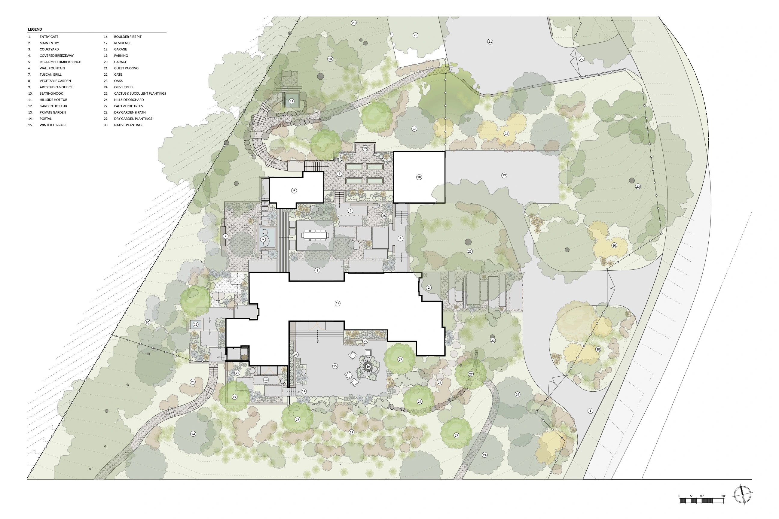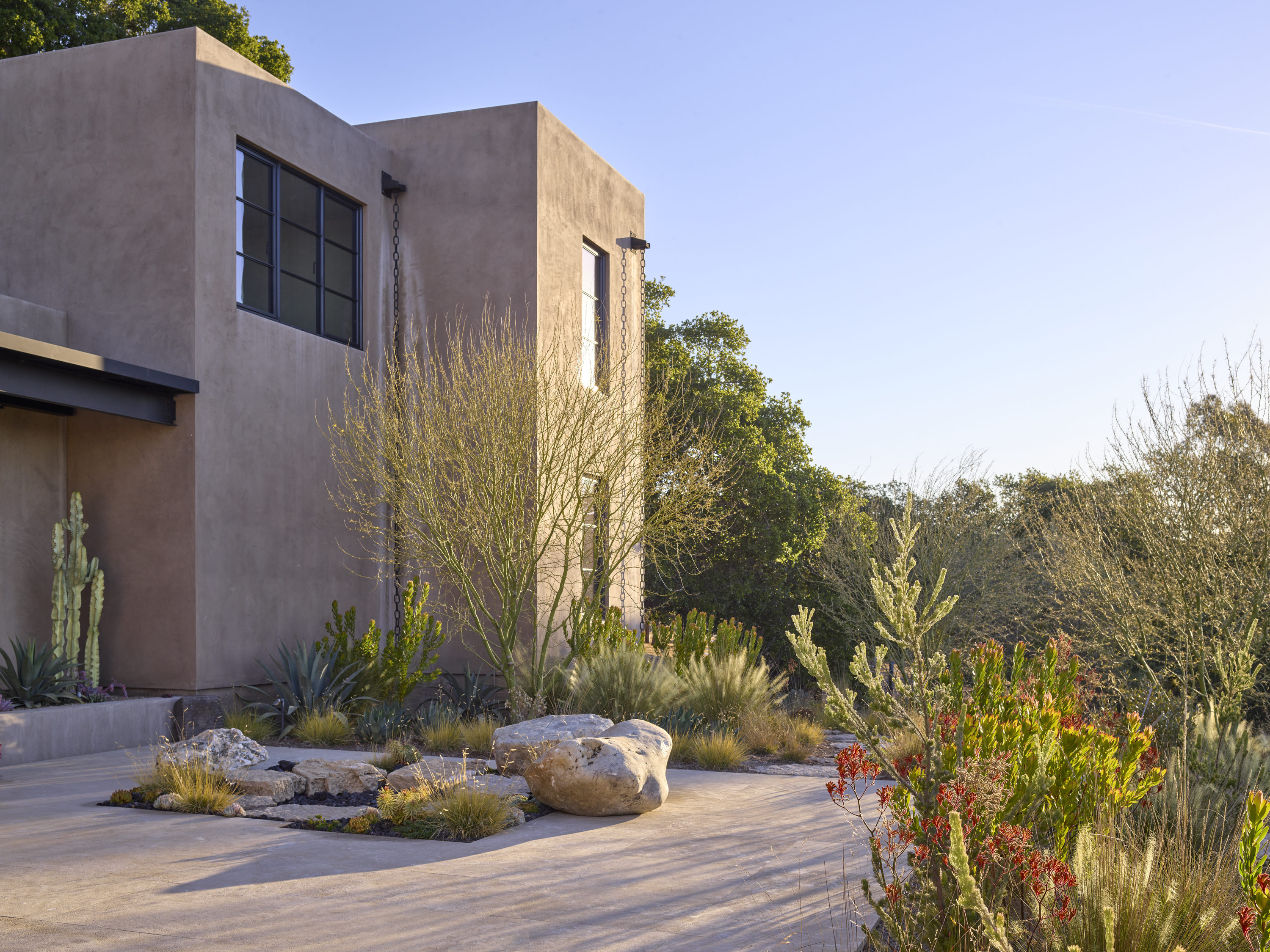 The clients had been living on a sloping two-acre site for 20 years and felt their traditional stucco home, enclosed by a tall wall, cut them off from the site and views. They approached the design team with a request to create a new energy and water-conscious home that fully utilized the land in the hills above Monterey Bay. The LA worked closely with the design team and client to create a compound of small buildings that open onto the land and combine to define a series of outdoor spaces in a desert-meets-coastal landscape. The LA lead the site planning and building placement to create the Summer and Winter Terraces, which each take advantage of the sun, weather and passive cooling/heating to be comfortable in their respective seasons.