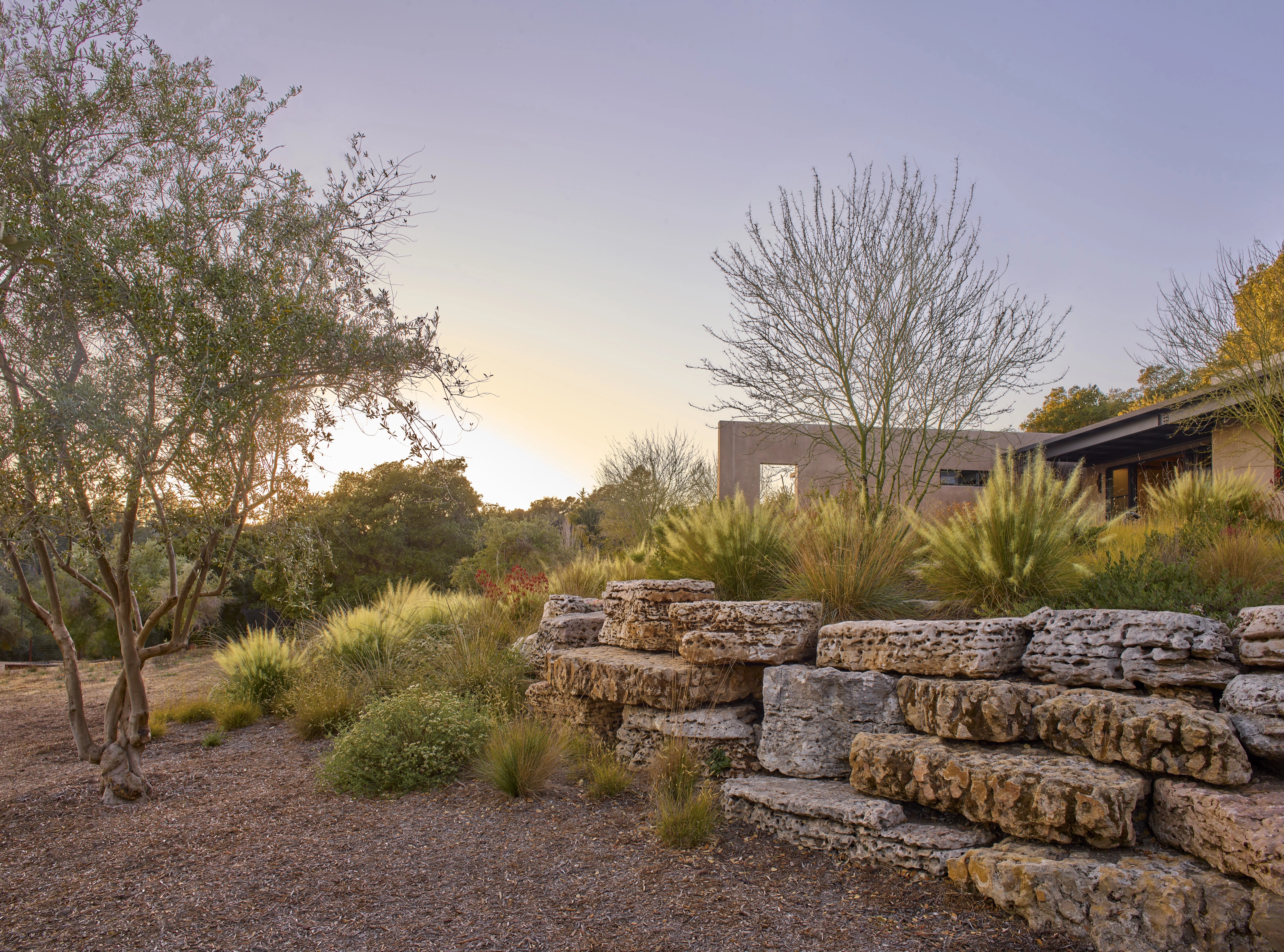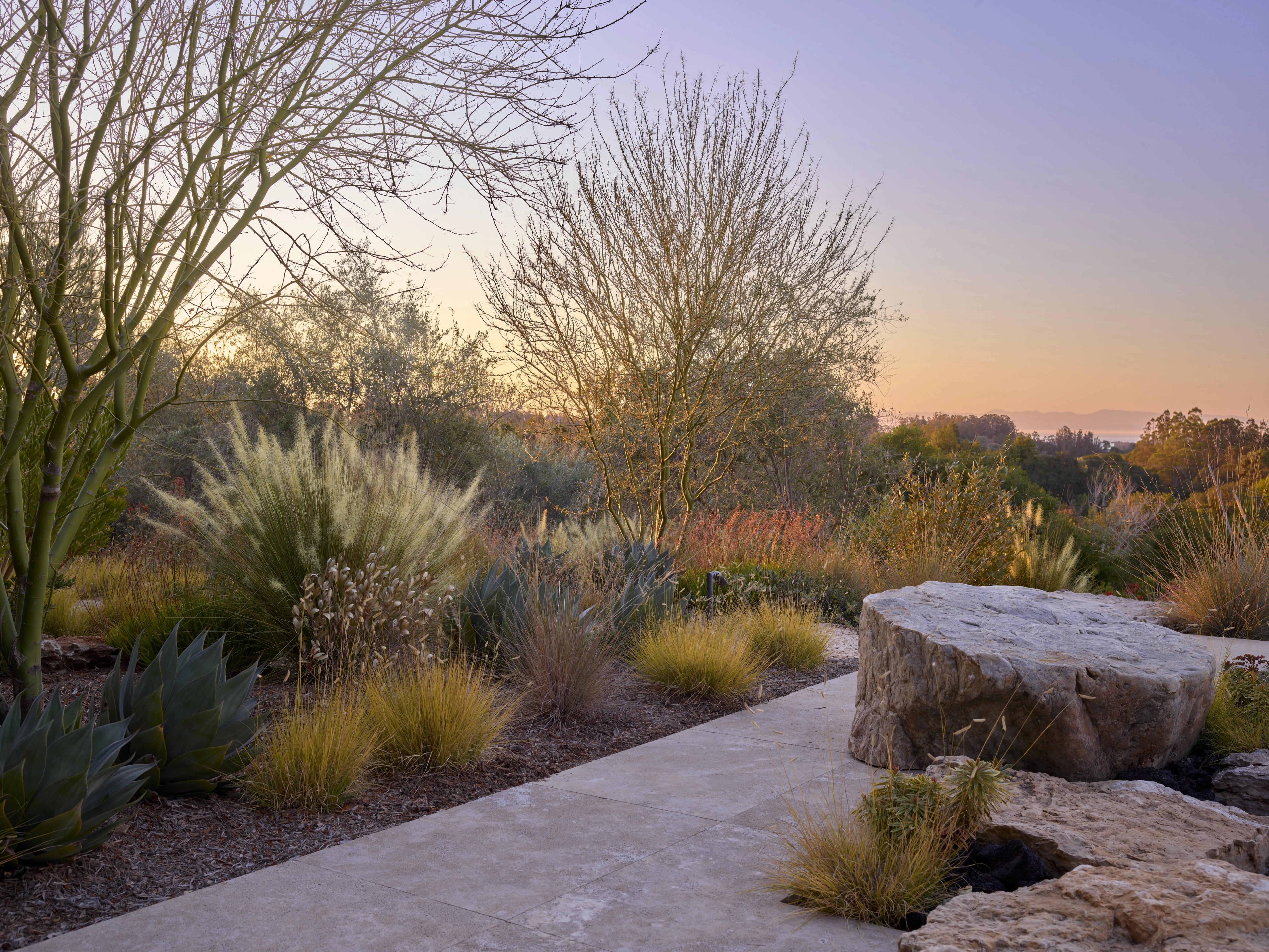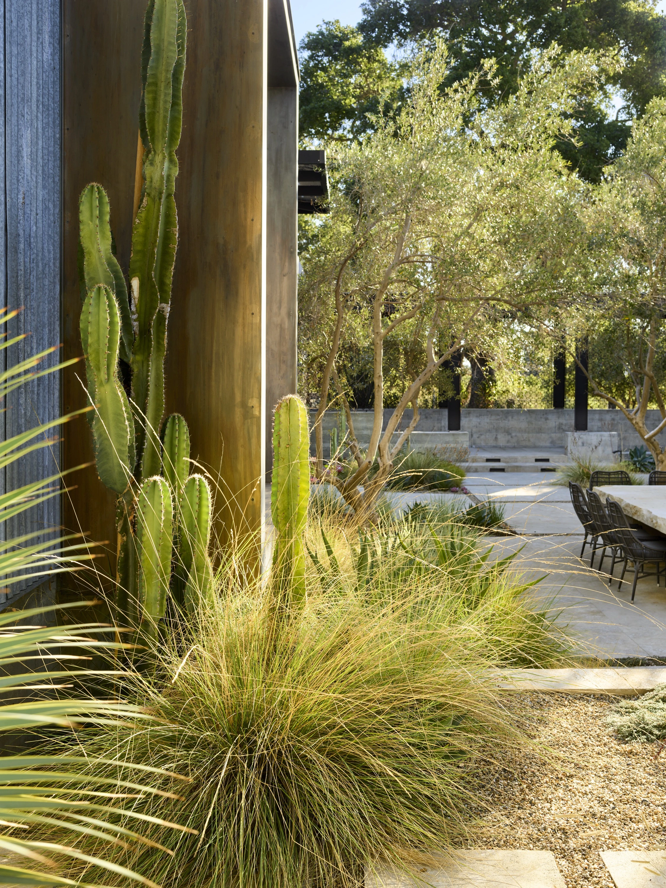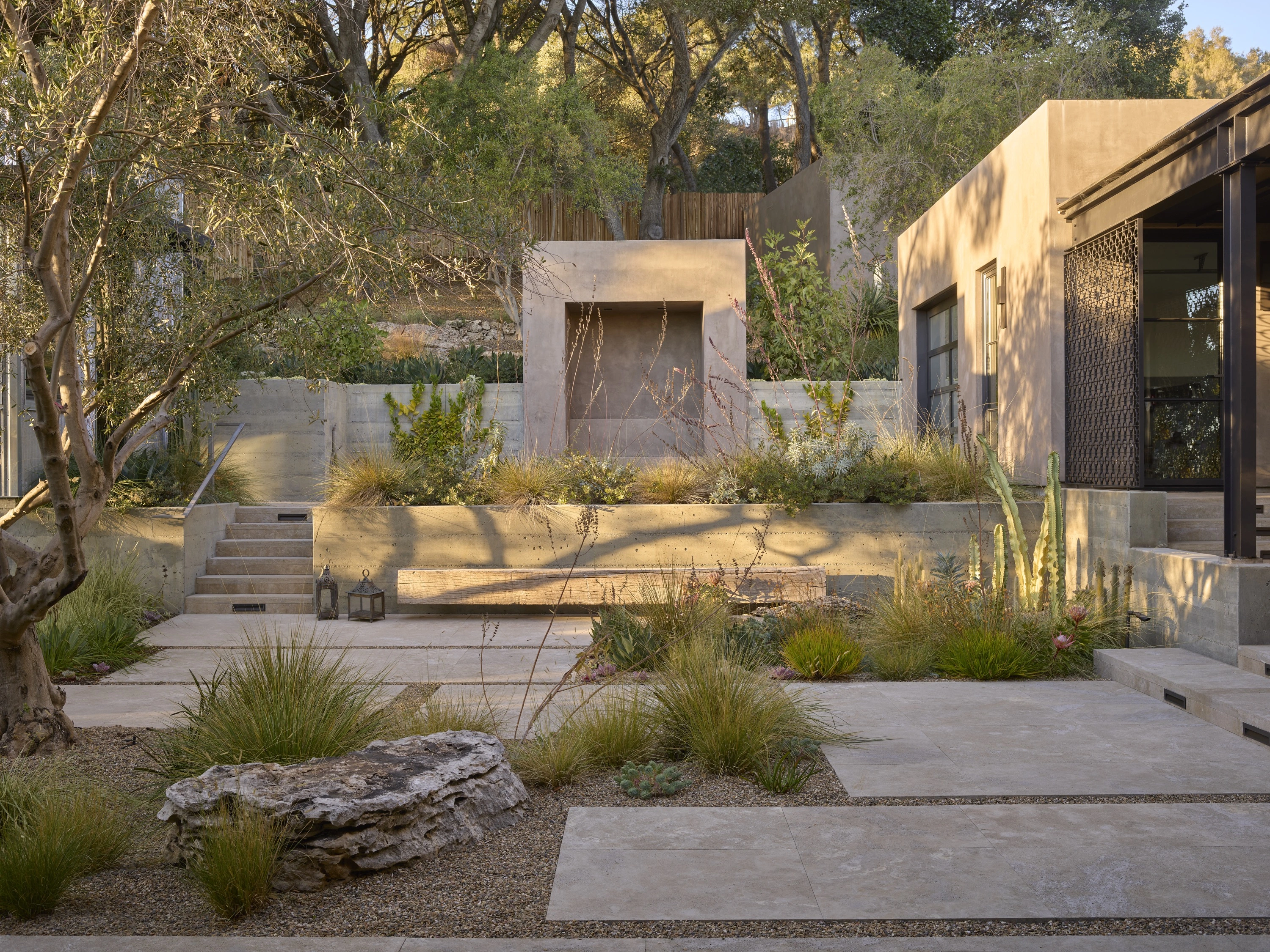 The clients had been living on a sloping two-acre site for over 20 years and felt their traditional stucco home, enclosed by a tall solid wall, cut them off from the full extent of the site and bay views. They approached the design team with a request to create a new energy and water-conscious home that fully utilized the merits of their property in the hills above Monterey Bay. Over a series of years and many charrettes, the LA collaborated with the owners, the architect and interior designer to completely transform the way the home. Careful study of the site, topography and coast live oaks woodlands that rimmed the meadow, drove the siting of the buildings. While the original house was set into the lower meadow, the new compound was set high on the property to look across the meadow to the bay. The team used the architecture to create connection to the land, reimagining a large home as a series of small structures composed to encompass distinct outdoor rooms, in effect doubling the floor plan. With hot summers and pleasant winters, the exposure and aspect of each outdoor room was considered to provide sun or shade when desired. The LA drove the site planning, building placement and massing to create the Summer and Winter Terraces. The terraces fall to either side of the largest building, taking advantage of being north and south facing. The Summer Terrace is a refuge from the heat. The LA employed passive cooling methods by planting a bosque of olives over the dining area on the southern side. A covered loggia encloses the eastern edge with filtered light passing through the lacy filigree metal screen. The final defining element of the courtyard is an 8’ eggplant-colored stucco wall with a blackened steel box spilling water into a basin. A small cooking area with a Tuscan grill is tucked behind the fountain wall. Cantilevered off this wall is a long reclaimed timber employed as a bench. Between two small buildings is a vegetable garden and lounging nook in a 12’ tall stucco folly. The Winter Terrace in contrast, is a bright outdoor room for use on cool Northern California days. The Summer Terrace connects to the Winter Terrace through pocketing glass doors. Long monolithic limestone steps lead down to the sundrenched patio. A firepit of boulders emerges out of the terrace rimmed by water-washed stone and accented by boulders for seating. Here the reflected heat off the building walls sets up ideal conditions for cactus and succulent plantings. The LA composed the rhythm of architectural plants as an artful expression to complement the blank canvas of the dramatic walls. Restraining the hardscape to counterbalance the wild, drought tolerant garden the client desired, the LA selected cacti, succulents and grasses with native plants to weave a tapestry of texture for year round interest. Palo verde trees frame views from the large patio without interrupting views to the meadow below. The grade of this terrace and garden is supported by a series of stacked water-washed boulders. The boulders overlap vertically and horizontally to make for a more natural transition from the house to the meadow below. A dry planting palette furthers the desert-like feel with four types of grasses, native buckwheat and coffee berry along with kangaroo paw and Leucadendron. Responding to a range in microclimates, the planting varies to adapt and to create distinctive garden spaces throughout the site to create complex experiences.