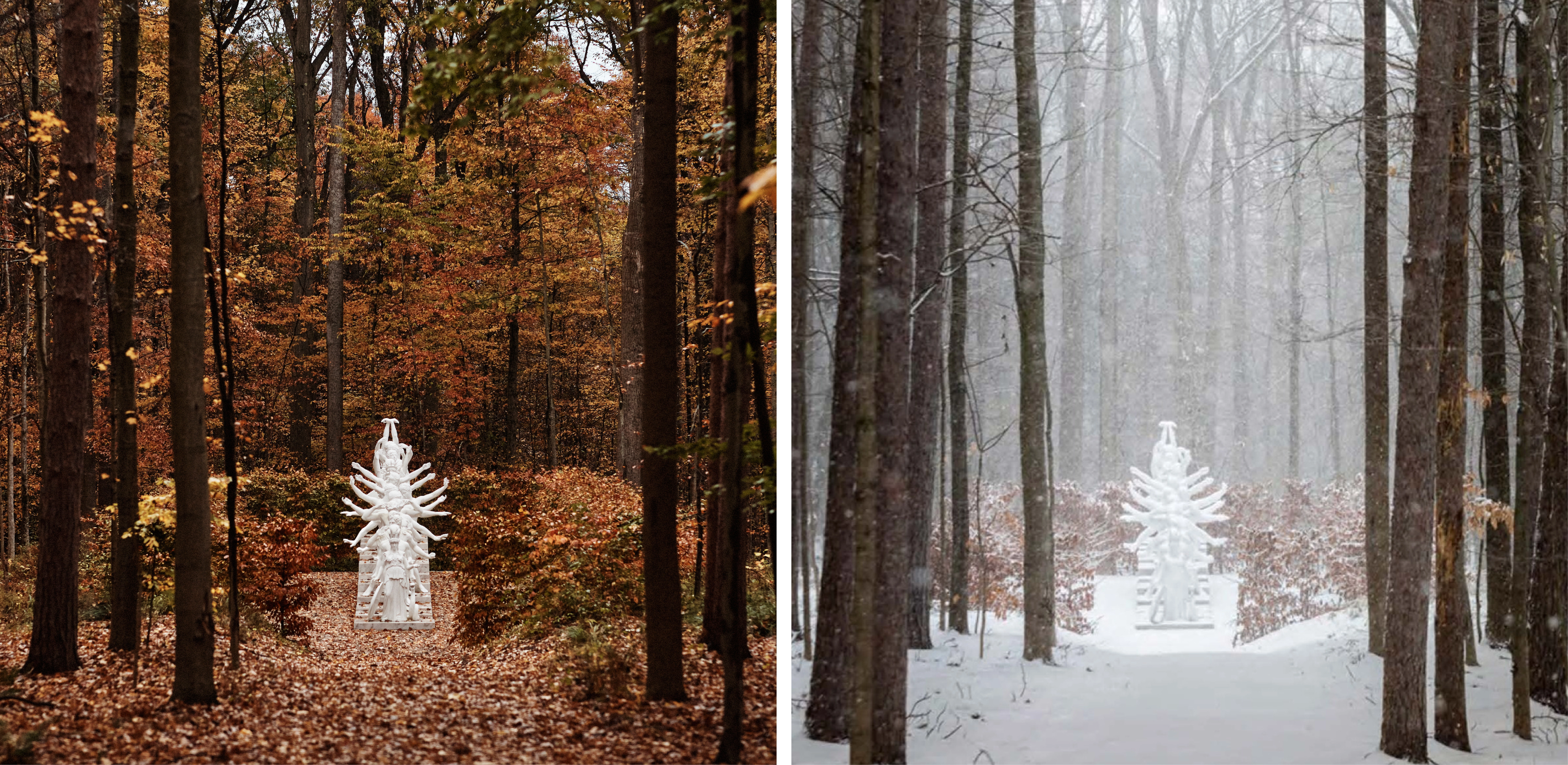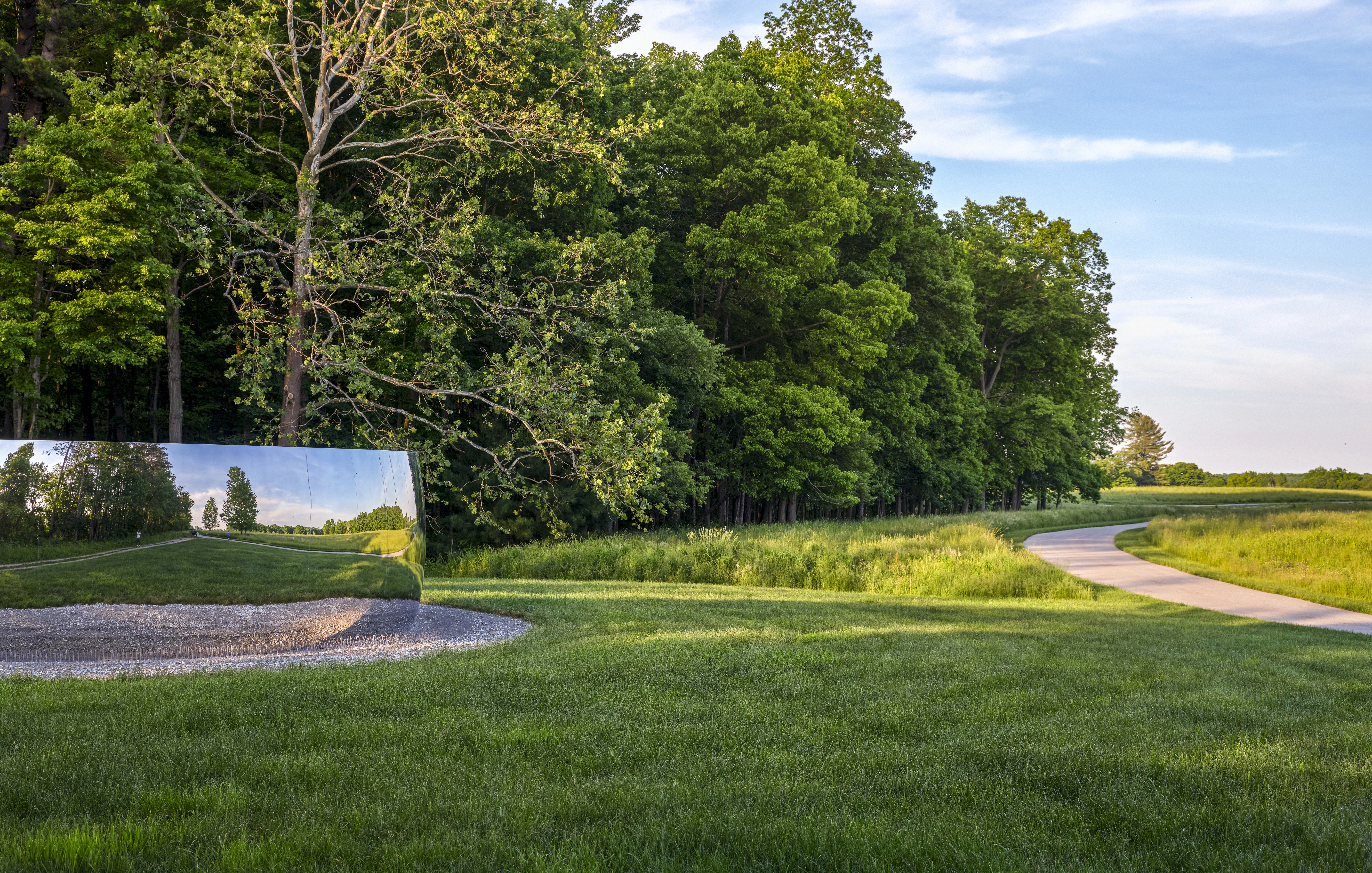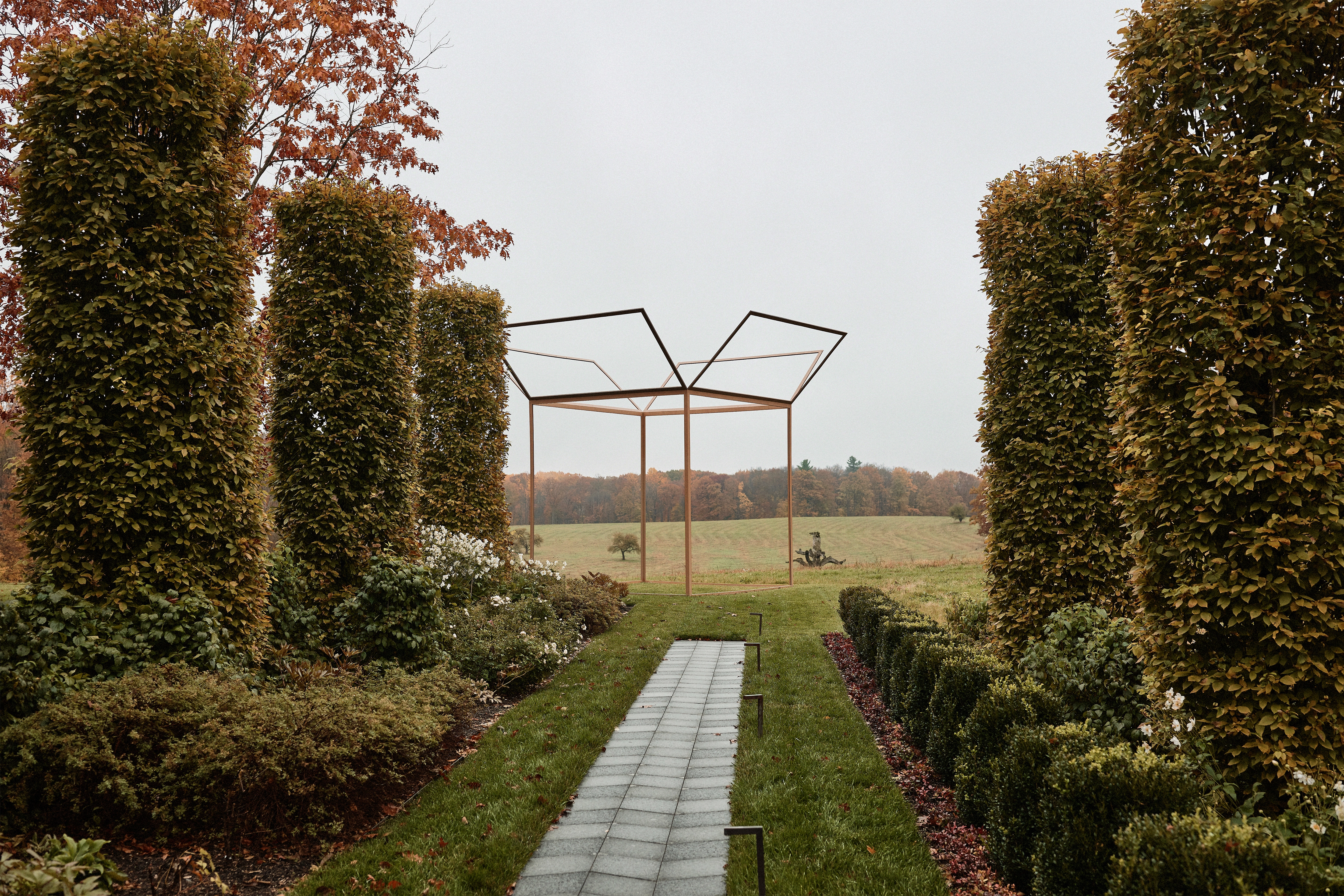 This 150-acre site once held a production orchard, which has since reverted to open meadow. The new owner and resident, an avid art collector, was drawn to the site’s potential for art experiences and improved ecological value. We encouraged the client to treat the new house as its own work of sculpture in a collection. Finding inspiration in Czech Cubism, the client proposed an exploration into the movement for house and garden. Through horticultural, material, and spatial means, we explored the prismatic qualities of Cubism across the garden precinct, from gate handle to pavers to planting design. Chief among these garden elements is the Ribbon Embankment, a sculptural landform that bounds the domestic precinct against the meadow below. Bands of amsonia, boxwood, spirea, and fragrant sumac create a series of faceted planes with strong seasonal character. The Ribbon defines level terraces around the house, including a kitchen garden and dining terrace, and frames the edge of the pool terrace. In the arrival garden, a birch walk created in homage to Warren Manning’s nearby Stan Hywett Hall, leads on one end to a belvedere overlooking the Pepper/Luce Creek; at the other Tom Friedman’s "Outdoor Open Box" frames meadow views. From the house, multiple itineraries lead to sculpture walks throughout the property. Ecological principles in support of the site’s flora and fauna guided our work beyond the residential precinct. An early ecological assessment identified areas of higher to lesser ecological potential, shaping restoration priorities as well as opportunities to site sculpture in disturbed areas and at the periphery of meadows to protect habitat for ground-nesting birds. We also used careful management strategies to control invasive species and reintroduce native warm-season grasses in the meadows. Additions of roads, trails, and installations of larger sculptures in the woodlands catalyzed restoration of woodland ecologies. We interpreted necessary improvements to water management infrastructure as an opportunity for a new pond near the house and a site-specific commission for Andy Goldsworthy’s "Stone Dam" at the historic farm pond. The incremental implementation of these projects maintained critical habitat during the transformation. An extensive network of trails through the woodlands and meadows visits highlights of the renewed ecology alongside works of contemporary sculpture. Several of the works are site-specific responses to our investigations, recommendations, and design work. We worked closely with the owner, artists, and contractor to site the works through design studies and full-scale mockups, managing installation logistics and choreographing each experience carefully. Many of the artworks live in garden rooms or groves within the woodlands, where plantings and paths guide interaction and contemplation. Examples include Xu Zhen’s "Corporate" (Thousand Arms) and a sequence of plates by Richard Serra that step down to the Pepper-Luce Creek from the house’s domestic precinct. We developed a management and maintenance plan for the owners, who intend to guide the landscape to maturity over the next decades while expanding their collection and improving accessibility. The team is preparing the site with its living and sculptural collections as an endowed gift to an internationally renowned arts institution, where conversations between art and ecology will continue in the form of a public sculpture park.