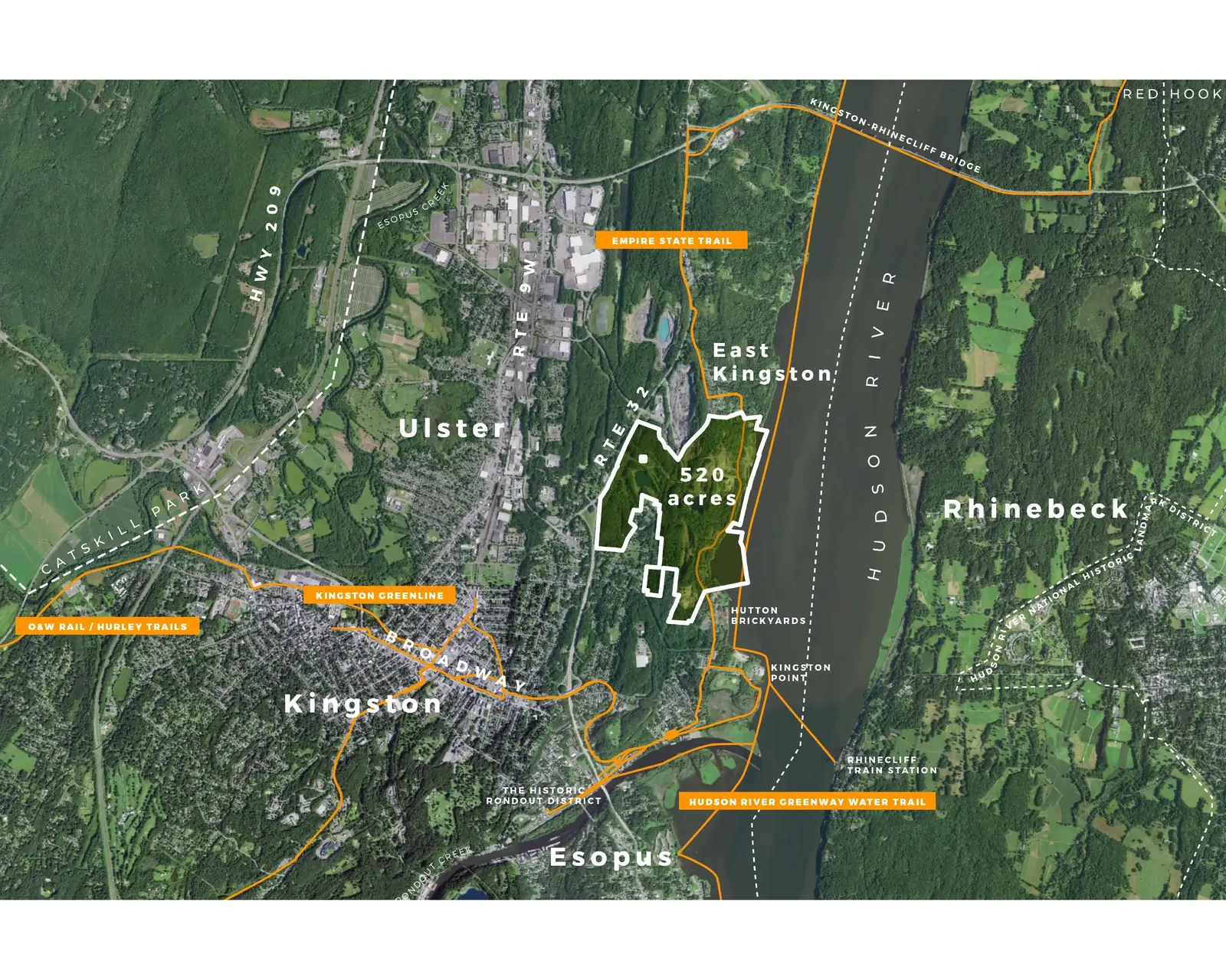 Context: Situated on 520-acres of abandoned quarry land in the City of Kingston and adjacent to the Town of Ulster, the site includes diverse natural features such as woodlands, wetlands, quarry lakes, and Hudson River waterfront. The area's history spans from its pre-industrial home to the Esopus people and later as the "Kingston Commons," and through a century of extractive industry use and abandonment, led to its current state: part wild and heavily degraded. The plan is deeply informed by understanding local communities of the area including diverse Black and Hispanic communities.
