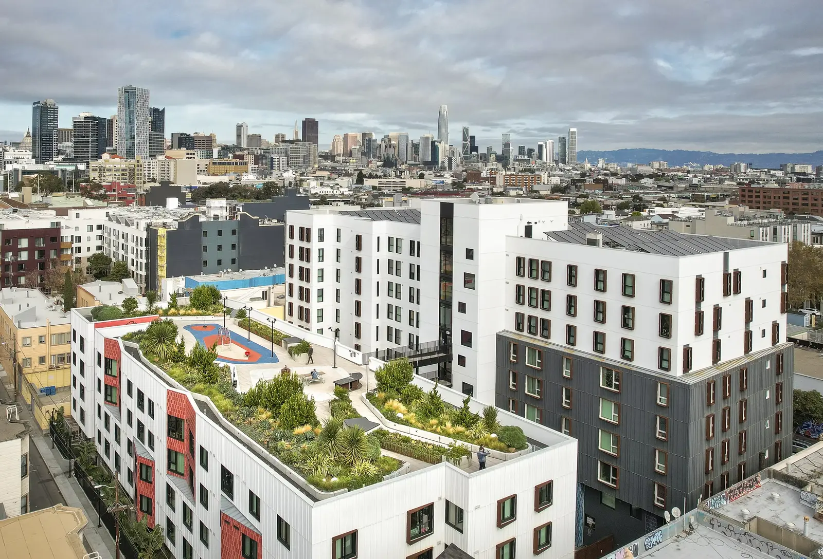 The project was developed on an urban infill site adjacent to the 16th Street BART Station on the Mission Street transit corridor. The site once housed the Phoenix Continuation High School, a San Francisco Unified School District (SFUSD) facility. In 2014, the San Francisco Mayor’s Office of Housing and Community Development (MOHCD) acquired the land and converted it to the City’s first interim-use navigation center to serve the unhoused. It was slated for permanently affordable housing the following year. Named after the phoenix, a mythical bird that symbolizes rebirth, La Fénix represents the City and community’s dedication to supporting vulnerable residents, drawing inspiration from the Pan-Latino cultural landscape of the Mission District.