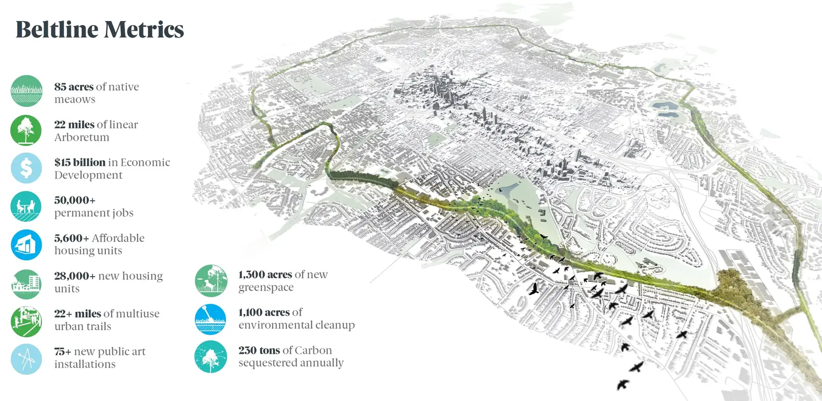 Fifteen years into the project, approximately $800 million in public investment has led to more than $8.2 billion in private investment. 2,977 of the planned 5,600 affordable workforce housing units along the corridor have been constructed to date. Constructed trail segments have set a new benchmark for public realm design and execution in Atlanta, inviting new and existing businesses to orient their storefronts to the activated greenways. the BeltLine has catalyzed an altogether different type of development for Atlanta: dense, urban, pedestrian-focused, socially cohesive environments. Scheduled for completion in 2030, the project will continue to evolve a civic and cultural space that is at once deeply rooted in the city’s history, deeply committed to its future well-being, and unlike any other Atlanta experience.